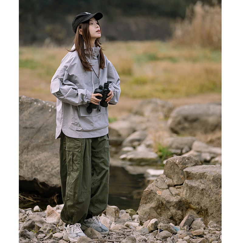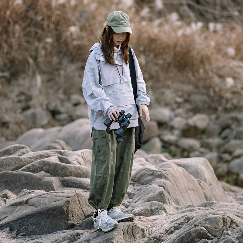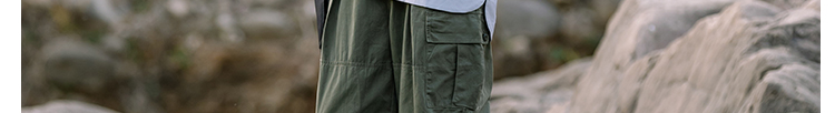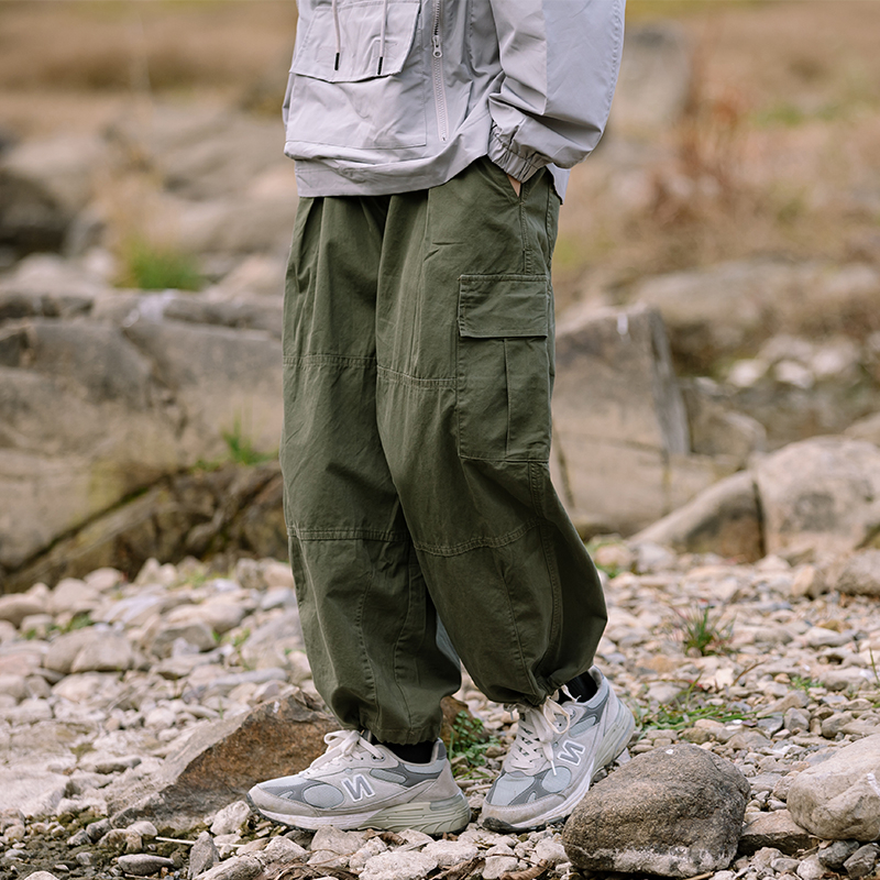 日系多口袋薄款休閒長褲男女款同款潮牌軍綠色寬鬆直筒抽繩工裝褲