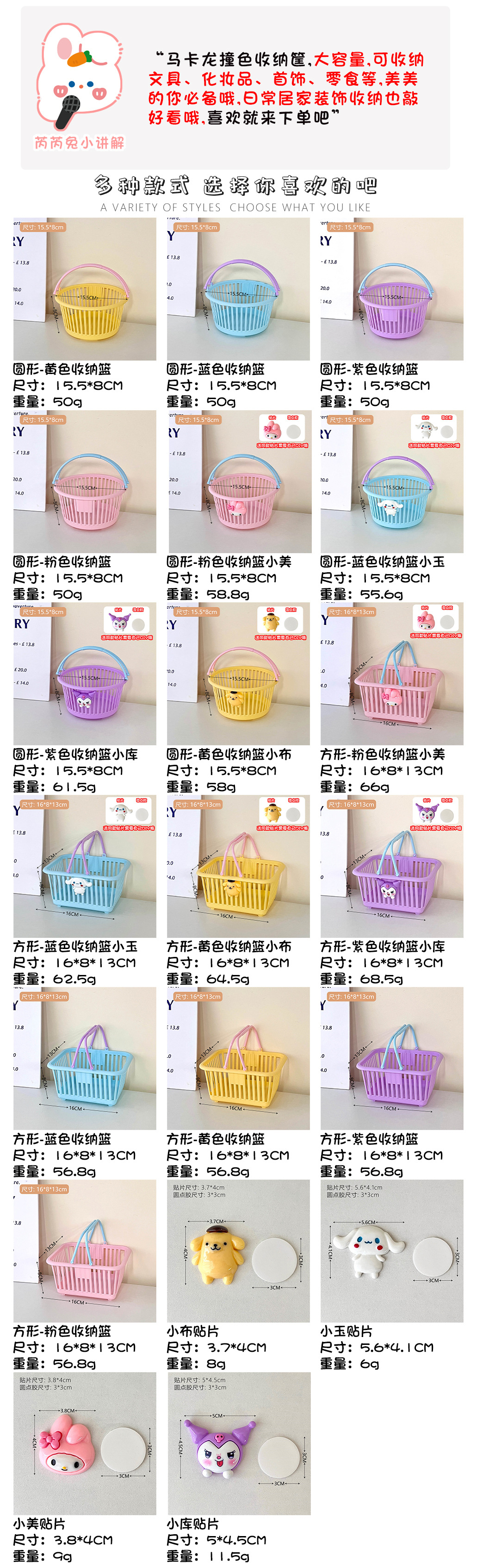 颜色 1#圆形-粉色收纳篮,2#圆形-蓝色收纳篮,3#圆形-黄色收纳篮,4#圆形-紫色收纳篮,5#方形-粉色收纳篮,6#方形-蓝色收纳篮,7#方形-黄色收纳篮,8#方形-紫色收纳篮,9#圆形-粉色收纳篮小美,10#圆形-蓝色收纳篮小玉,11#圆形-黄色收纳篮小布,12#圆形-紫色收纳篮小库,13#方形-粉色收纳篮小美,14#方形-蓝色收纳篮小玉,15#方形-黄色收纳篮小布,16#方形-紫色收纳篮小库,17#小美贴片,18#小玉贴片,19#小布贴片,20#小库贴片