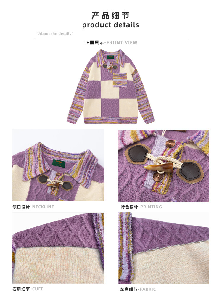 Light Blue定製復古拼接撞色格子毛衣女2023秋季日系慵懶風針織衫