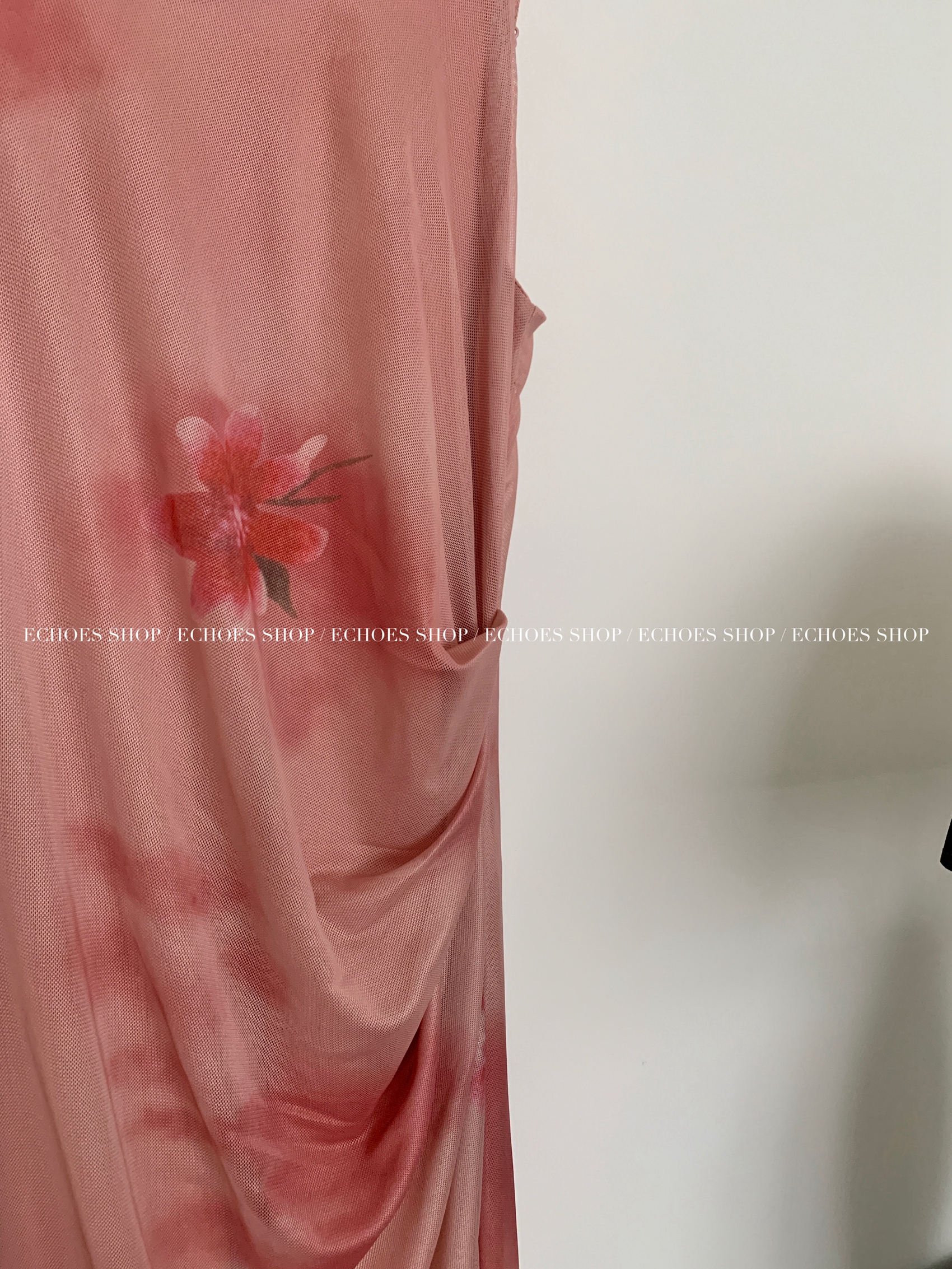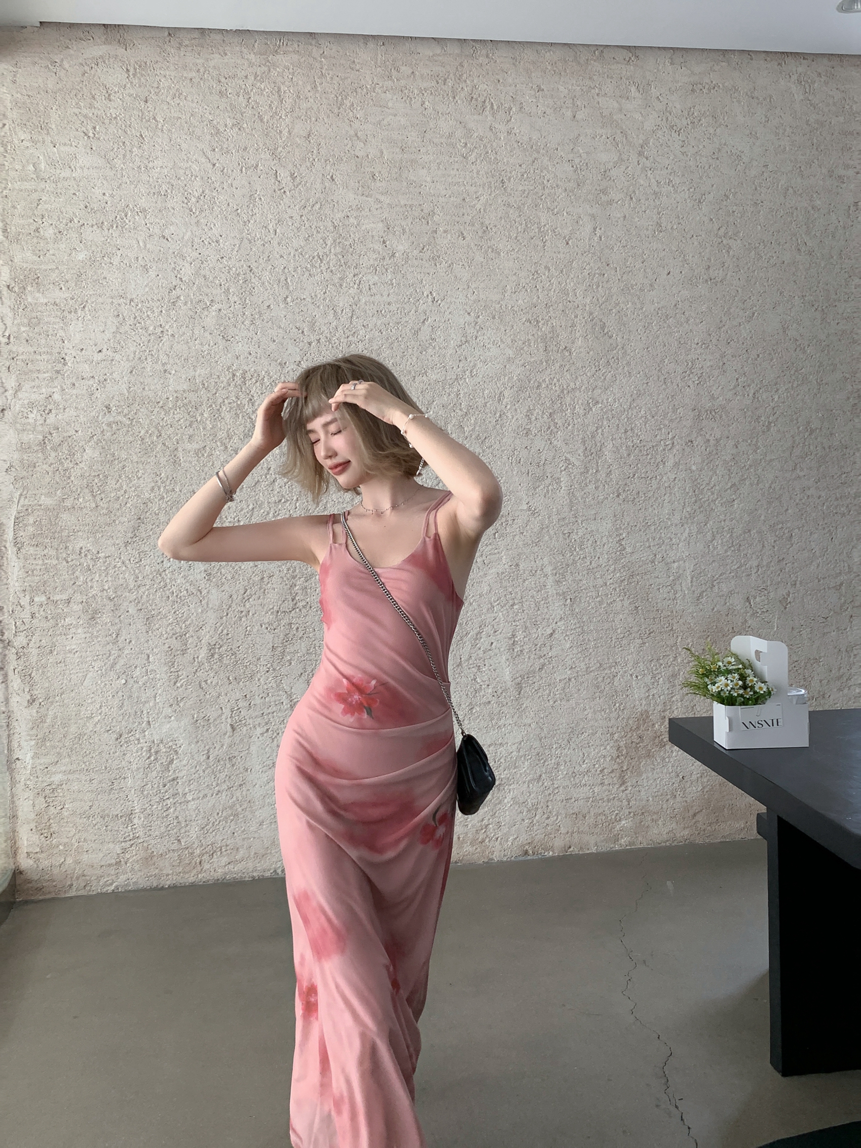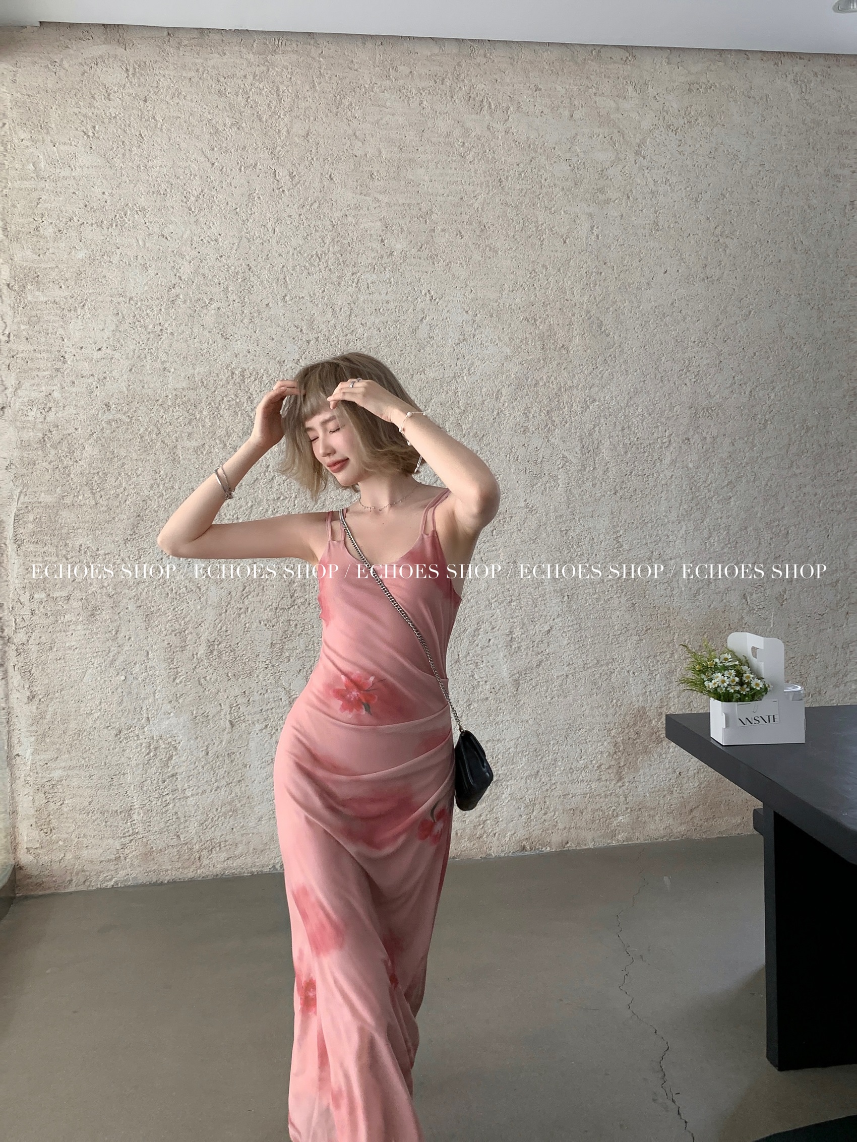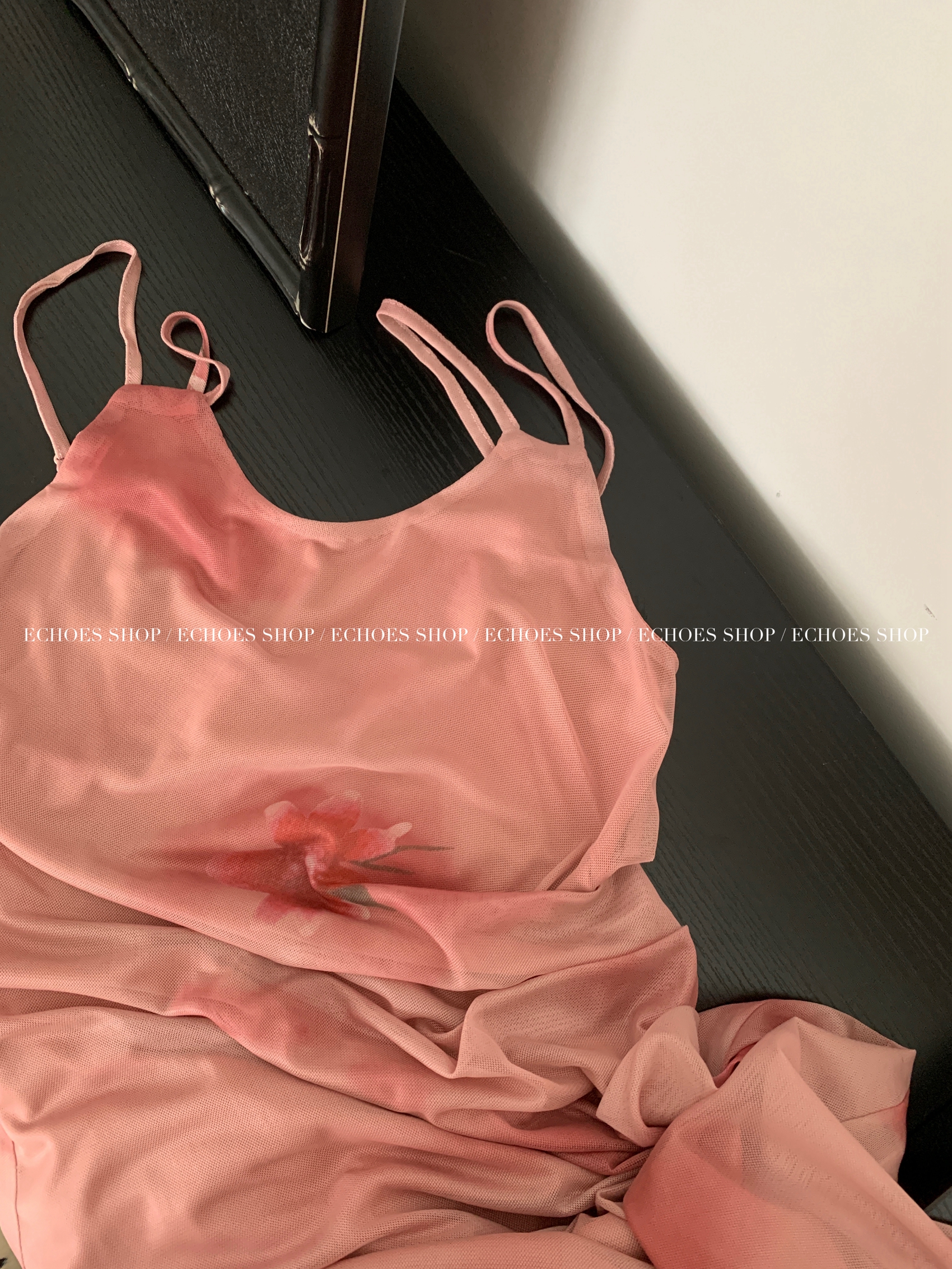Echoes 人間水蜜桃 雙層網紗吊帶洋裝氣質甜美乾枯玫瑰長裙女夏