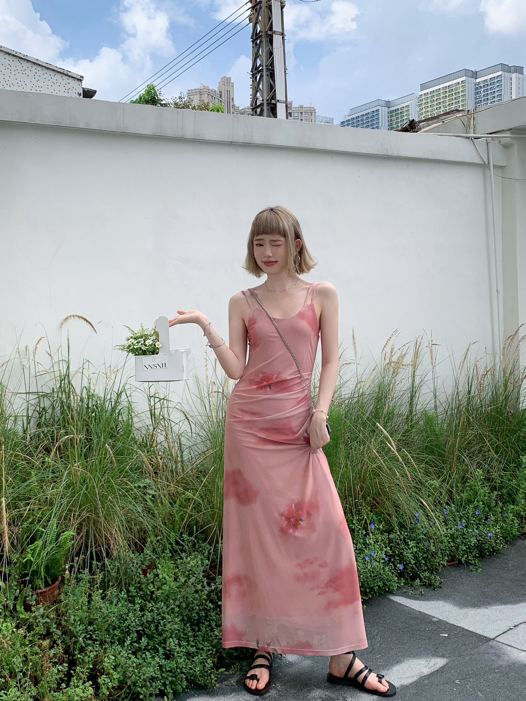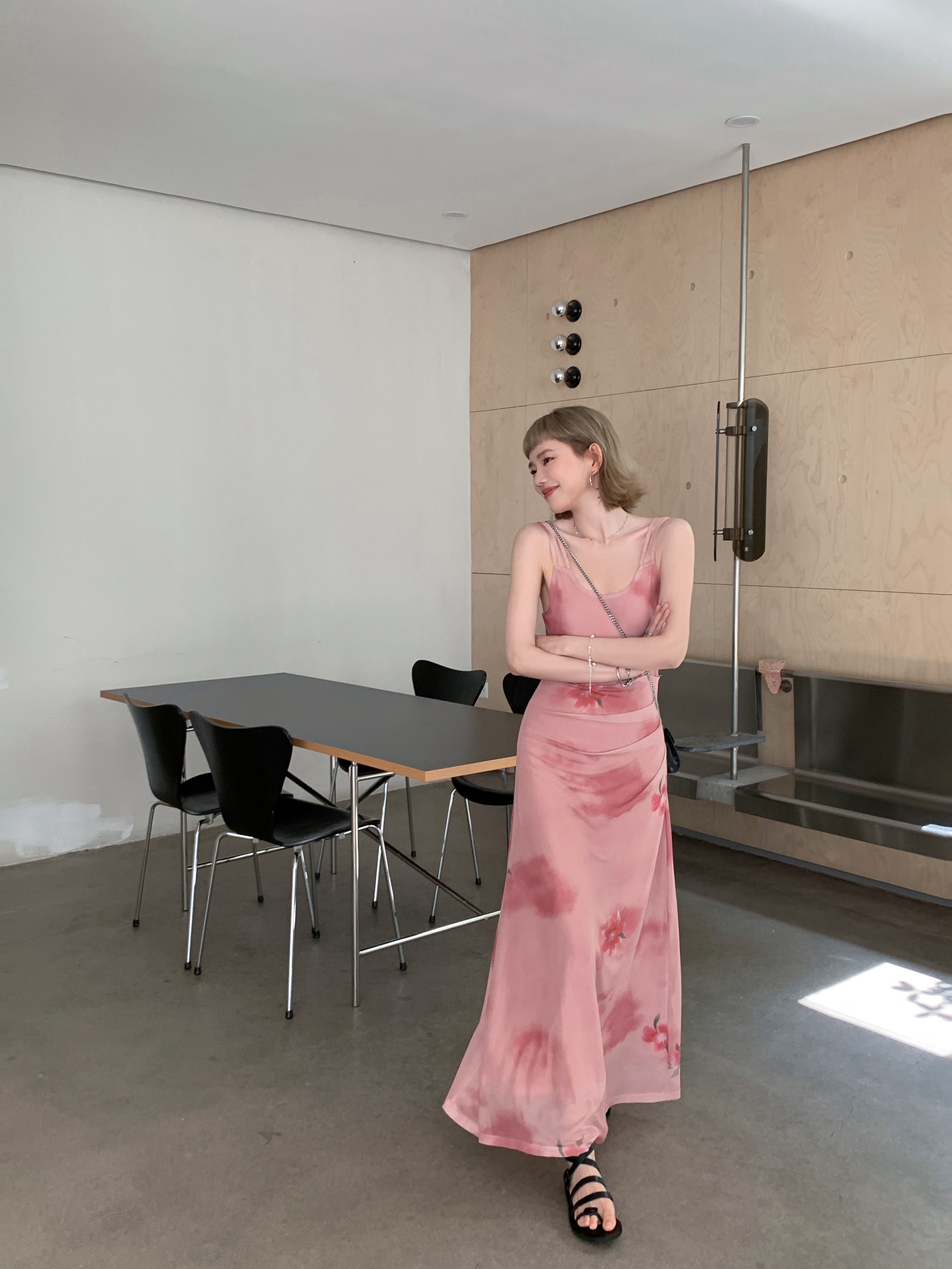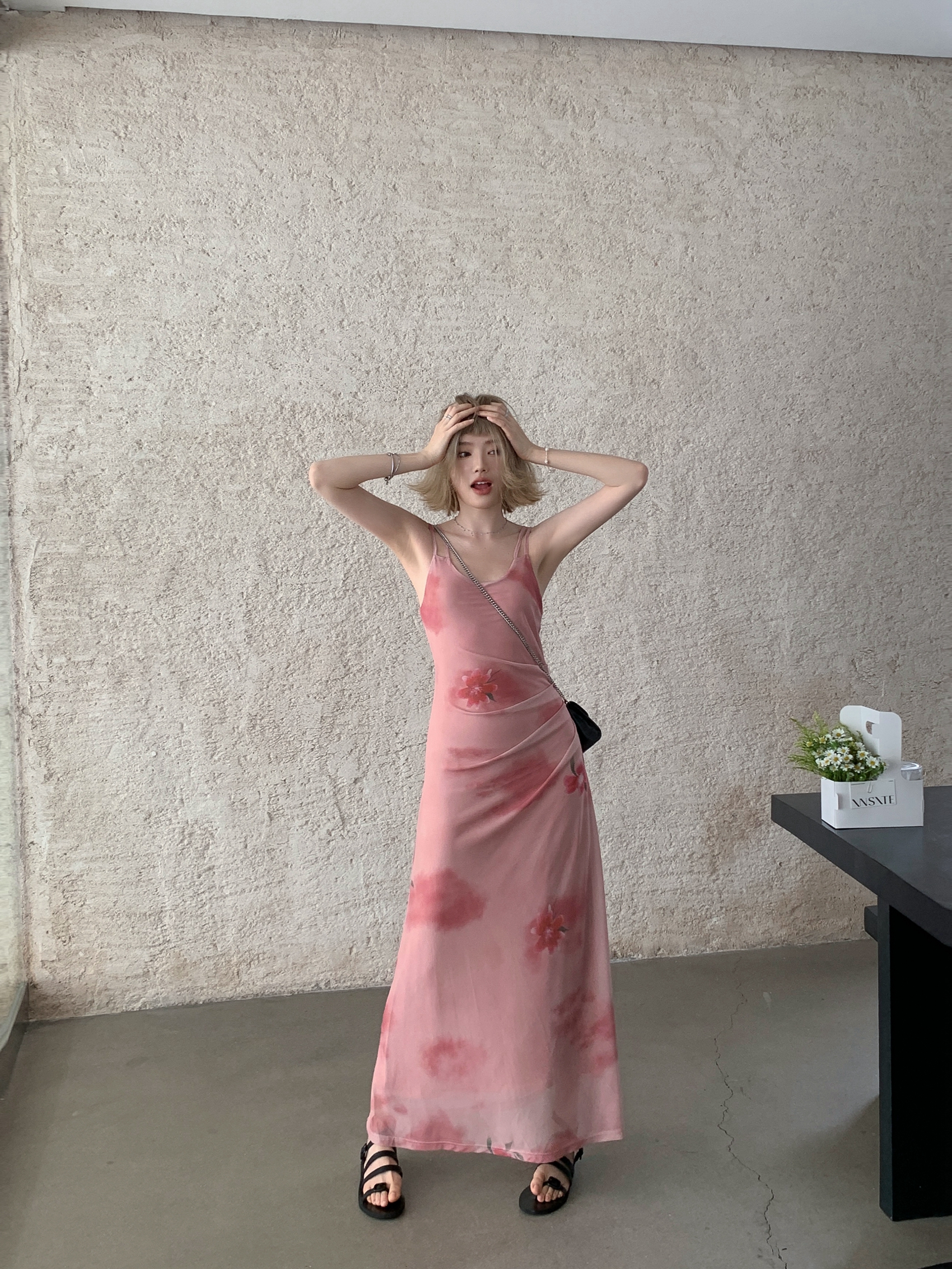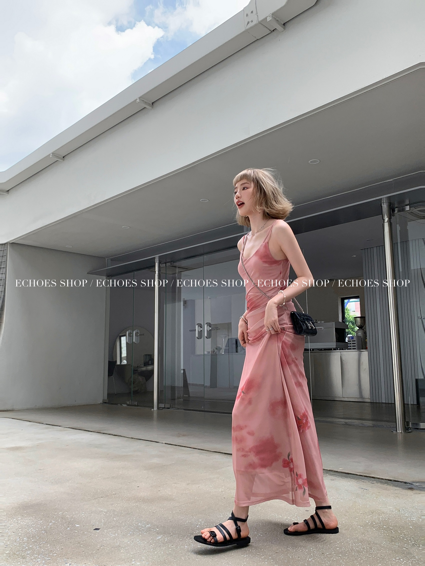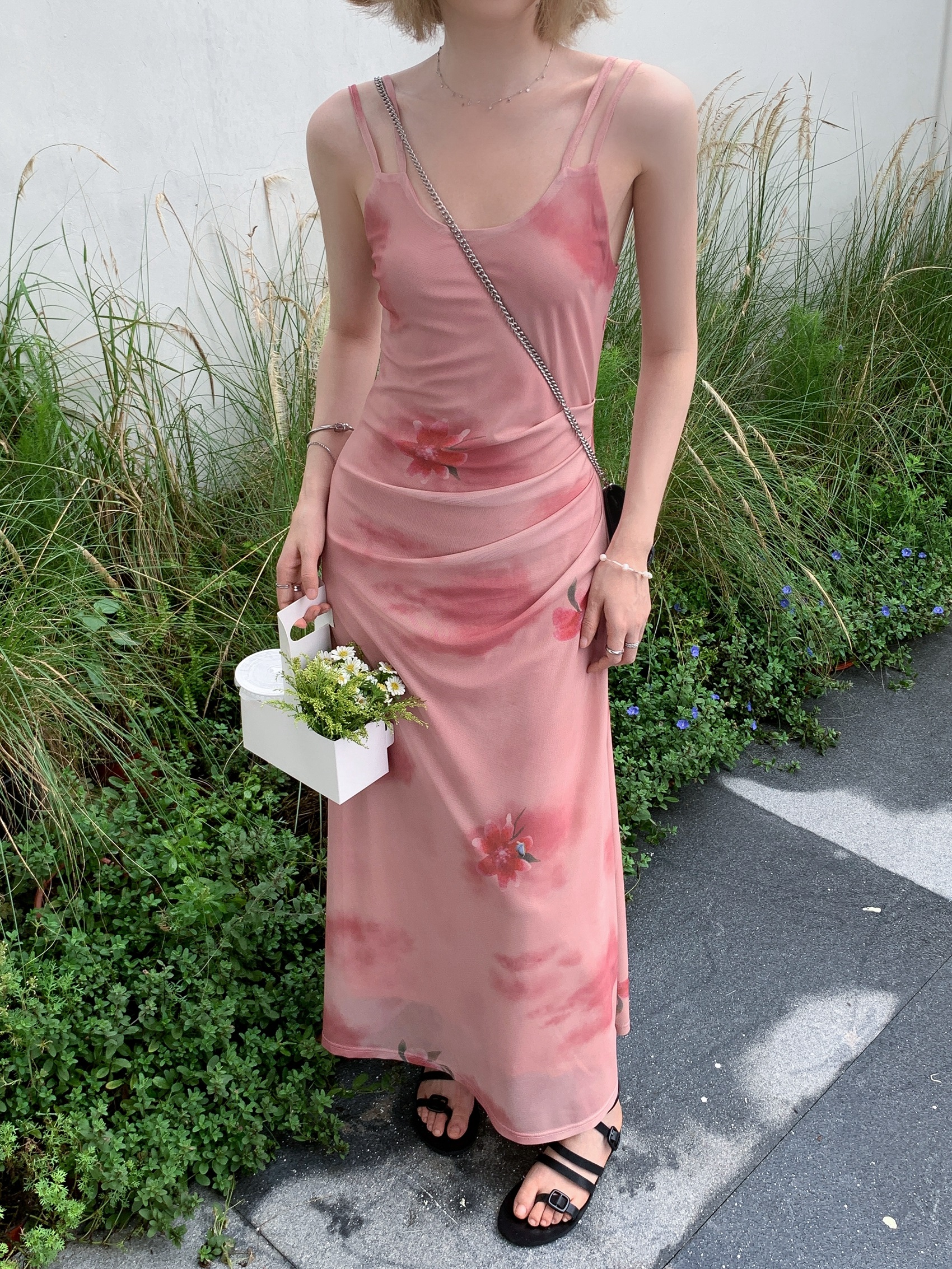 Echoes 人間水蜜桃 雙層網紗吊帶洋裝氣質甜美乾枯玫瑰長裙女夏