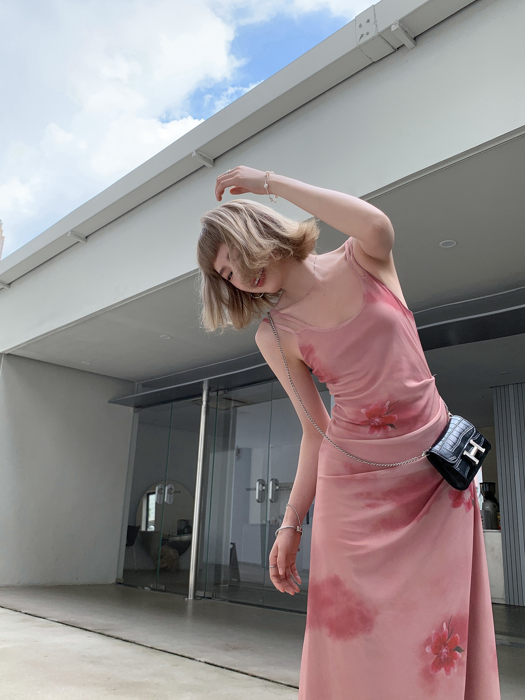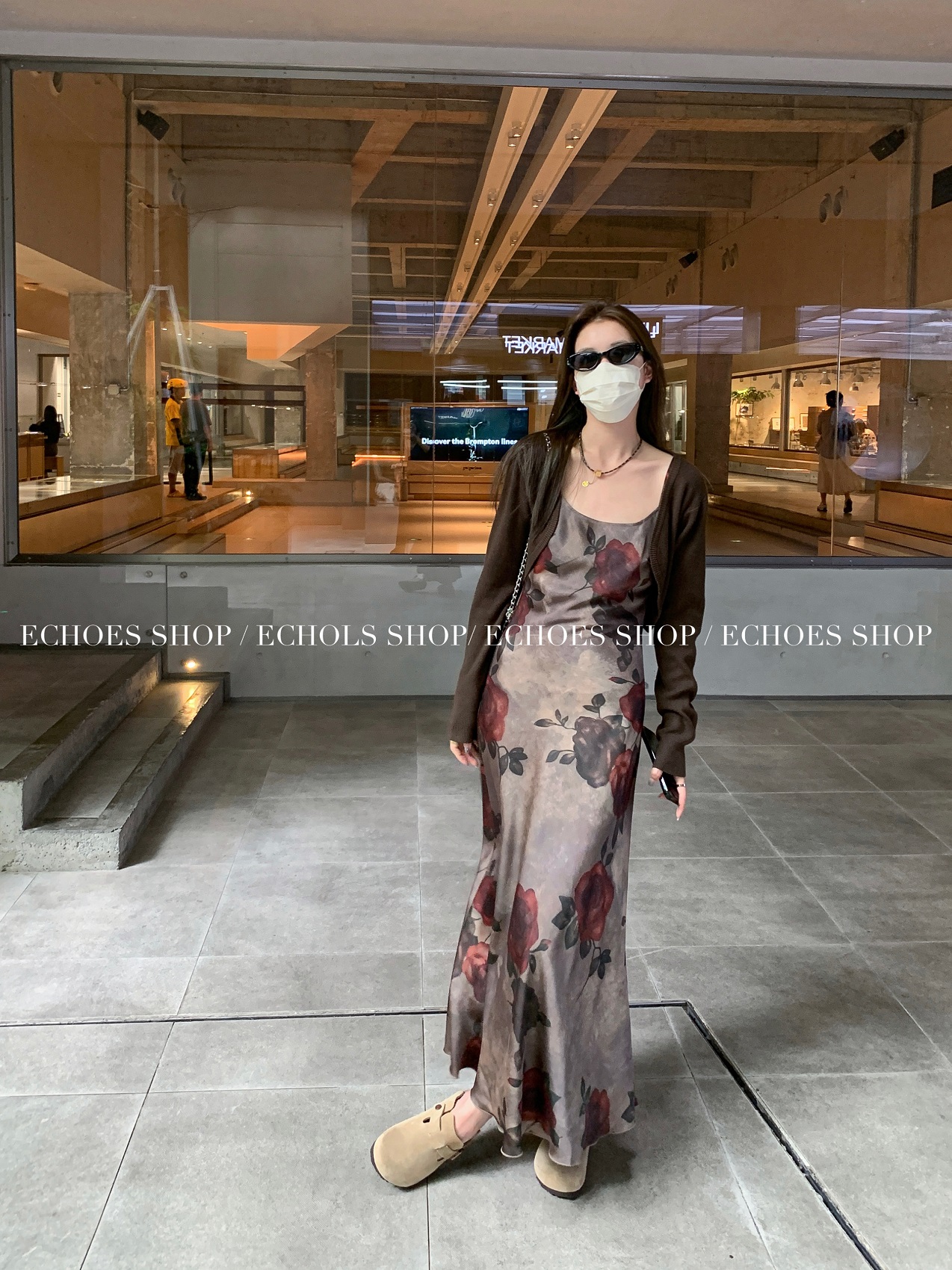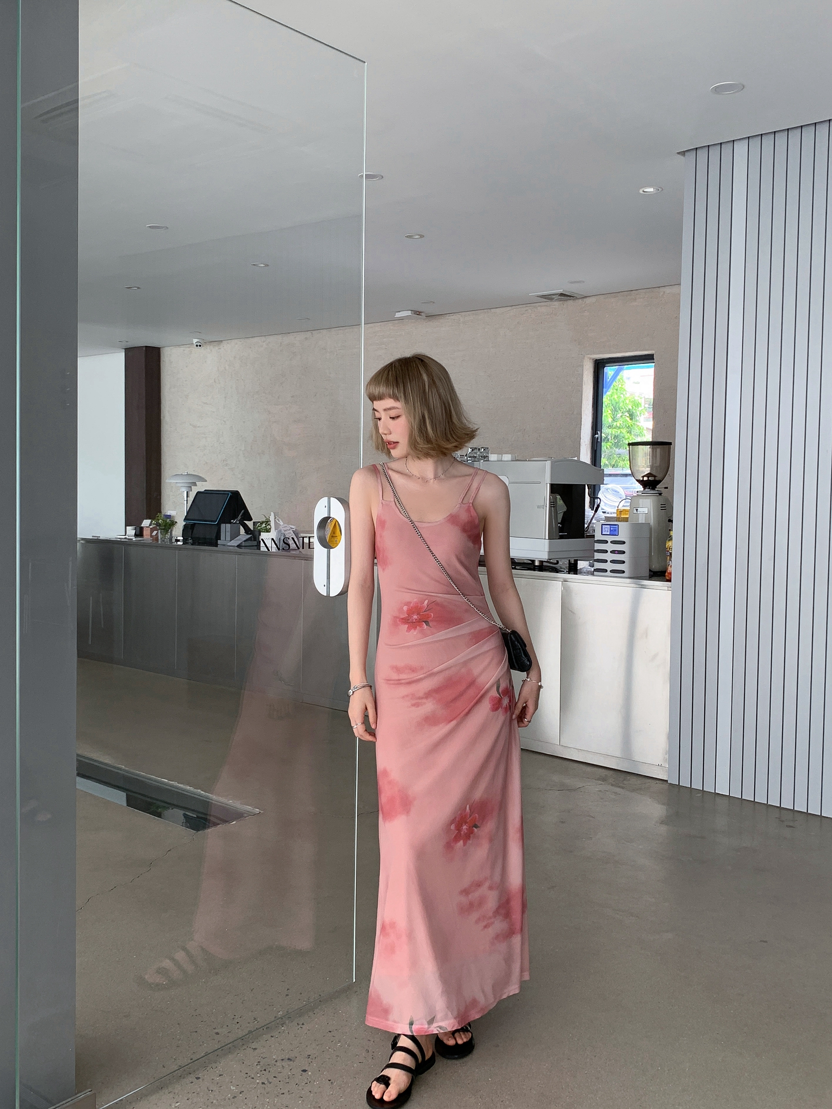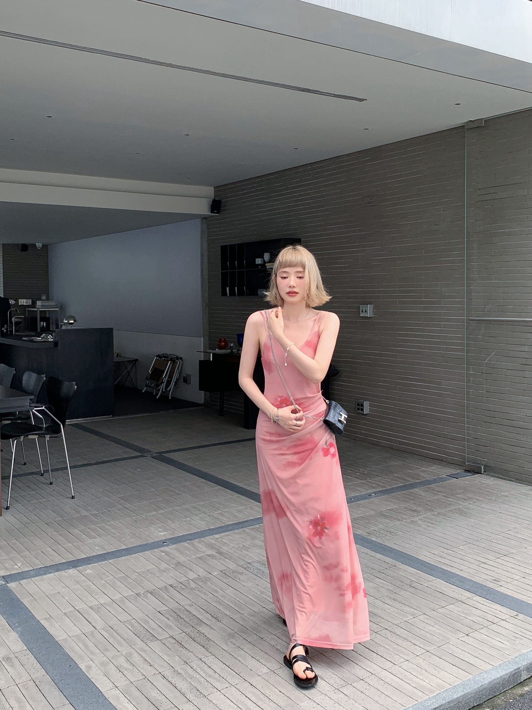 Echoes 人間水蜜桃 雙層網紗吊帶洋裝氣質甜美乾枯玫瑰長裙女夏