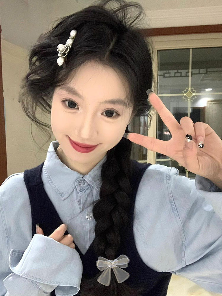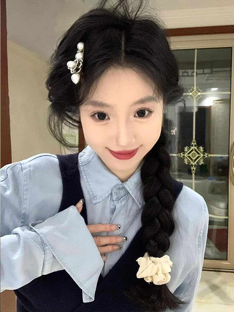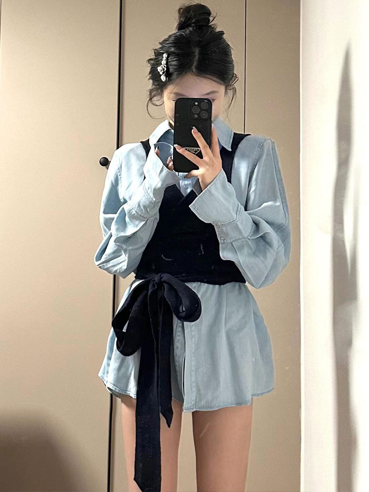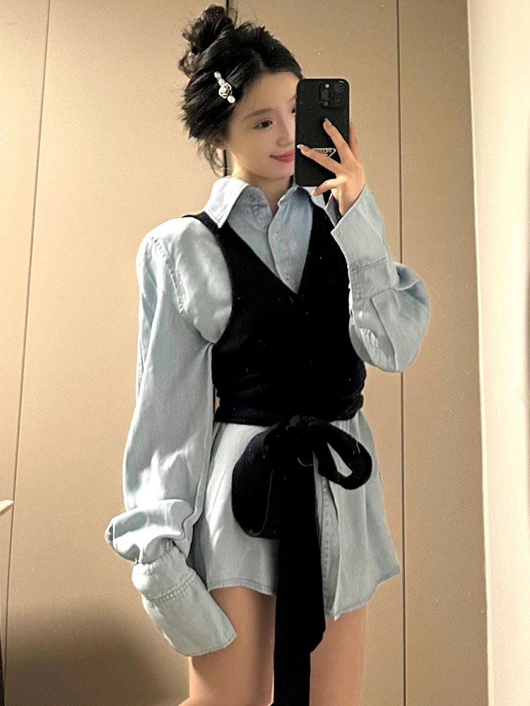 法式設計感柔軟氣質牛仔襯衫女春夏新款疊穿小眾綁帶背心馬甲套裝