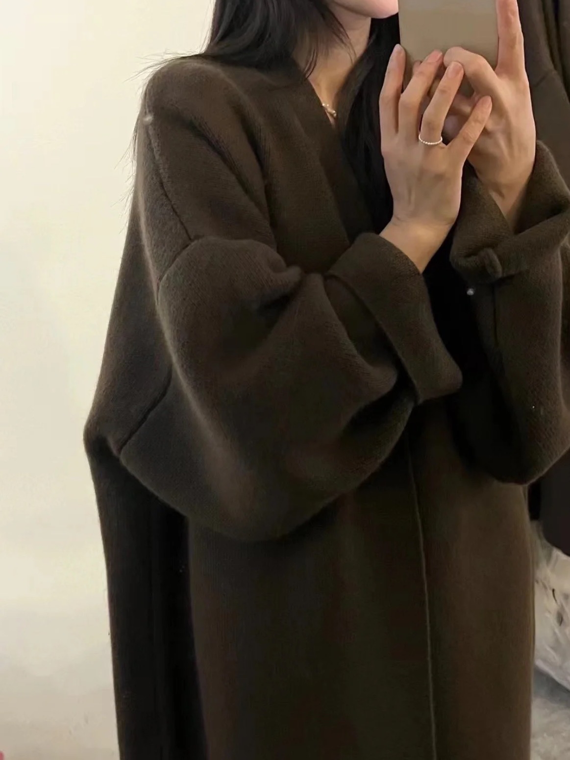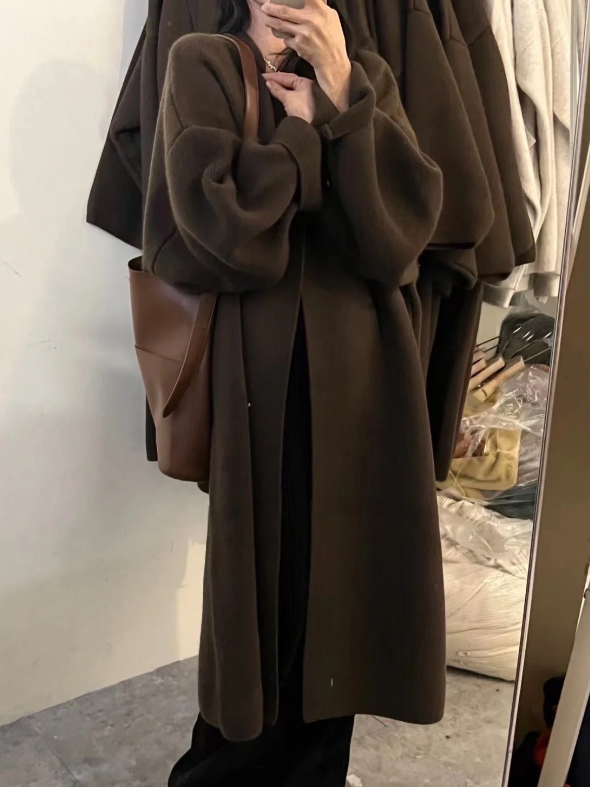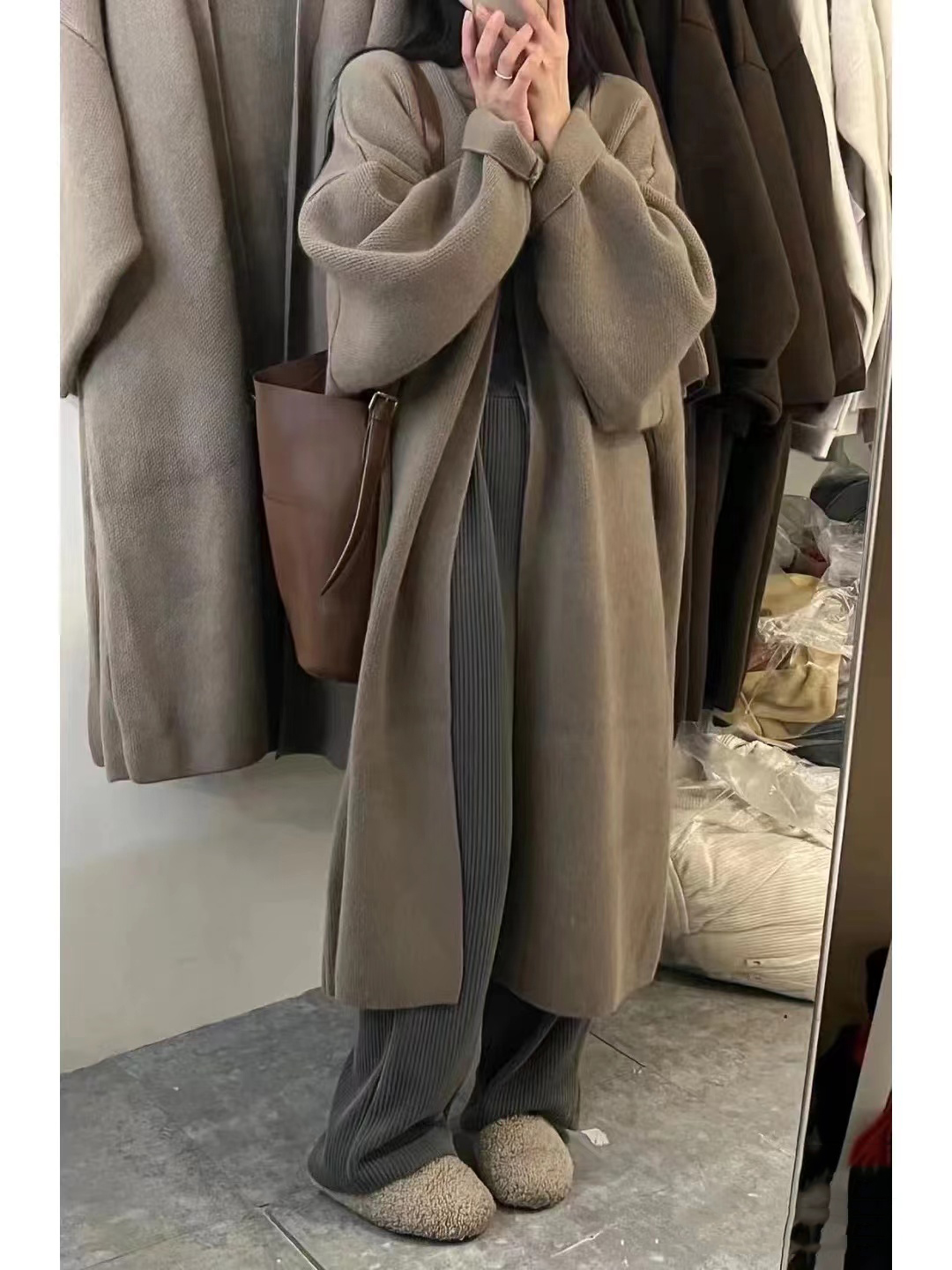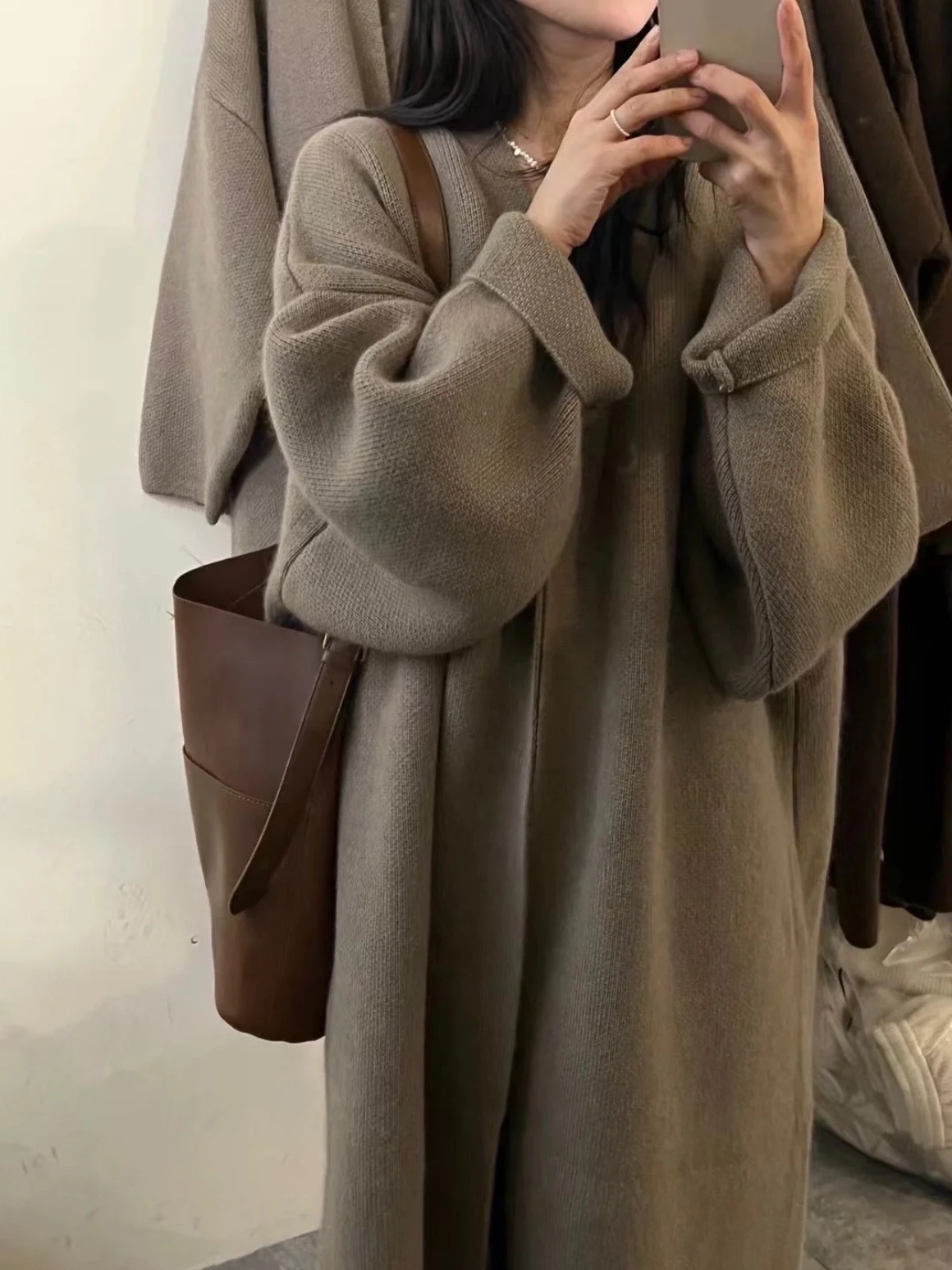 高級感針織開衫外套女秋冬2023新款過膝中長版慵懶風寬鬆大版毛衣