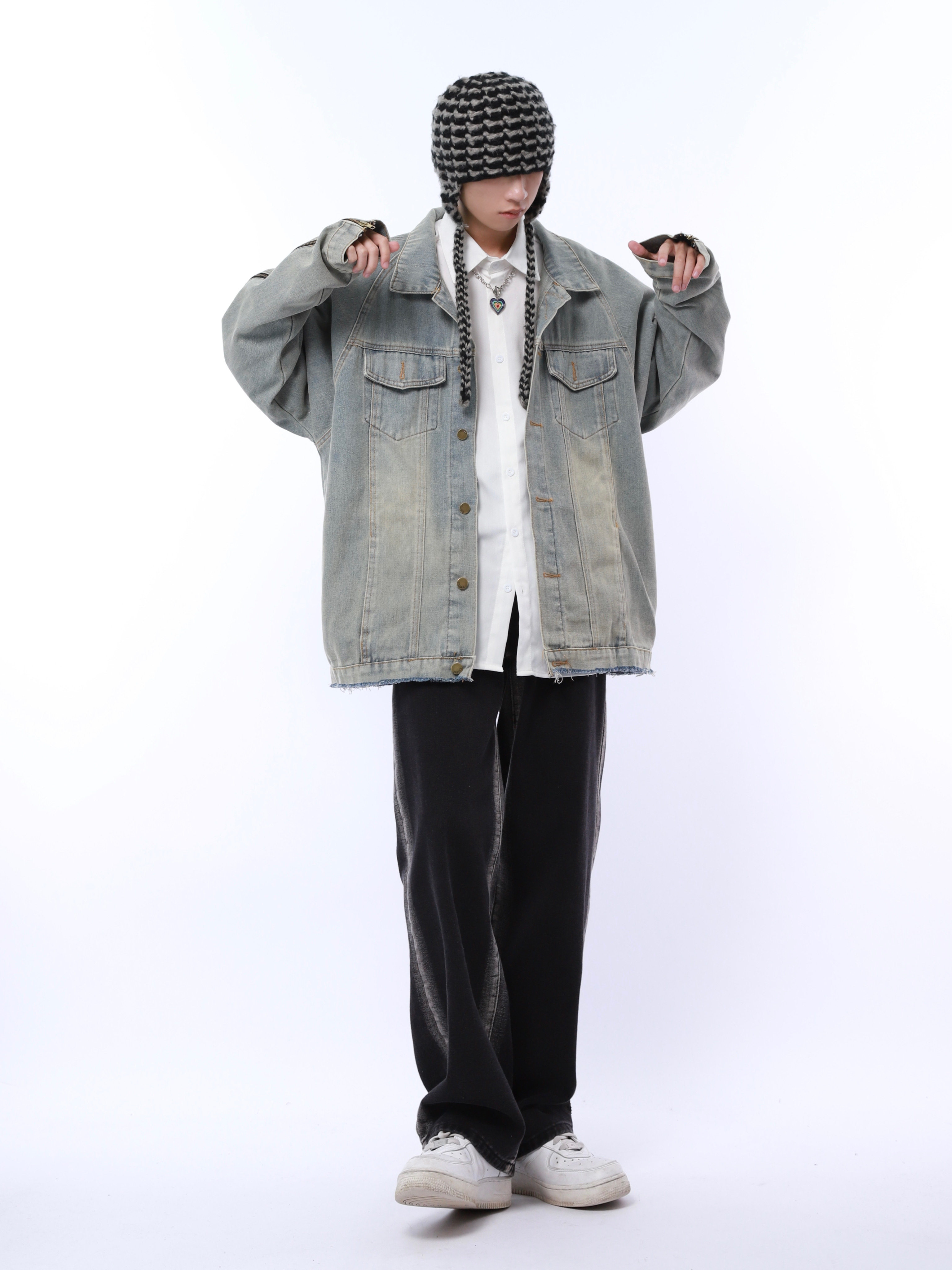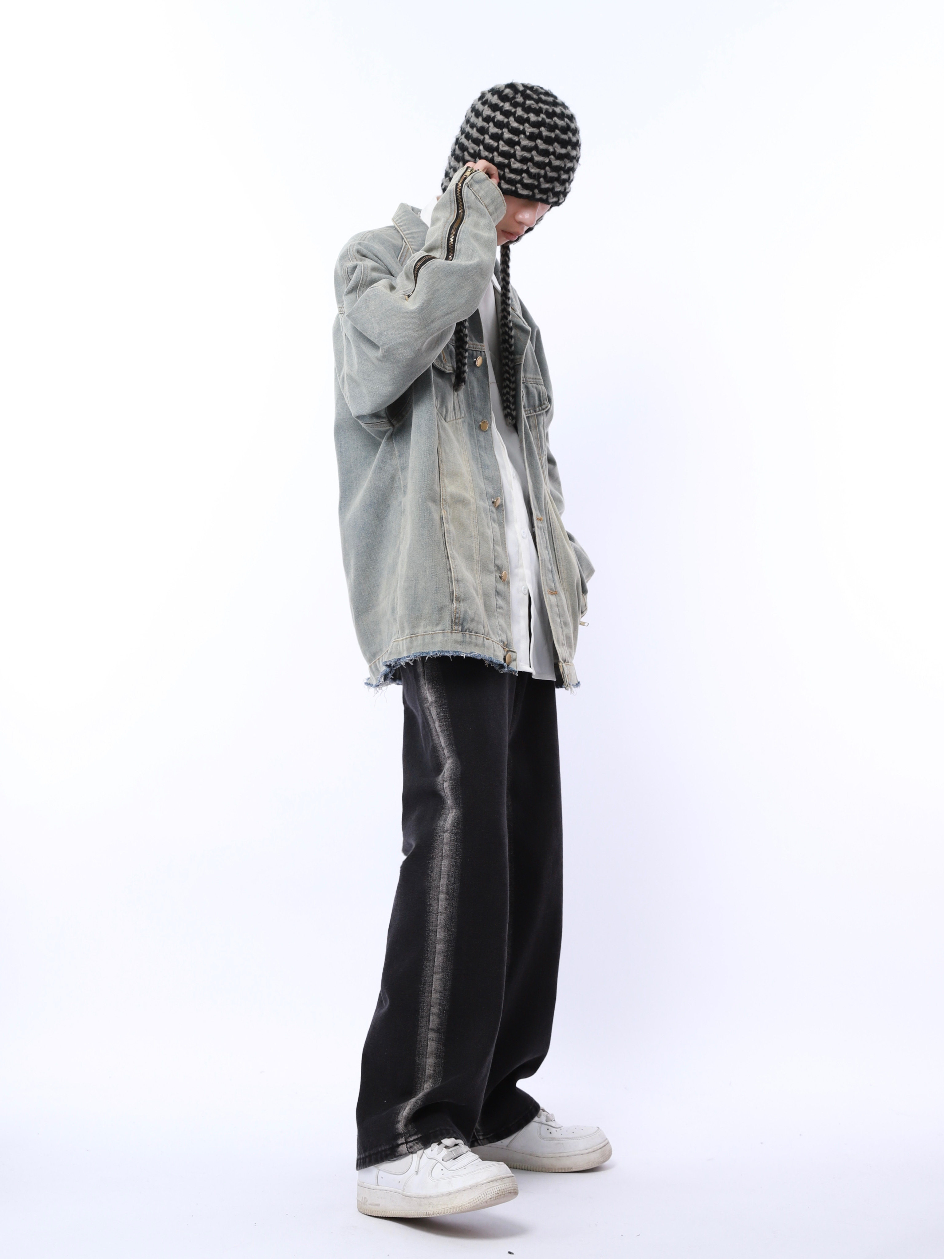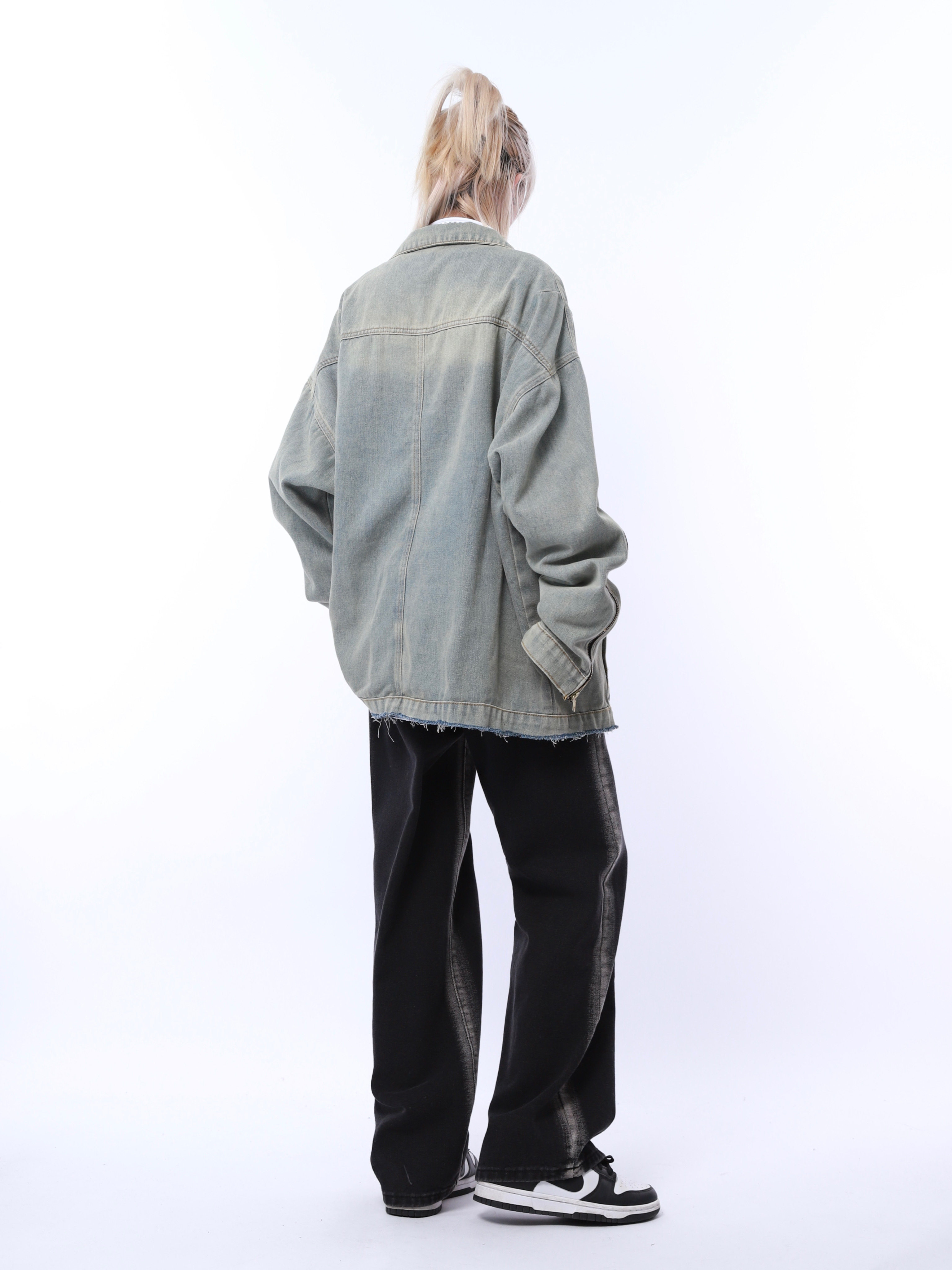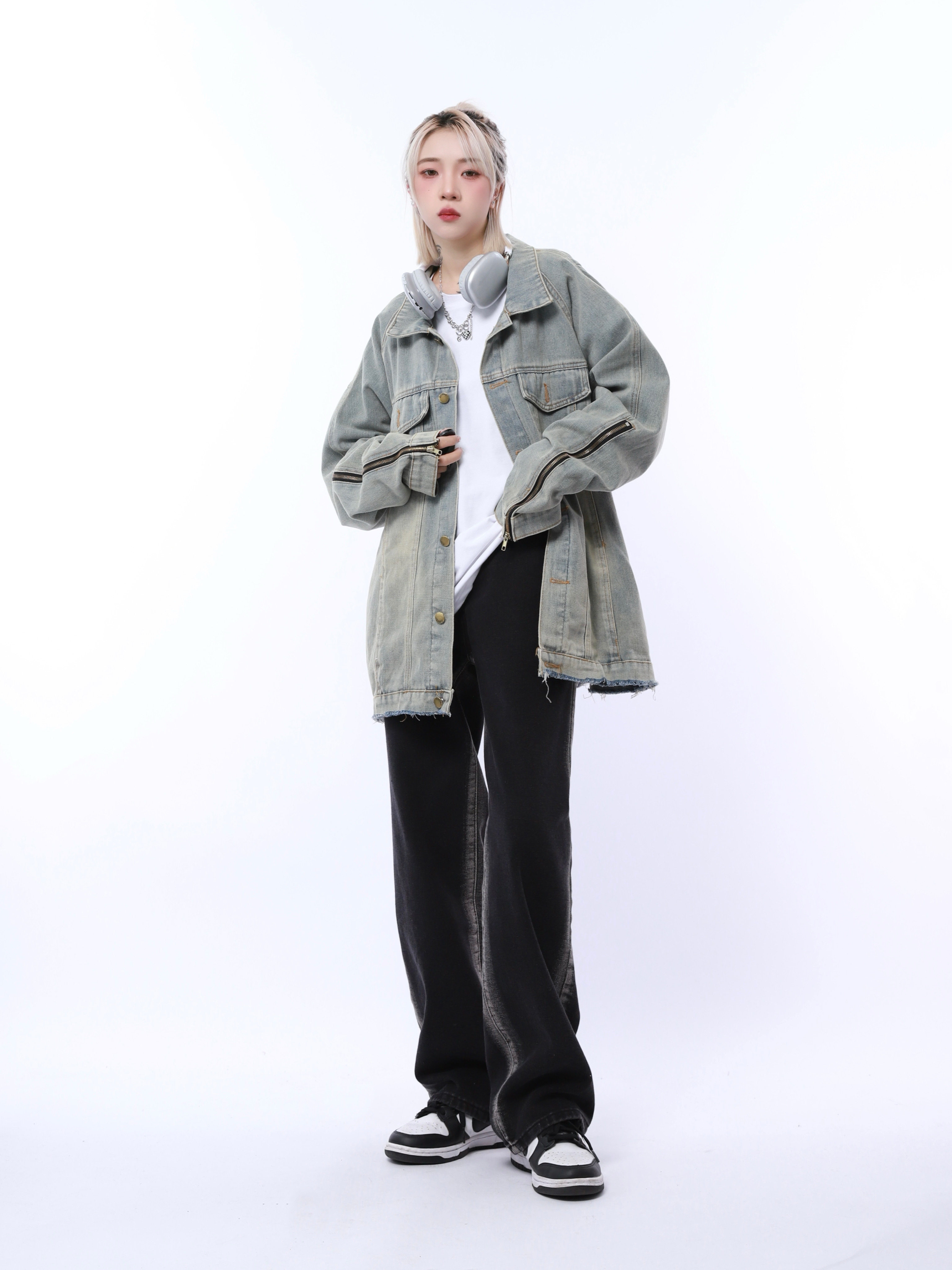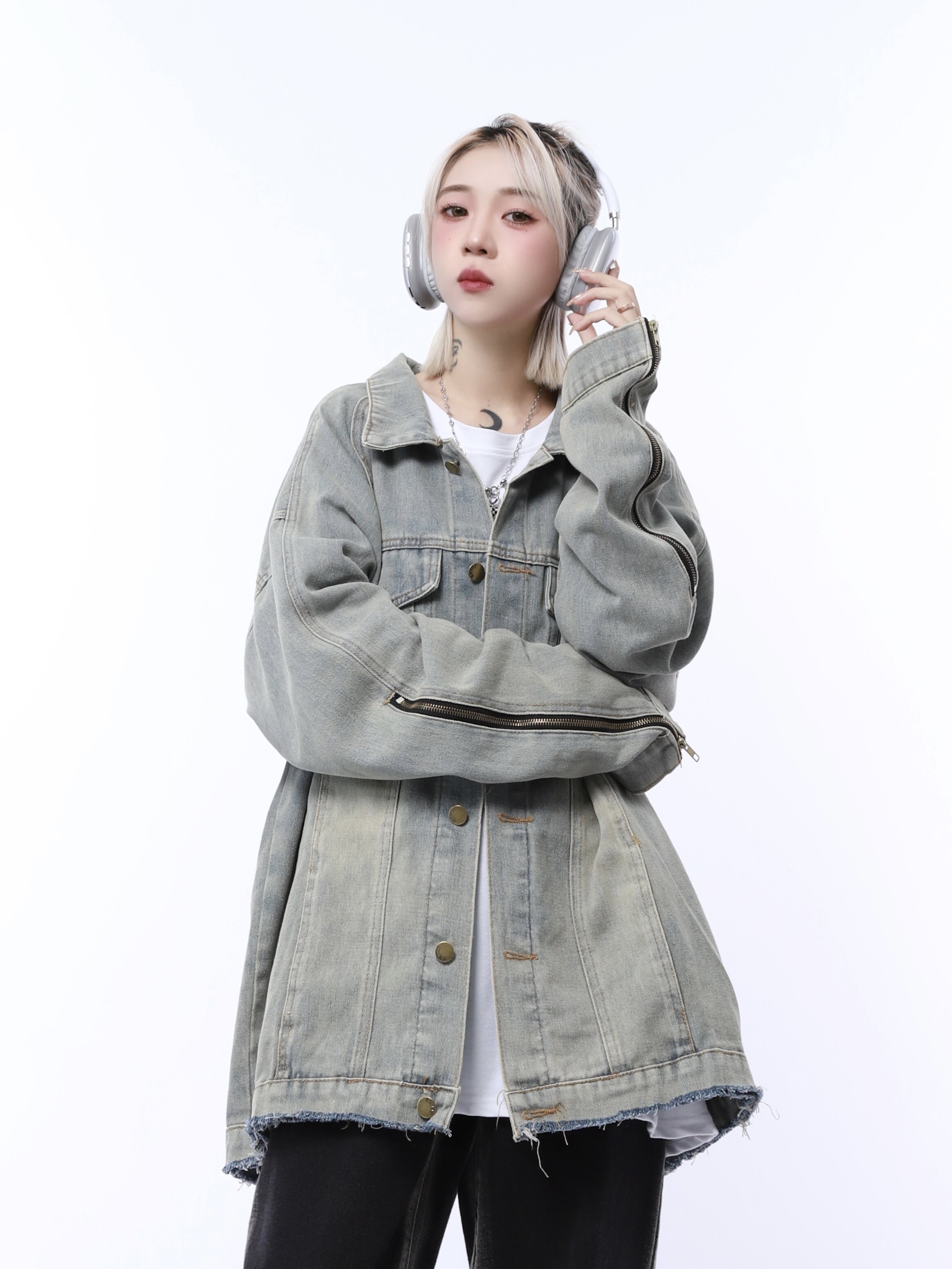 媽個雞媽 ins春秋美式高街拉鍊設計做舊磨破牛仔夾克外套男女寬鬆