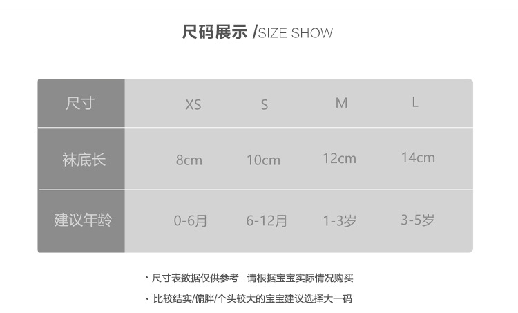 童袜尺码 XS0-6个月,S 6-12个月,M 1-3岁,L 3-5岁