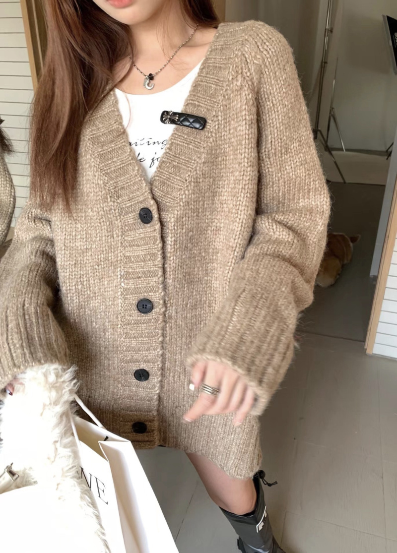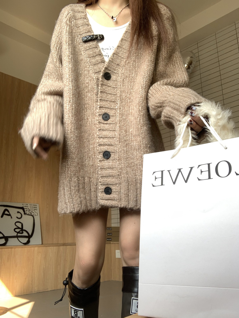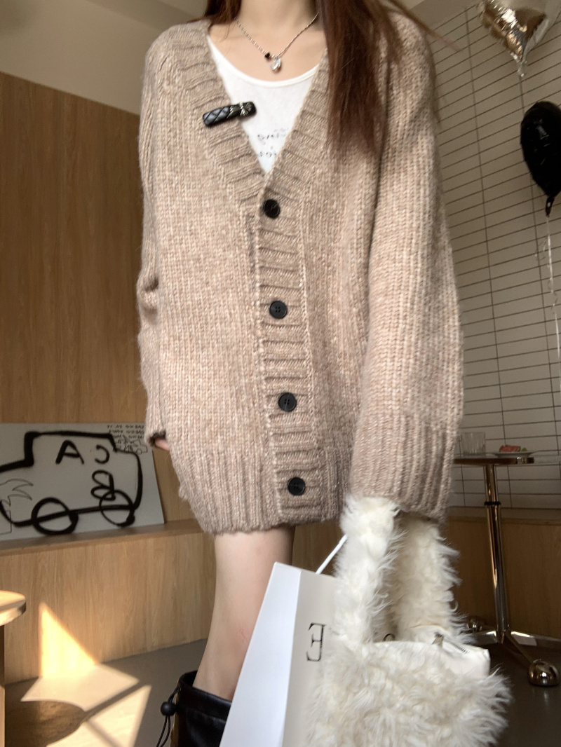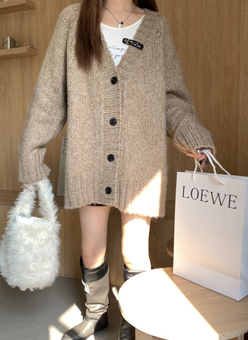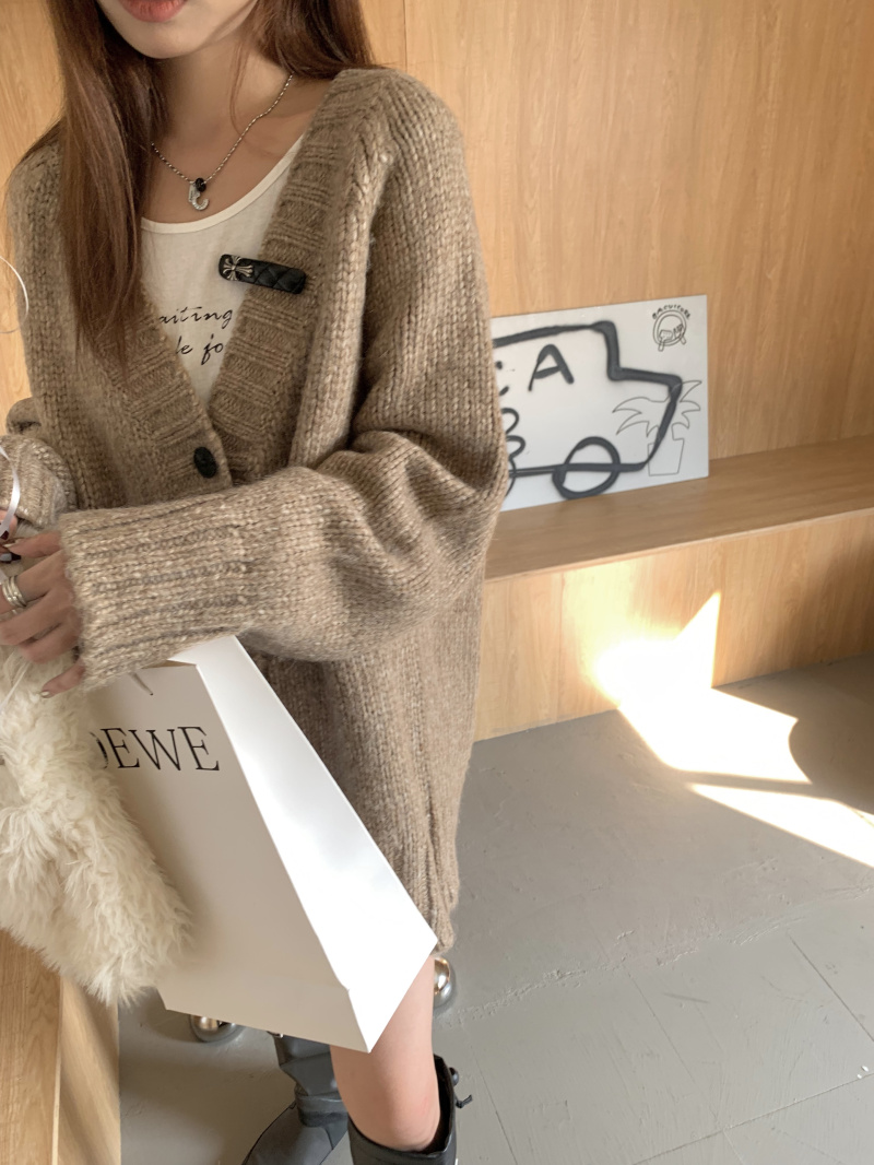 慵懶風V領棕色毛衣外套秋冬女新款春秋疏離感中長版針織開衫上衣