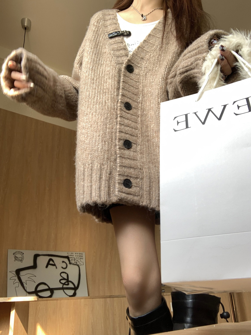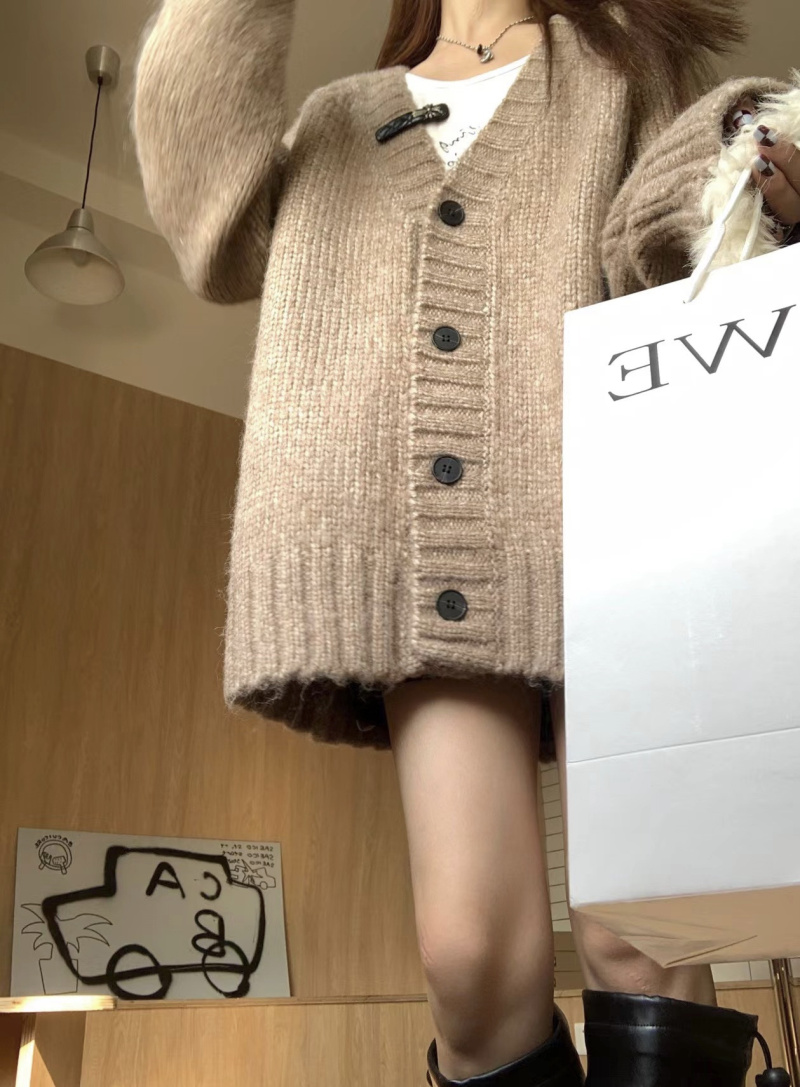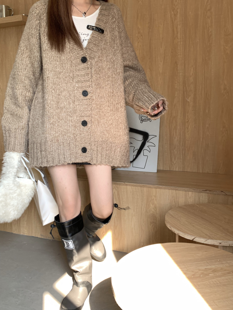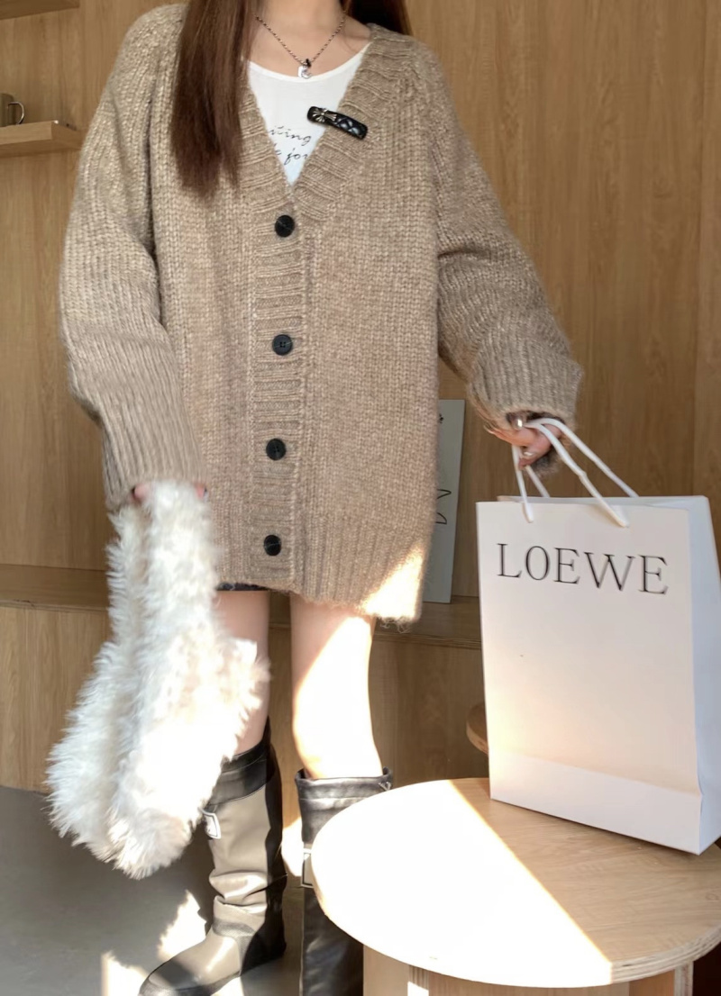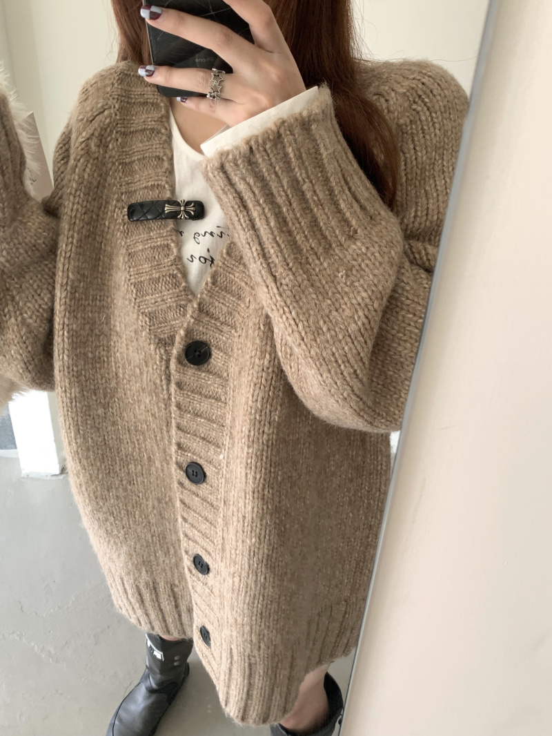 慵懶風V領棕色毛衣外套秋冬女新款春秋疏離感中長版針織開衫上衣