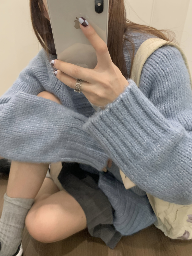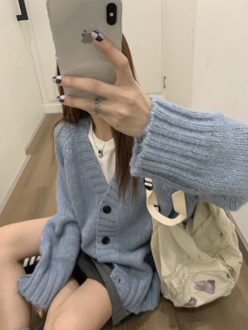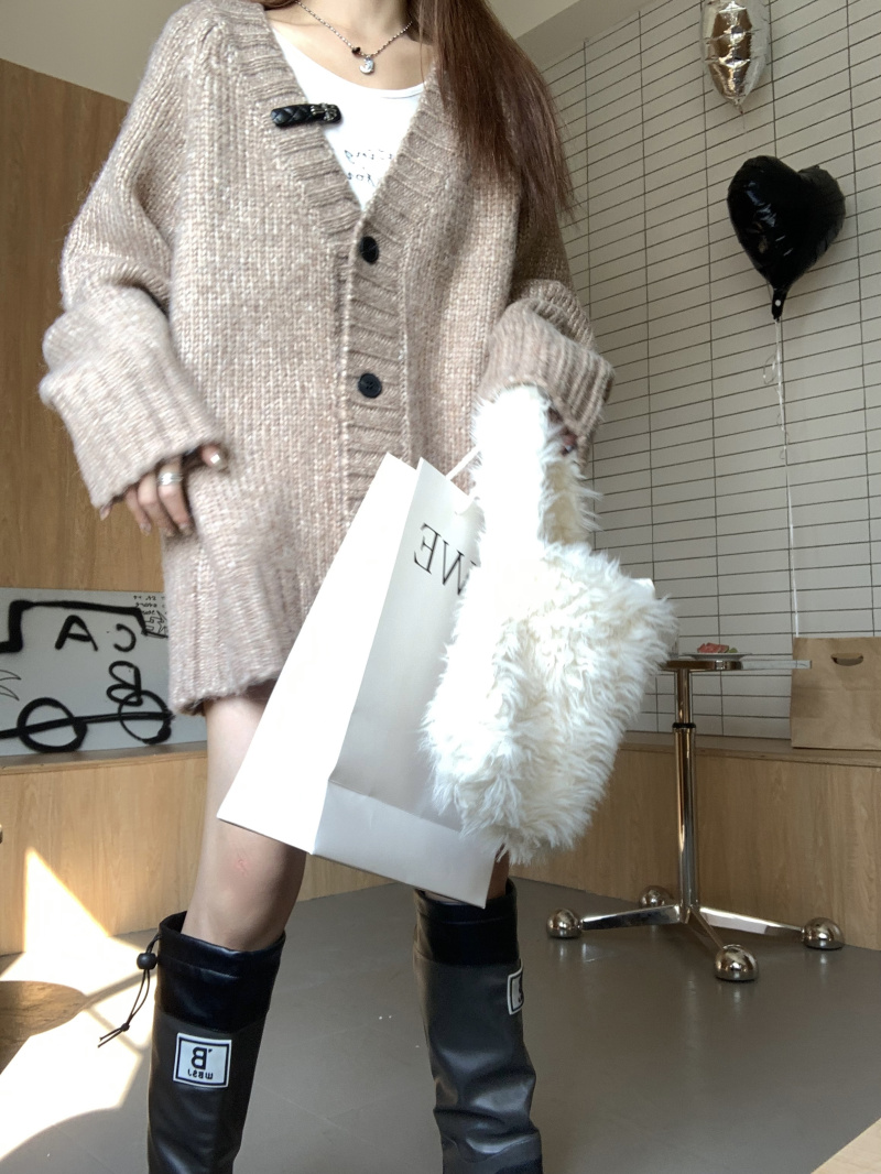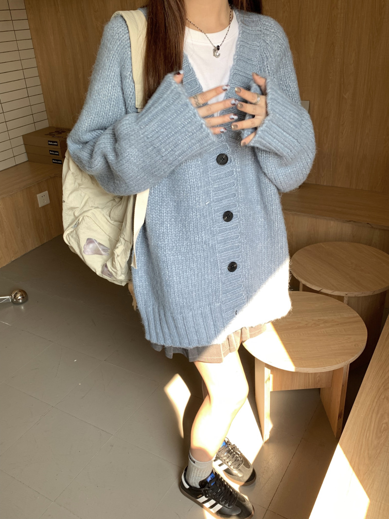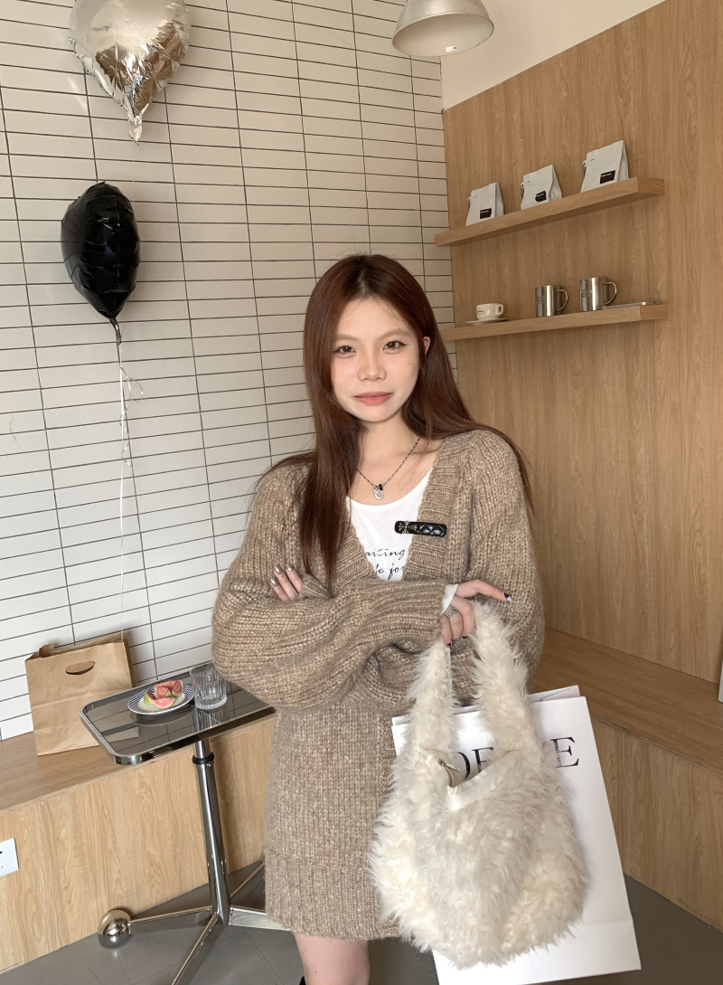 慵懶風V領棕色毛衣外套秋冬女新款春秋疏離感中長版針織開衫上衣