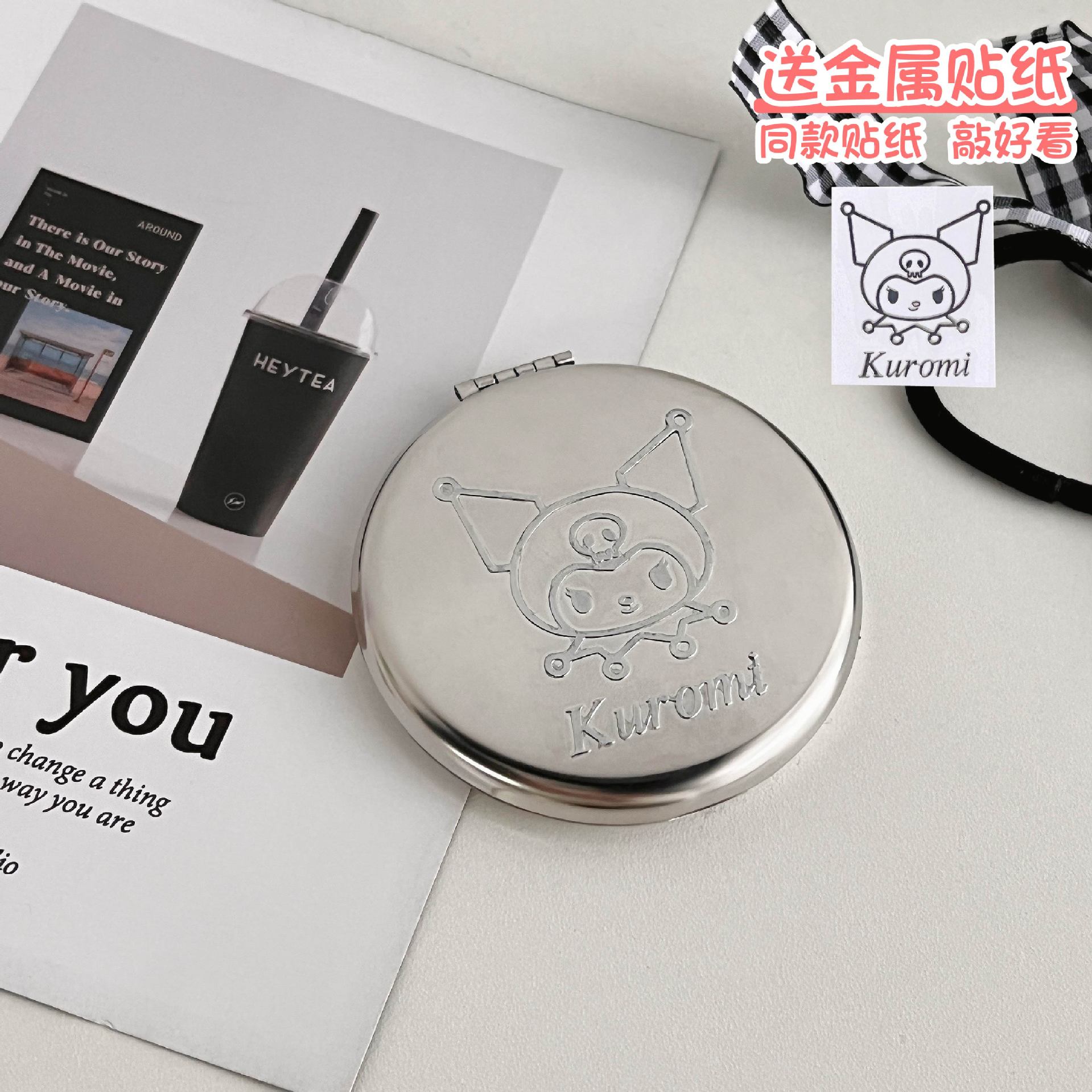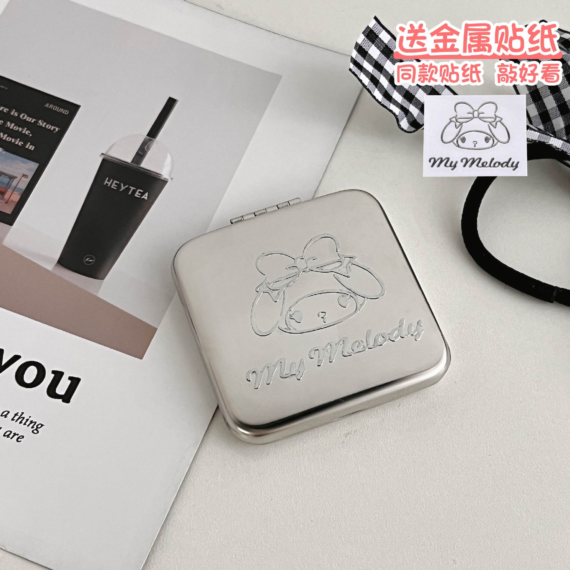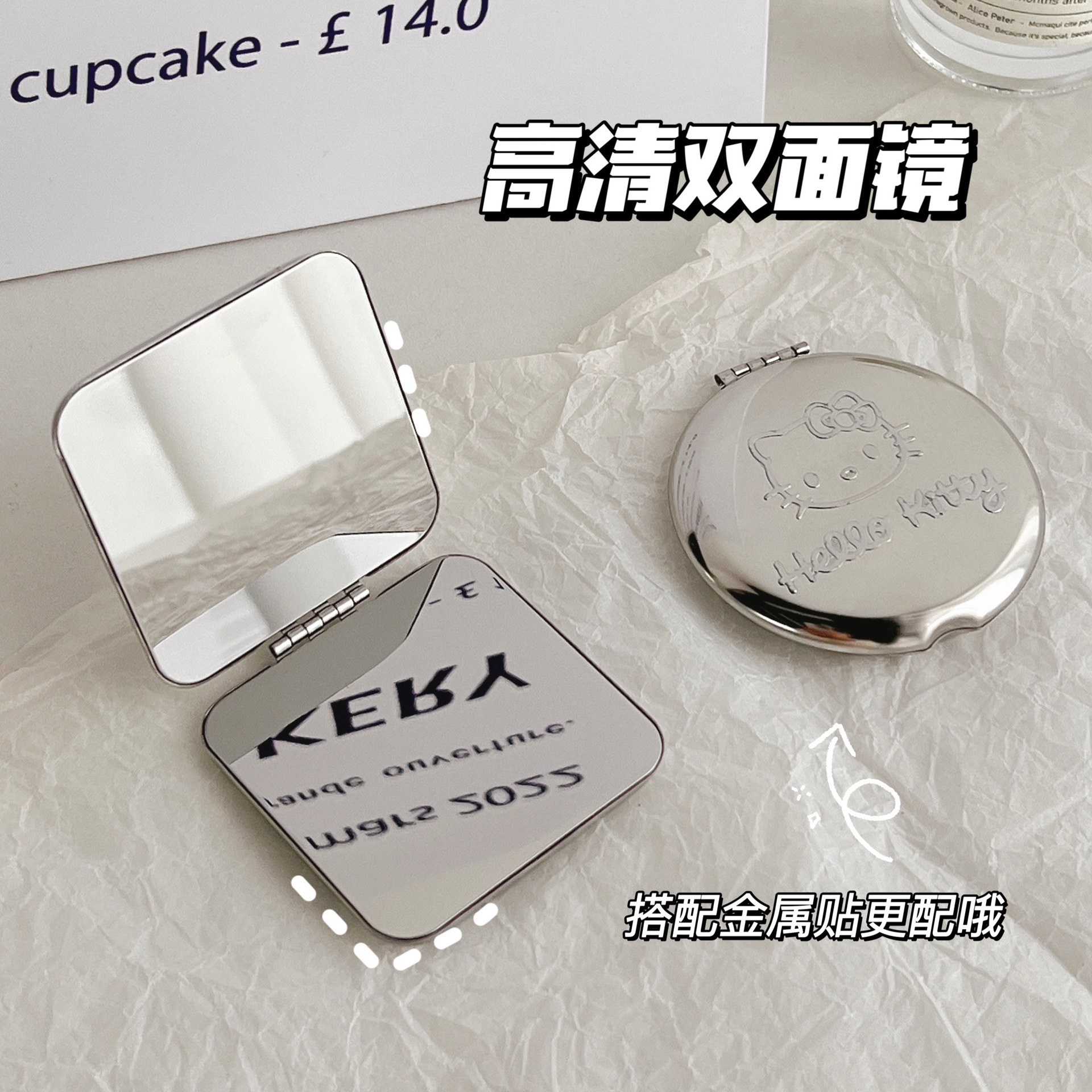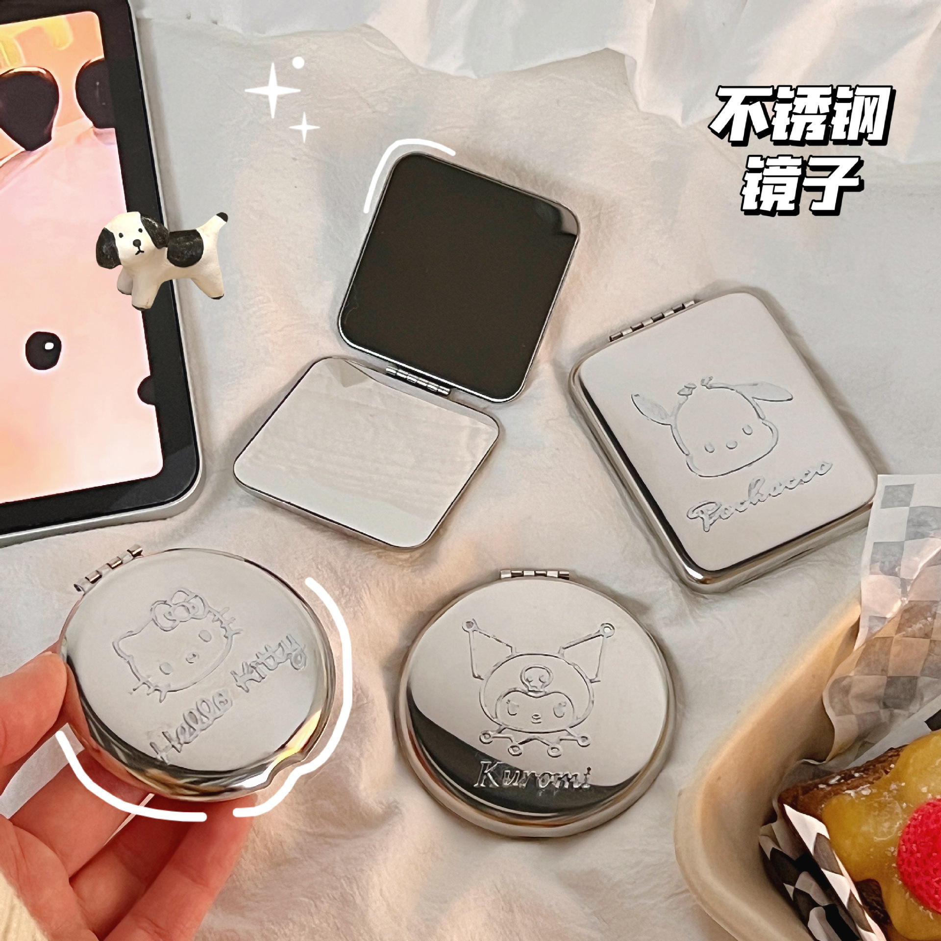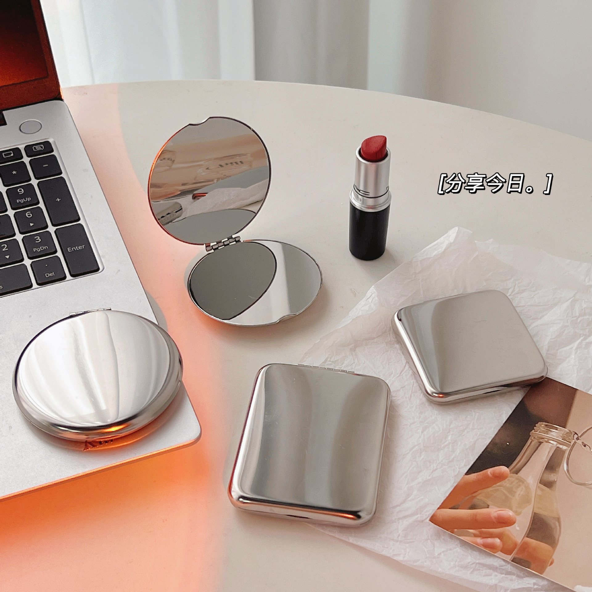 不锈钢化妆镜摔不碎随身小镜子激光logo刻字ins手持双面折叠镜