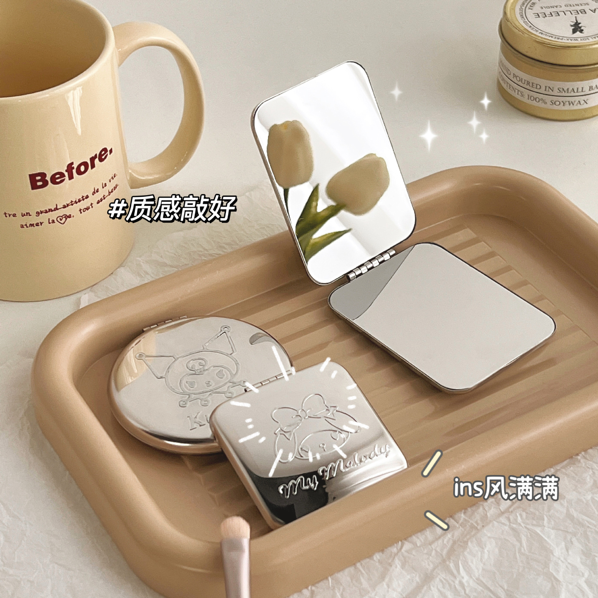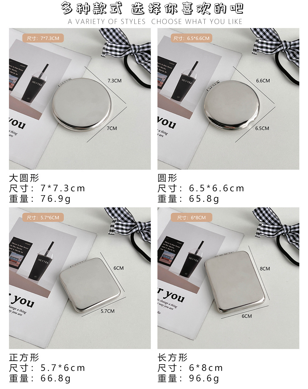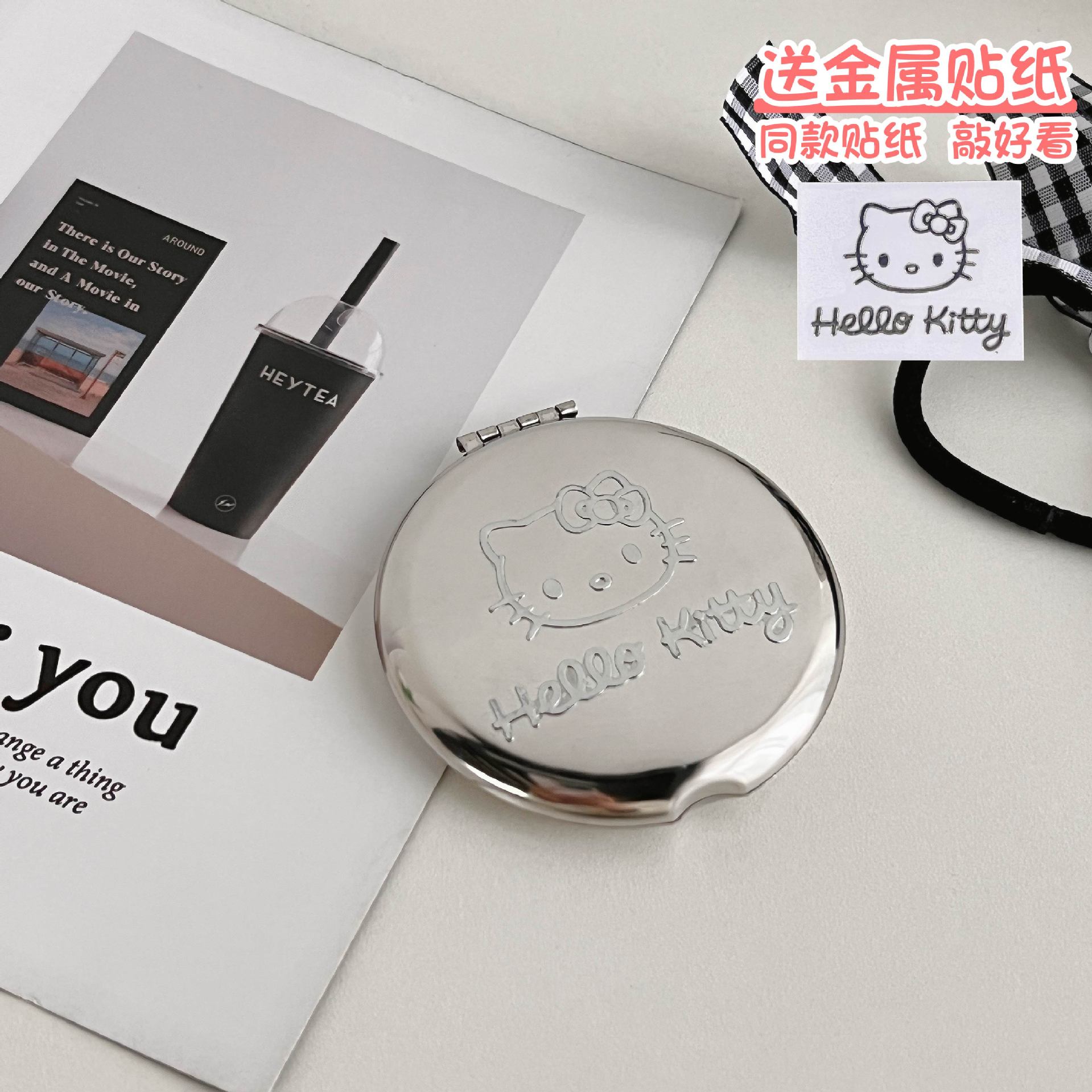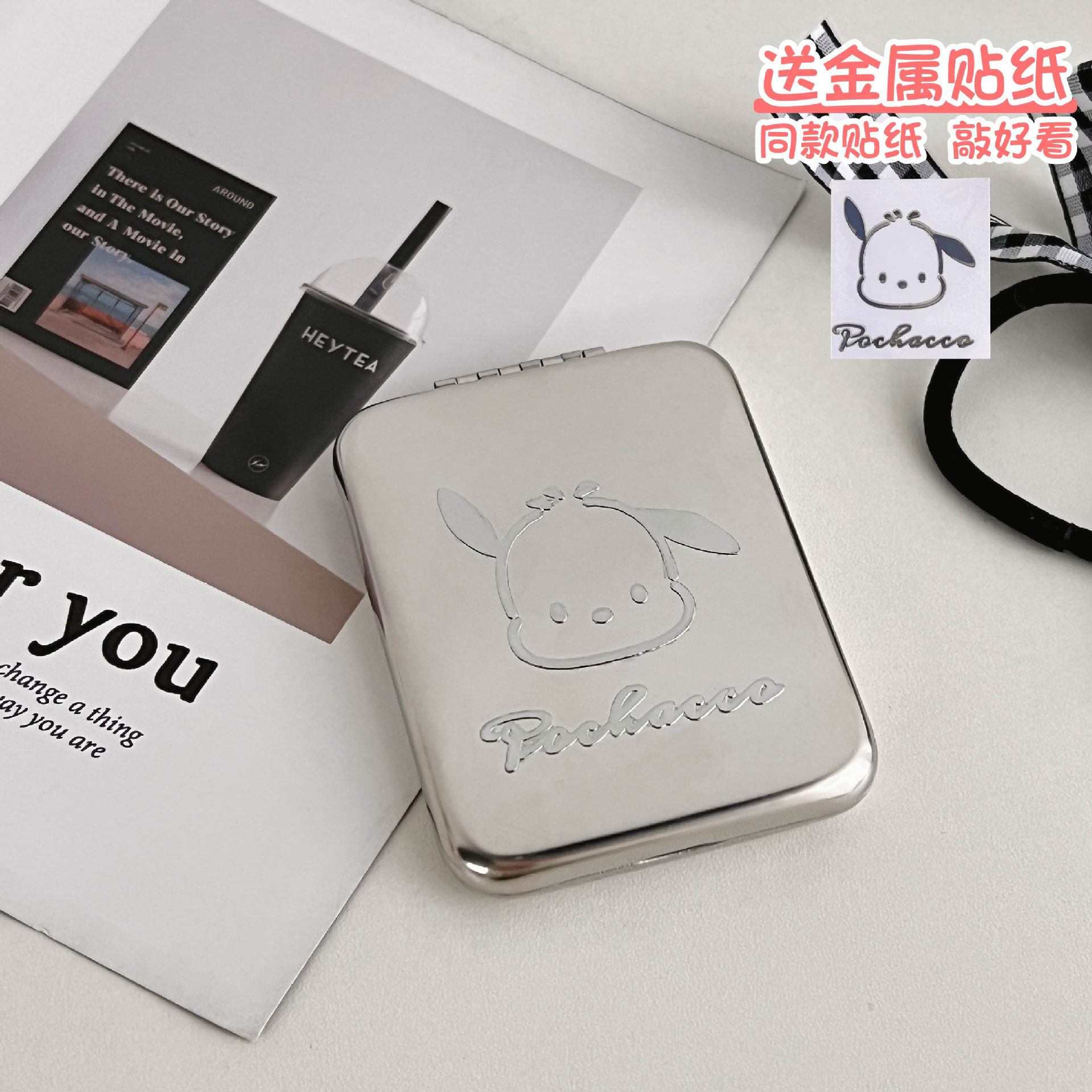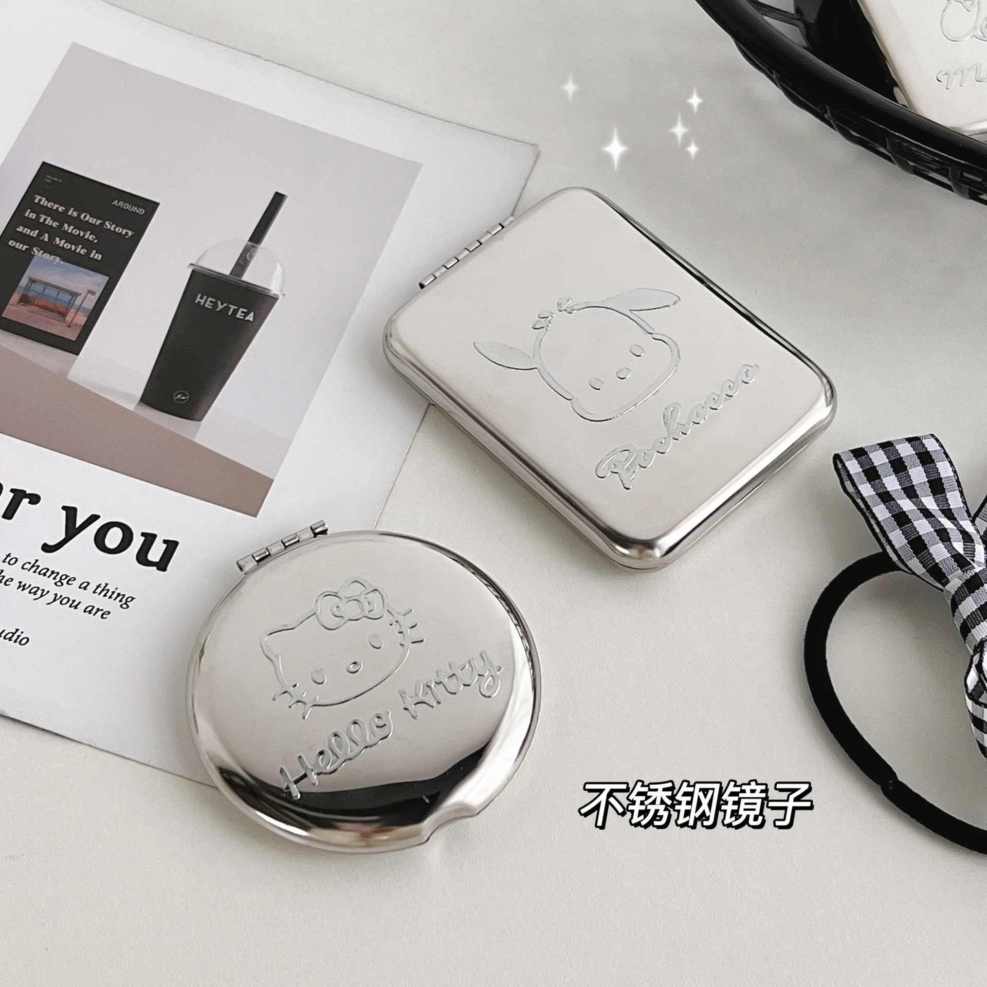 不锈钢化妆镜摔不碎随身小镜子激光logo刻字ins手持双面折叠镜