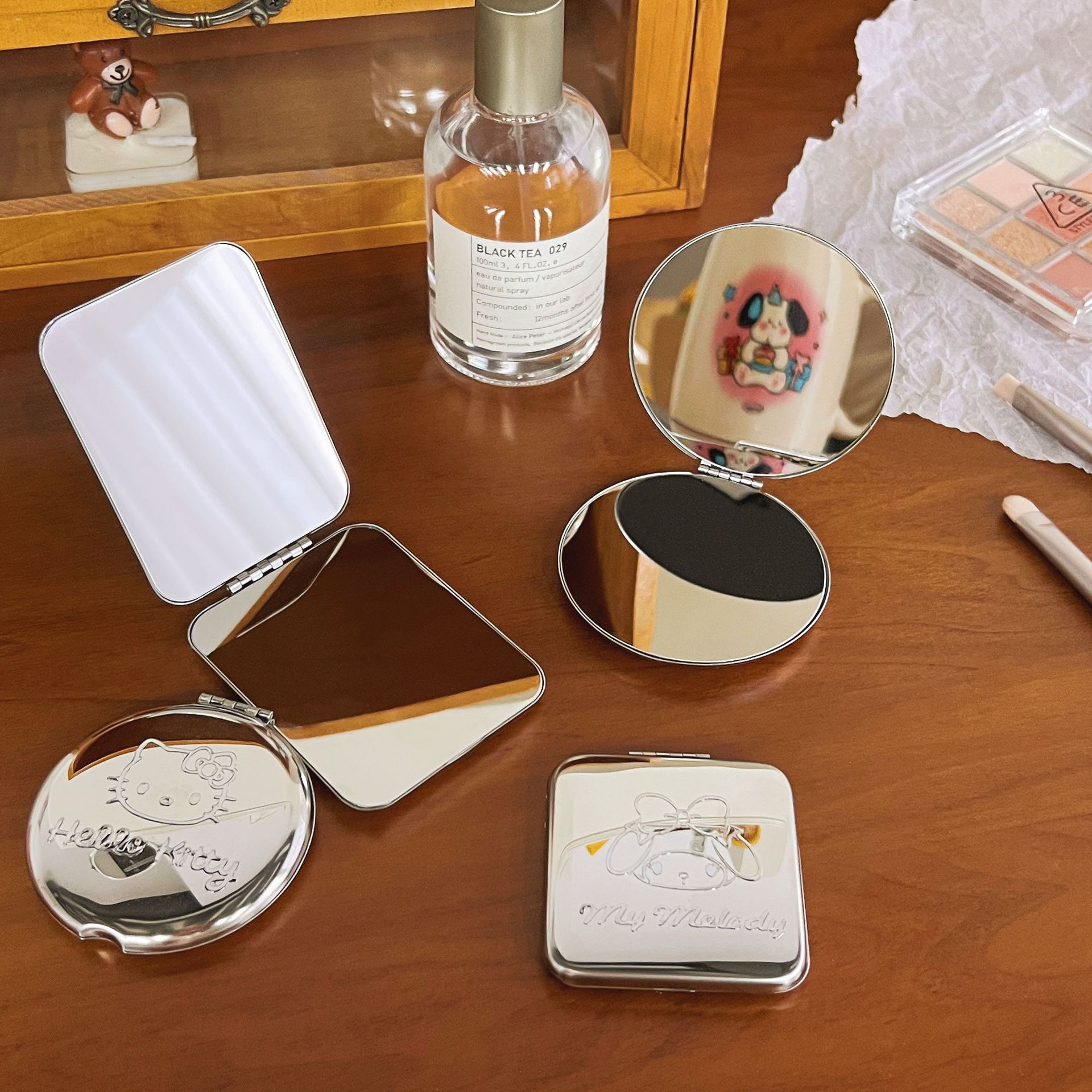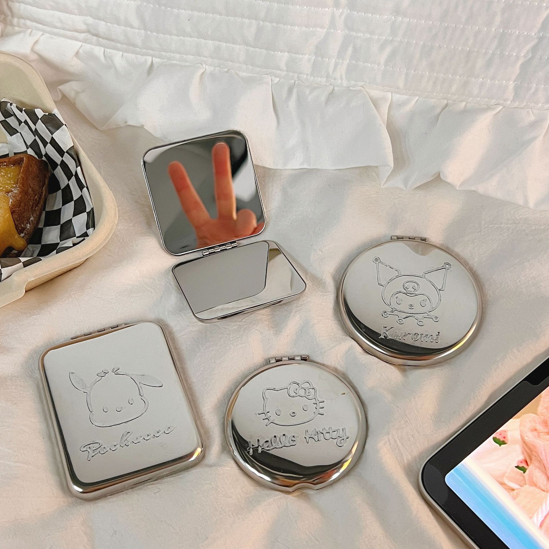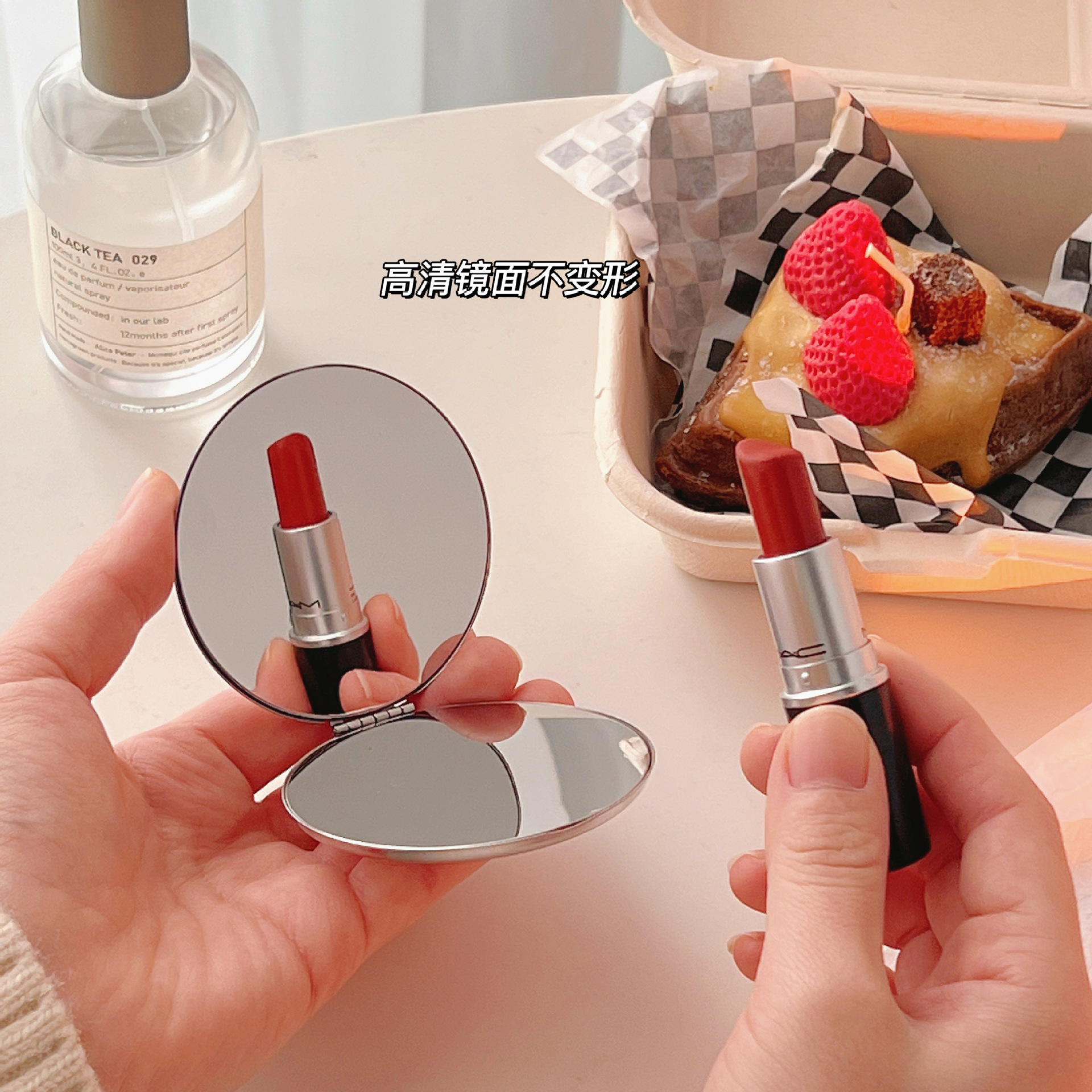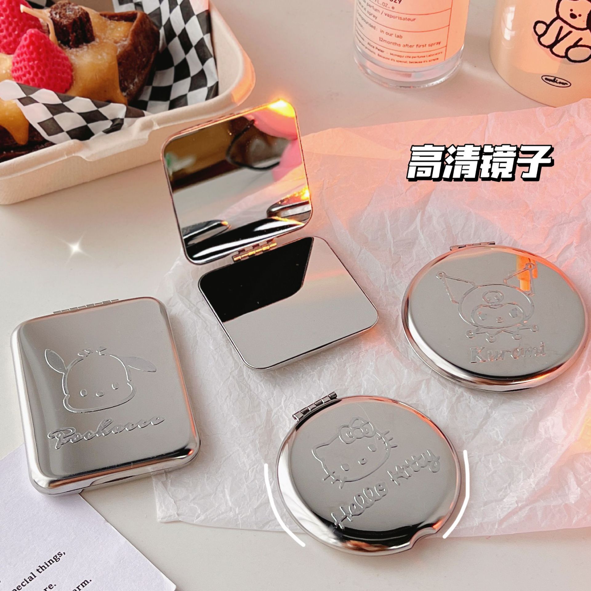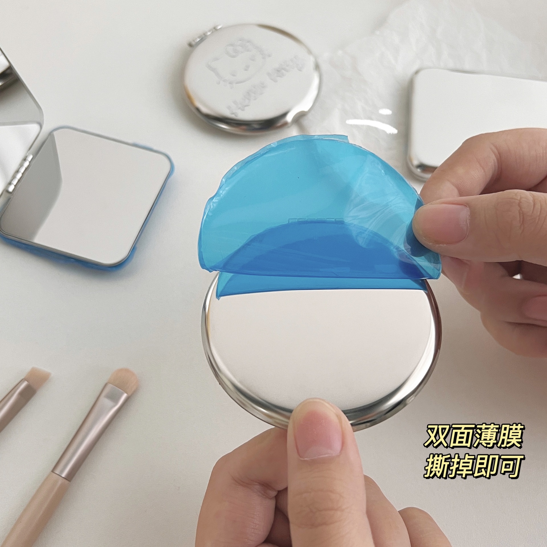 不锈钢化妆镜摔不碎随身小镜子激光logo刻字ins手持双面折叠镜