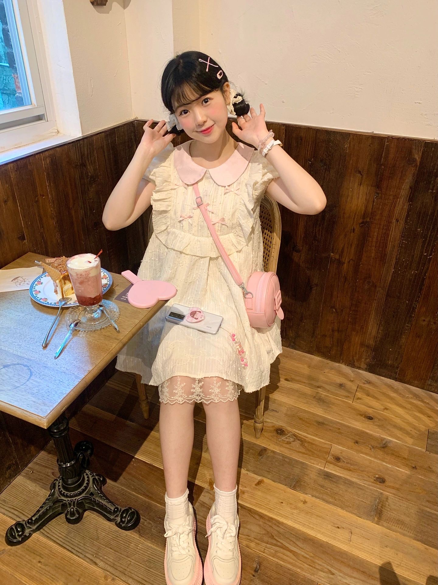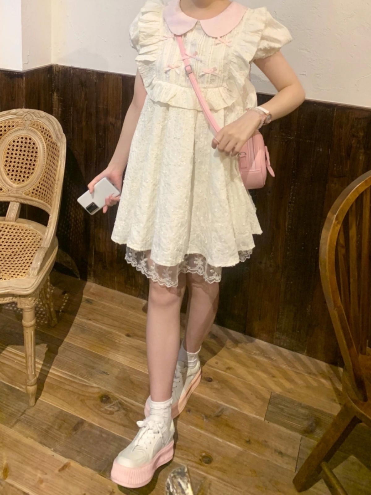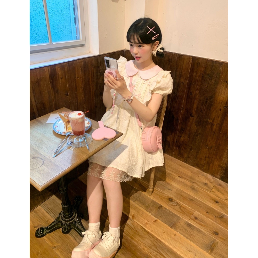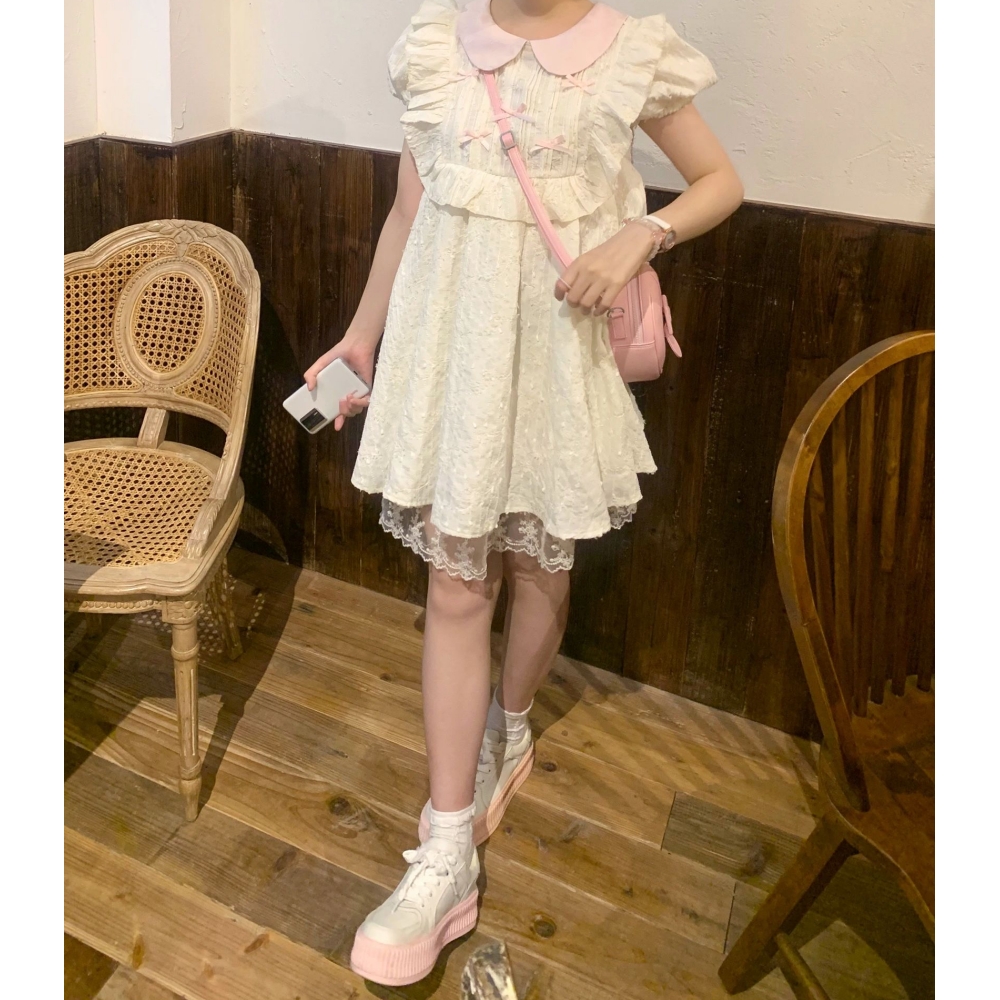甜美撞色娃娃領泡泡袖蕾絲花邊洋裝女夏寬鬆顯瘦遮肉小個子短裙