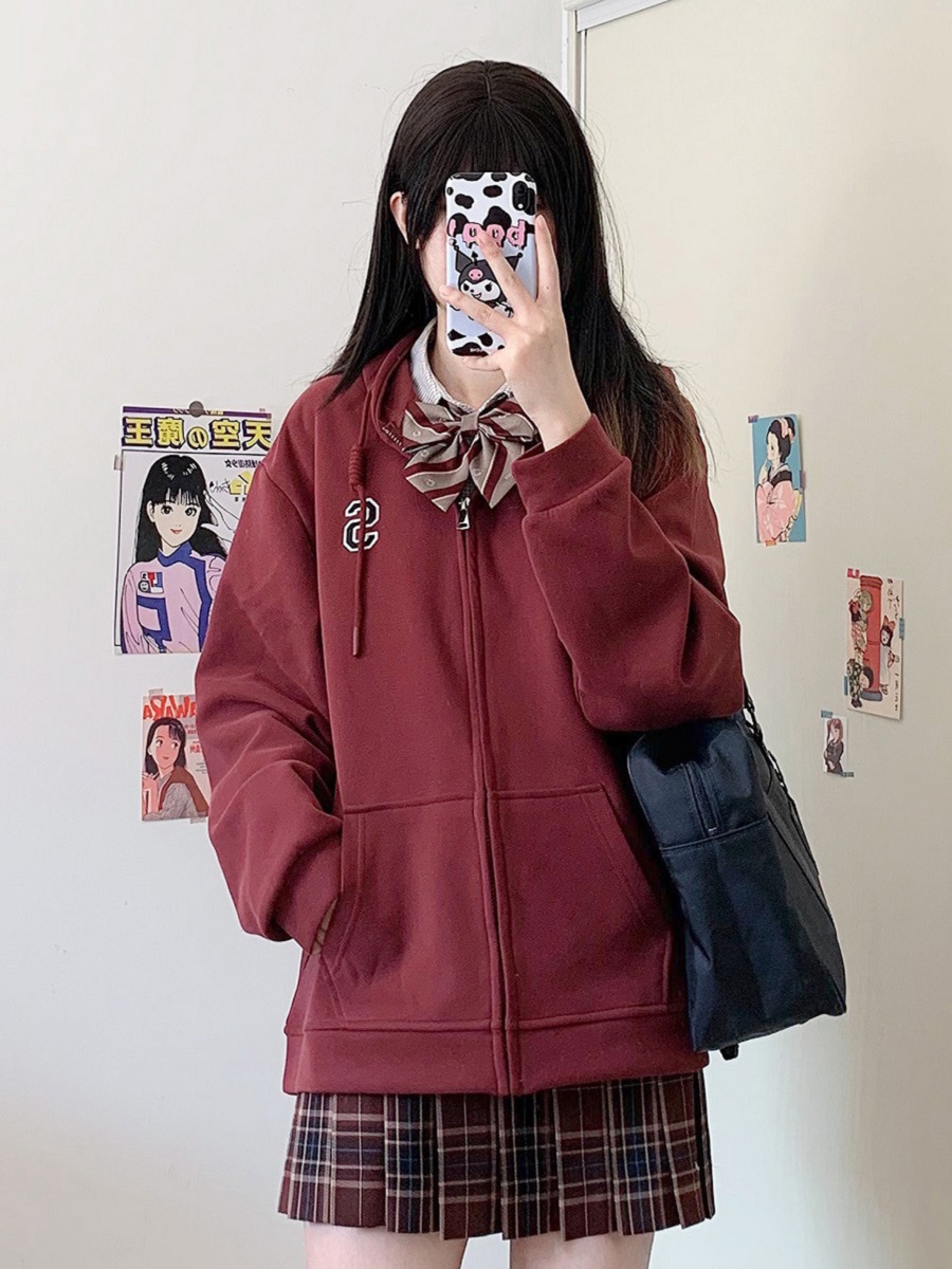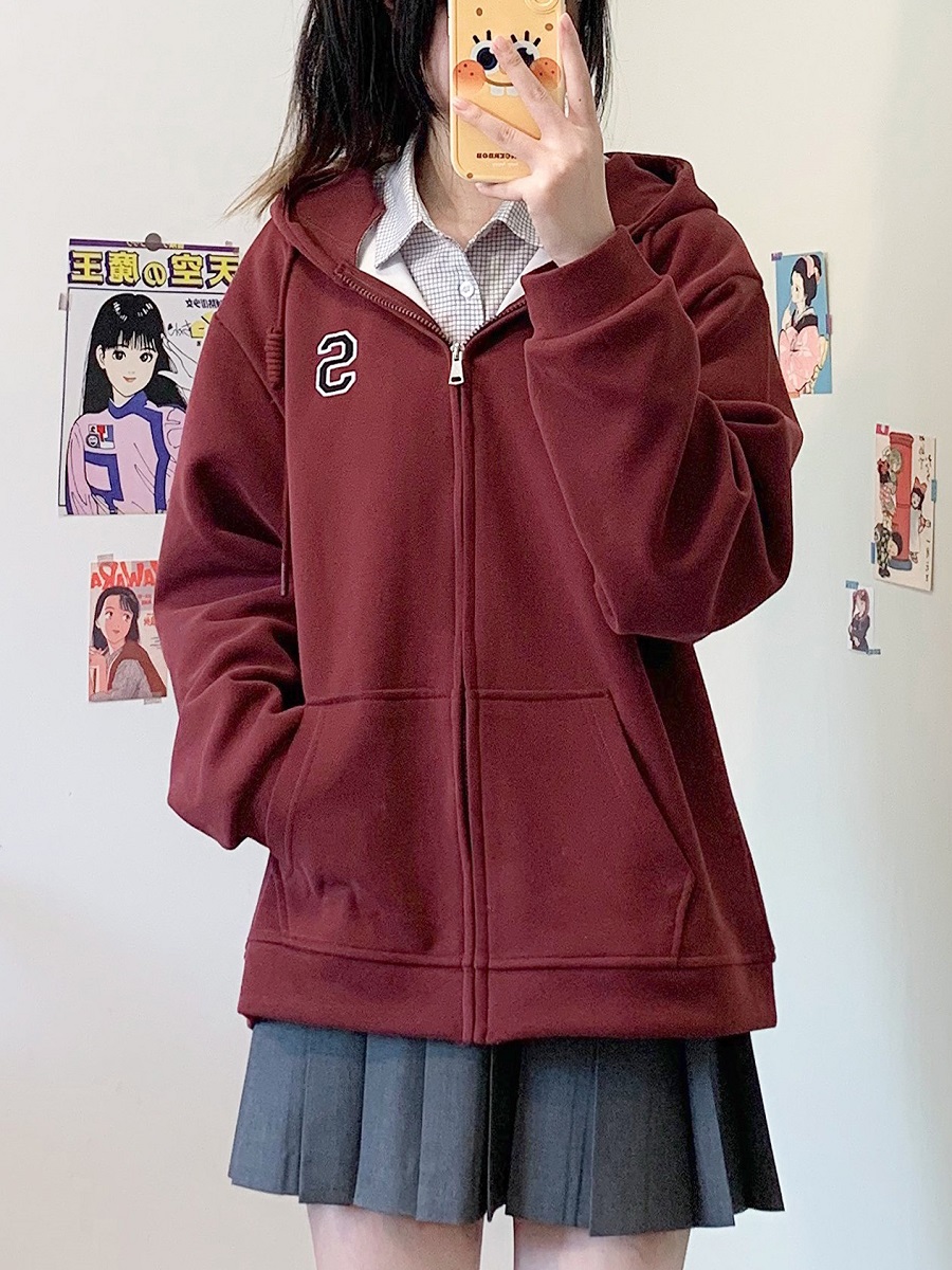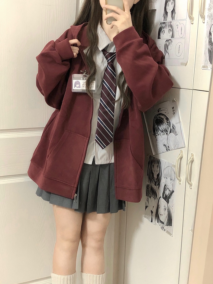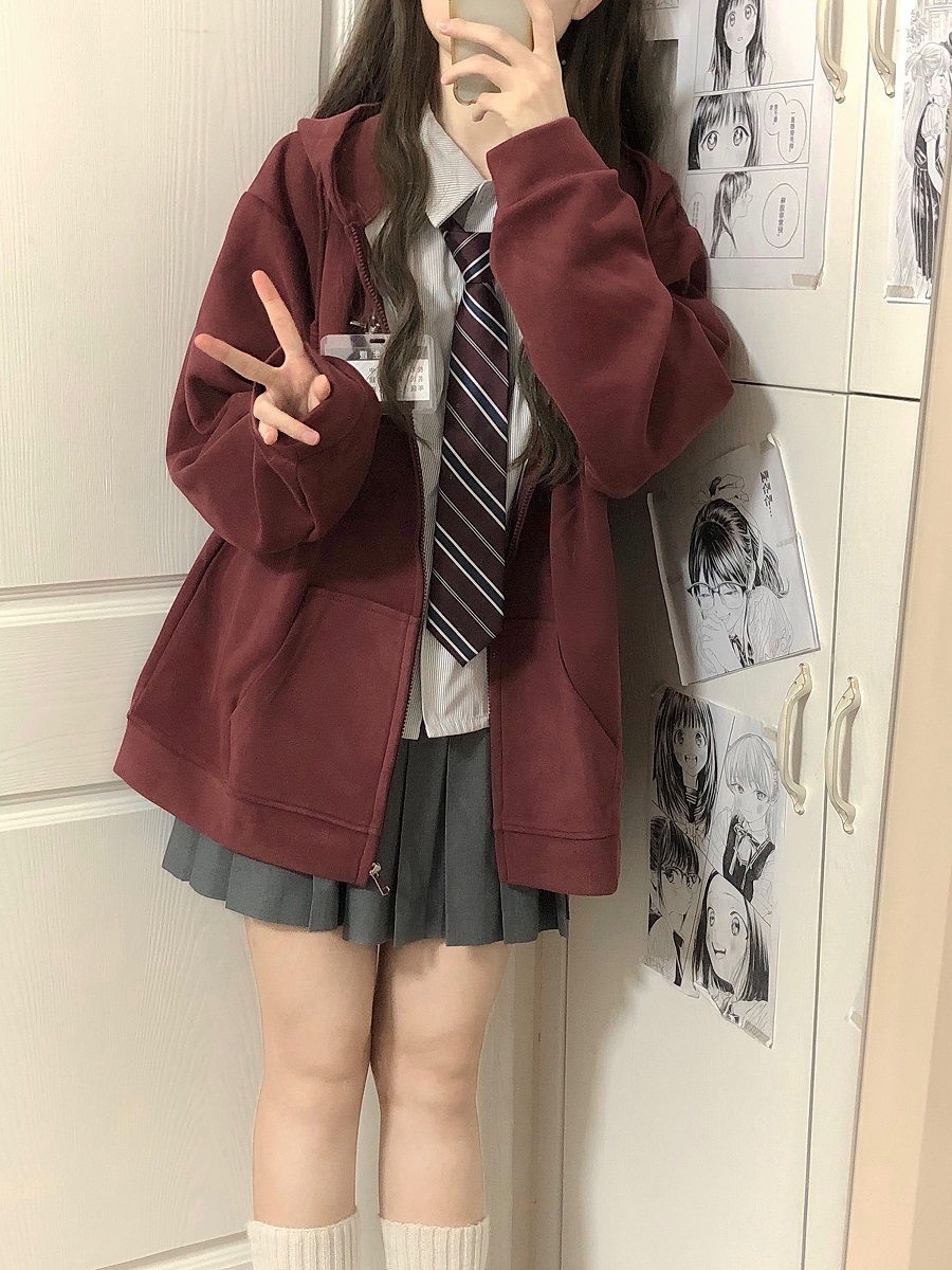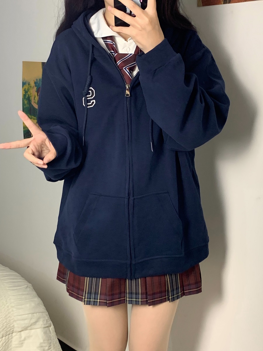 藏青寬鬆連帽運動衫女學生秋冬顯瘦百搭酒紅加絨拉鍊開衫jk外套上衣