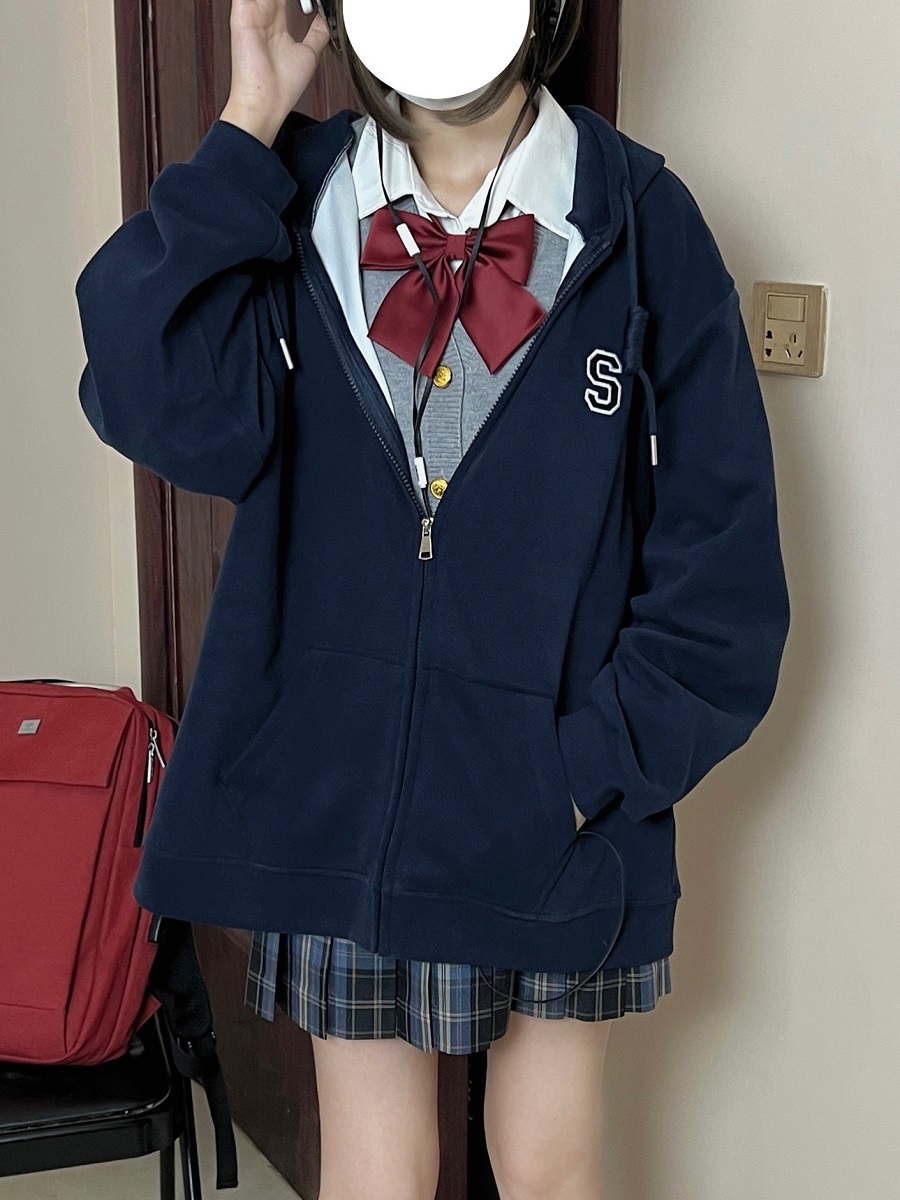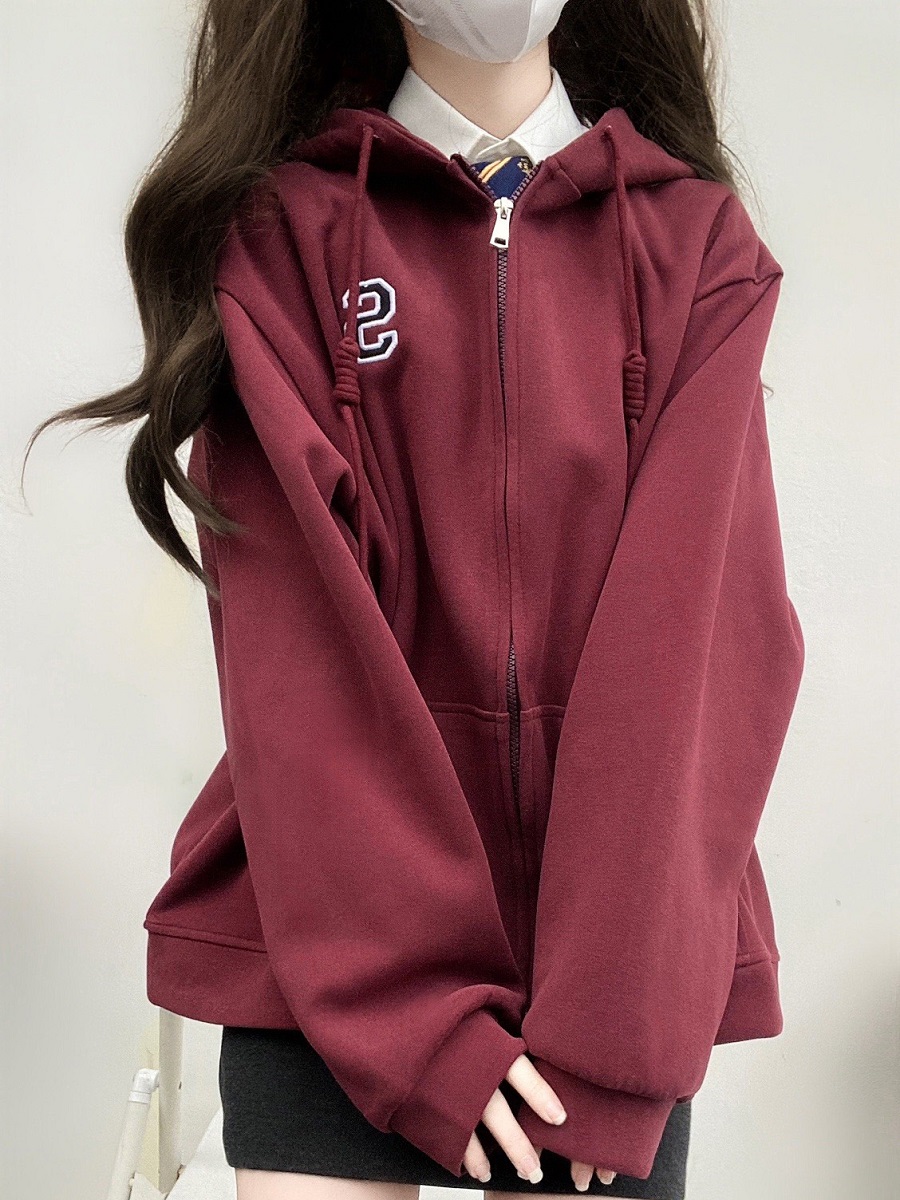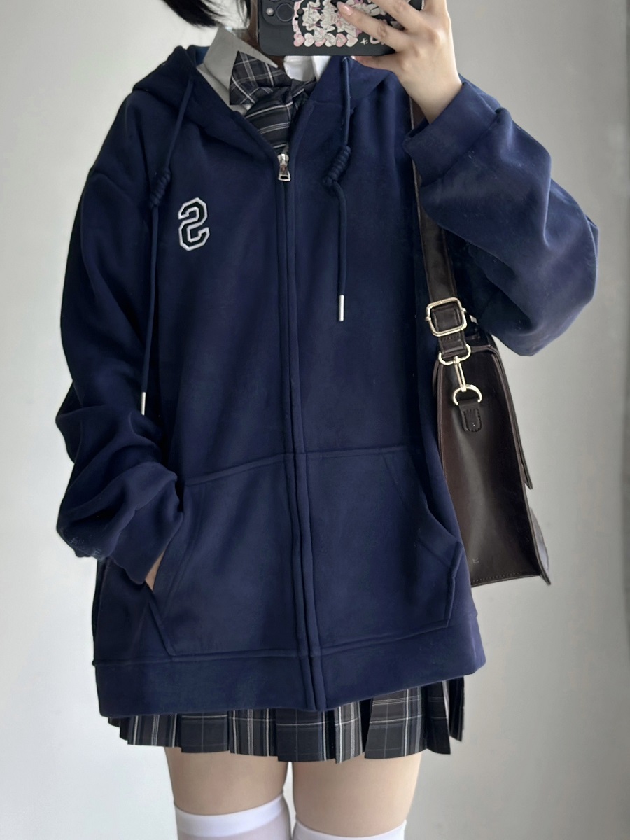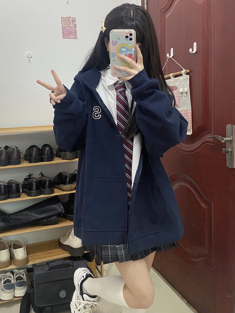 藏青寬鬆連帽運動衫女學生秋冬顯瘦百搭酒紅加絨拉鍊開衫jk外套上衣