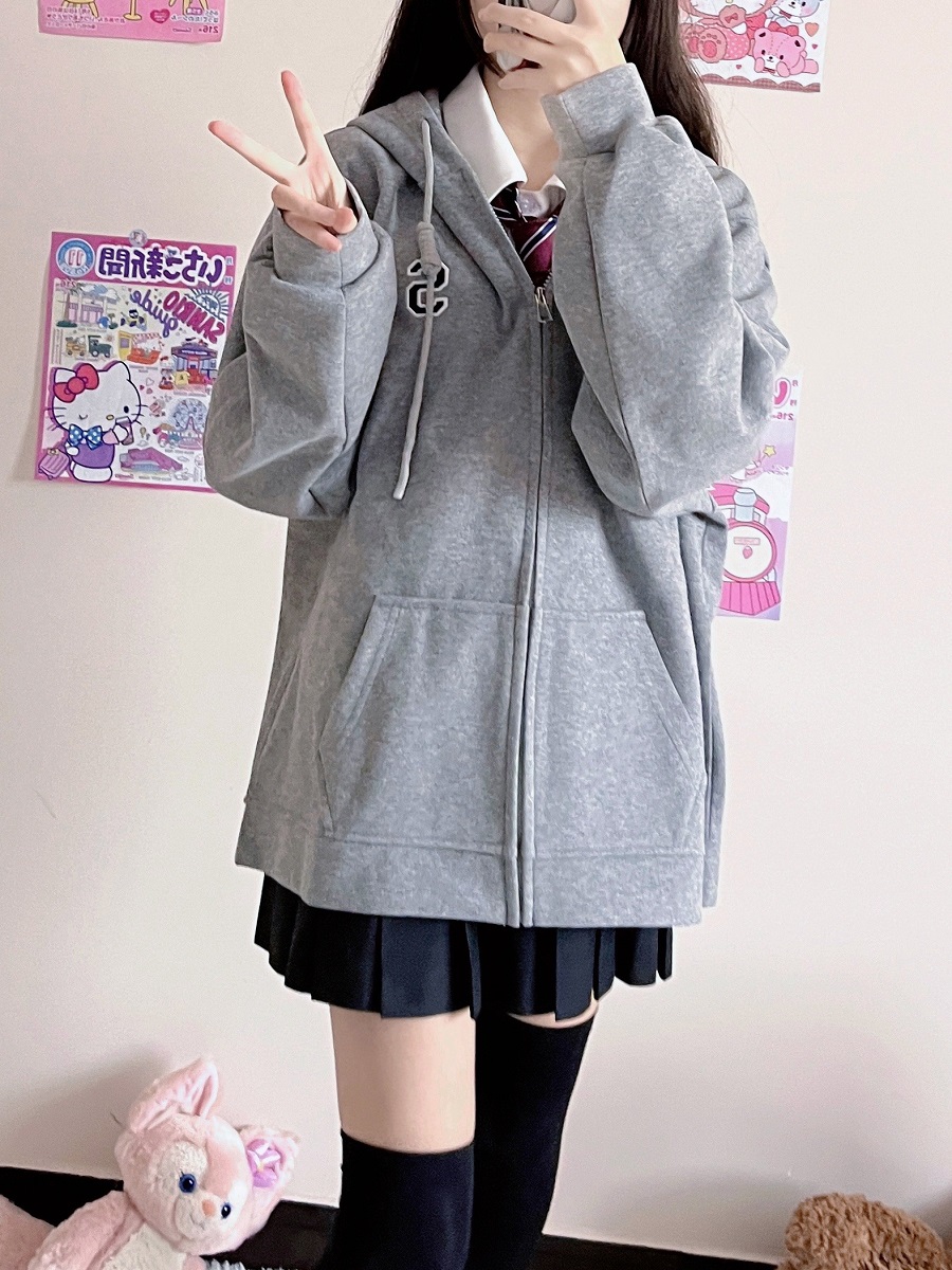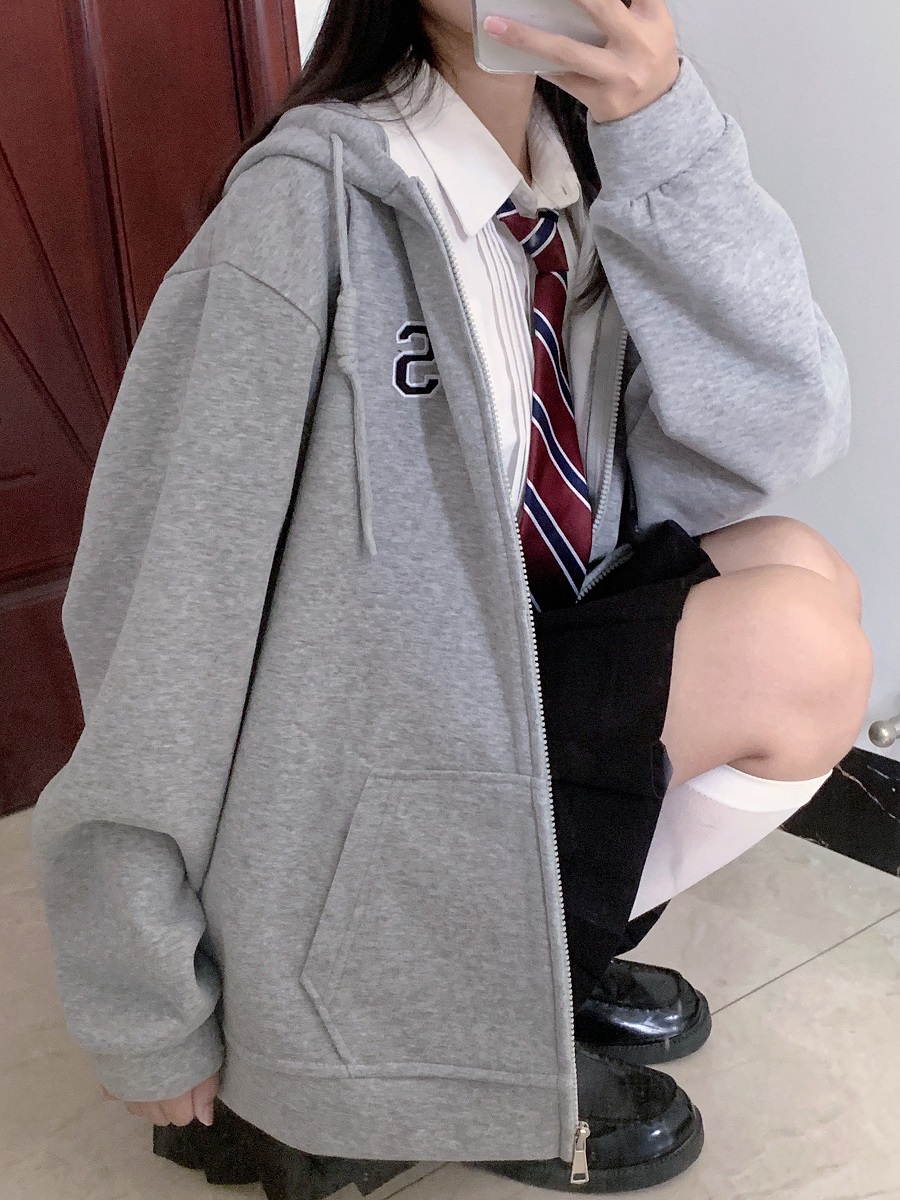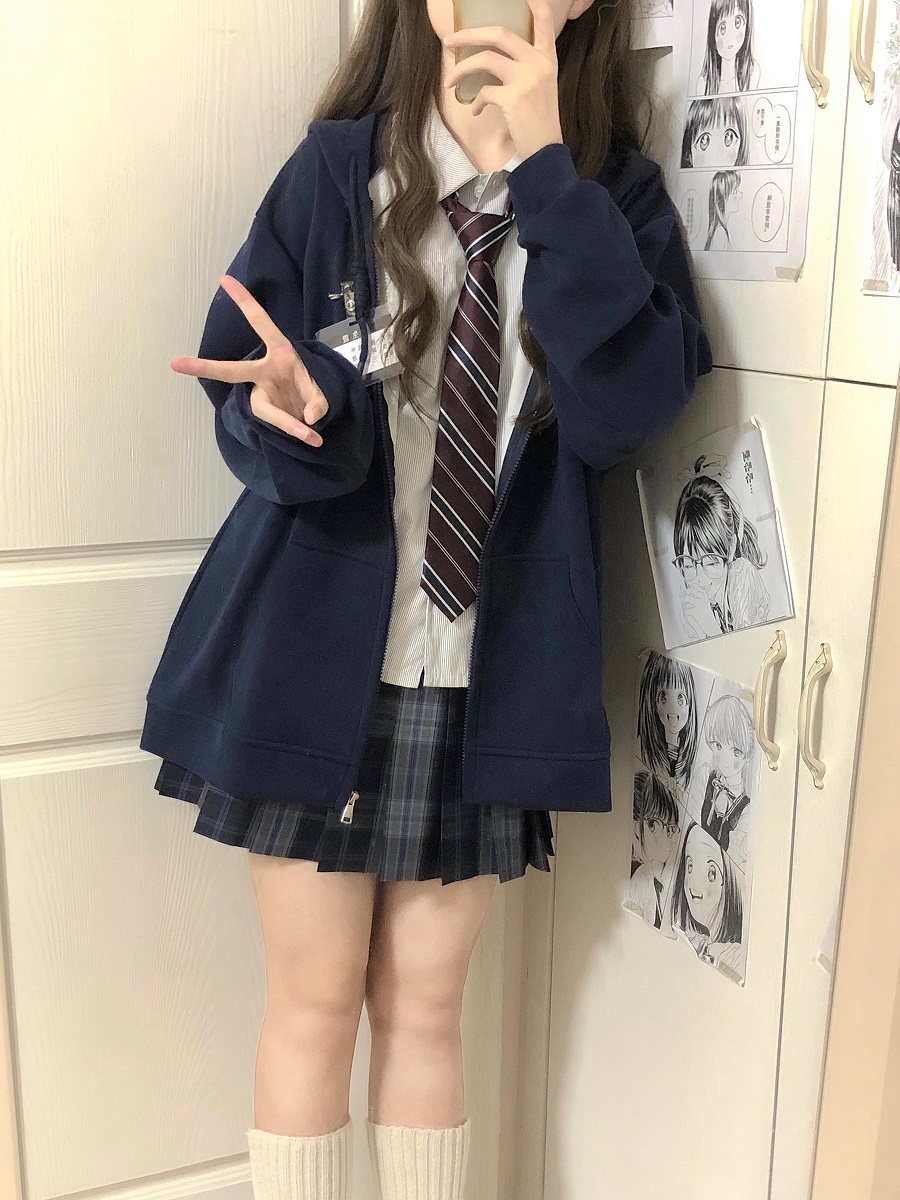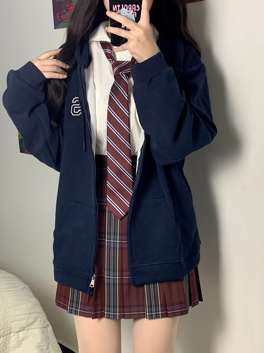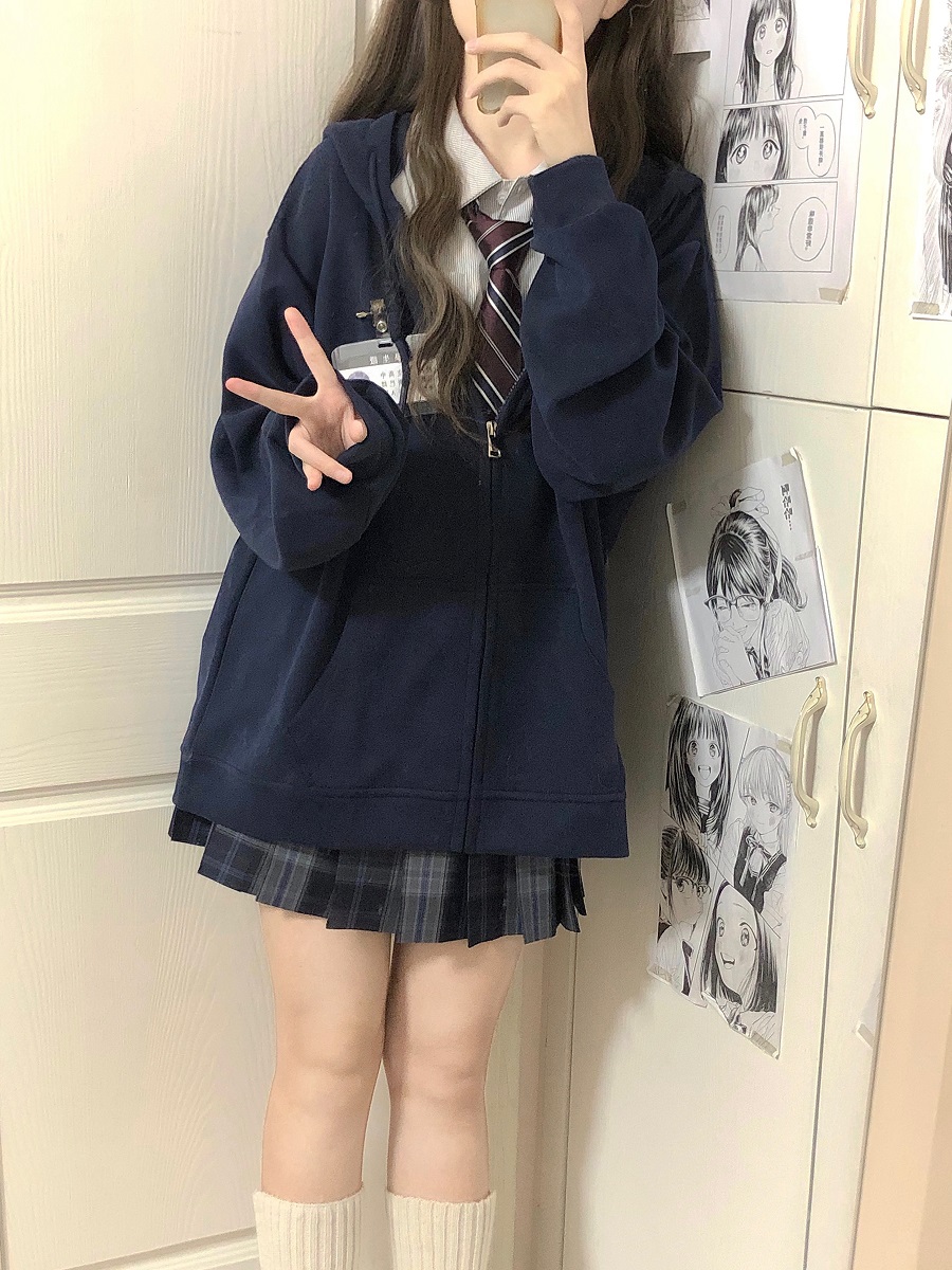 藏青寬鬆連帽運動衫女學生秋冬顯瘦百搭酒紅加絨拉鍊開衫jk外套上衣