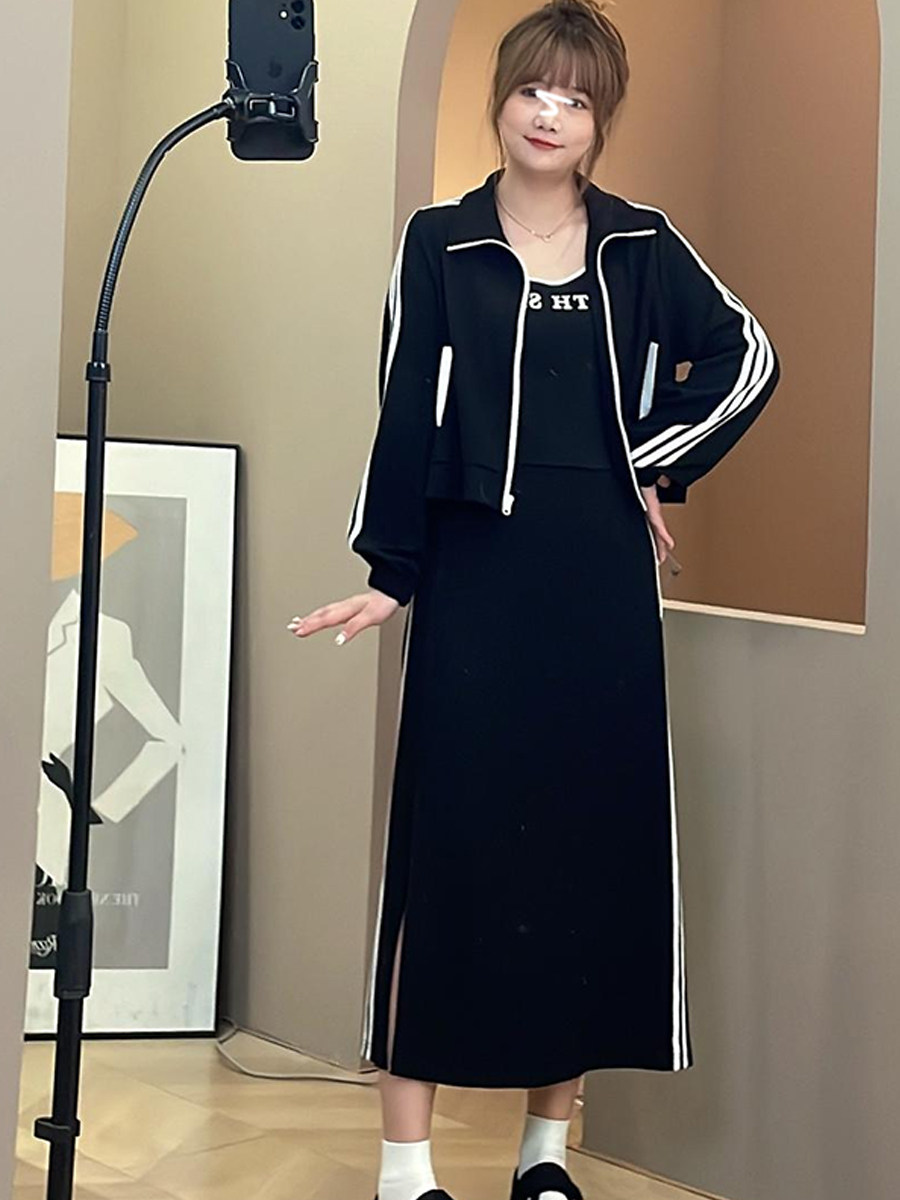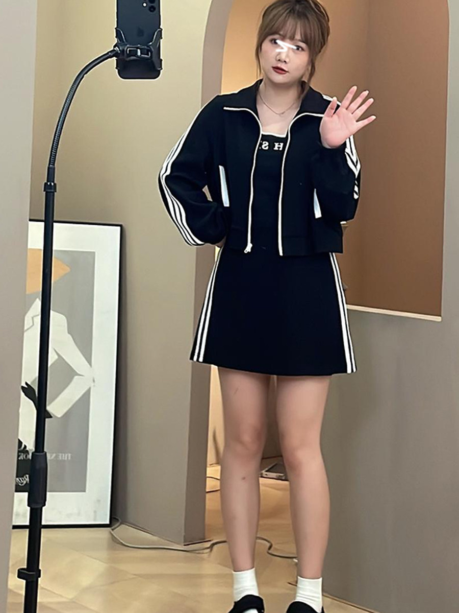 大尺碼休閒運動套裝女秋冬胖mm顯瘦跑步時尚背心+外套+半身裙三件套