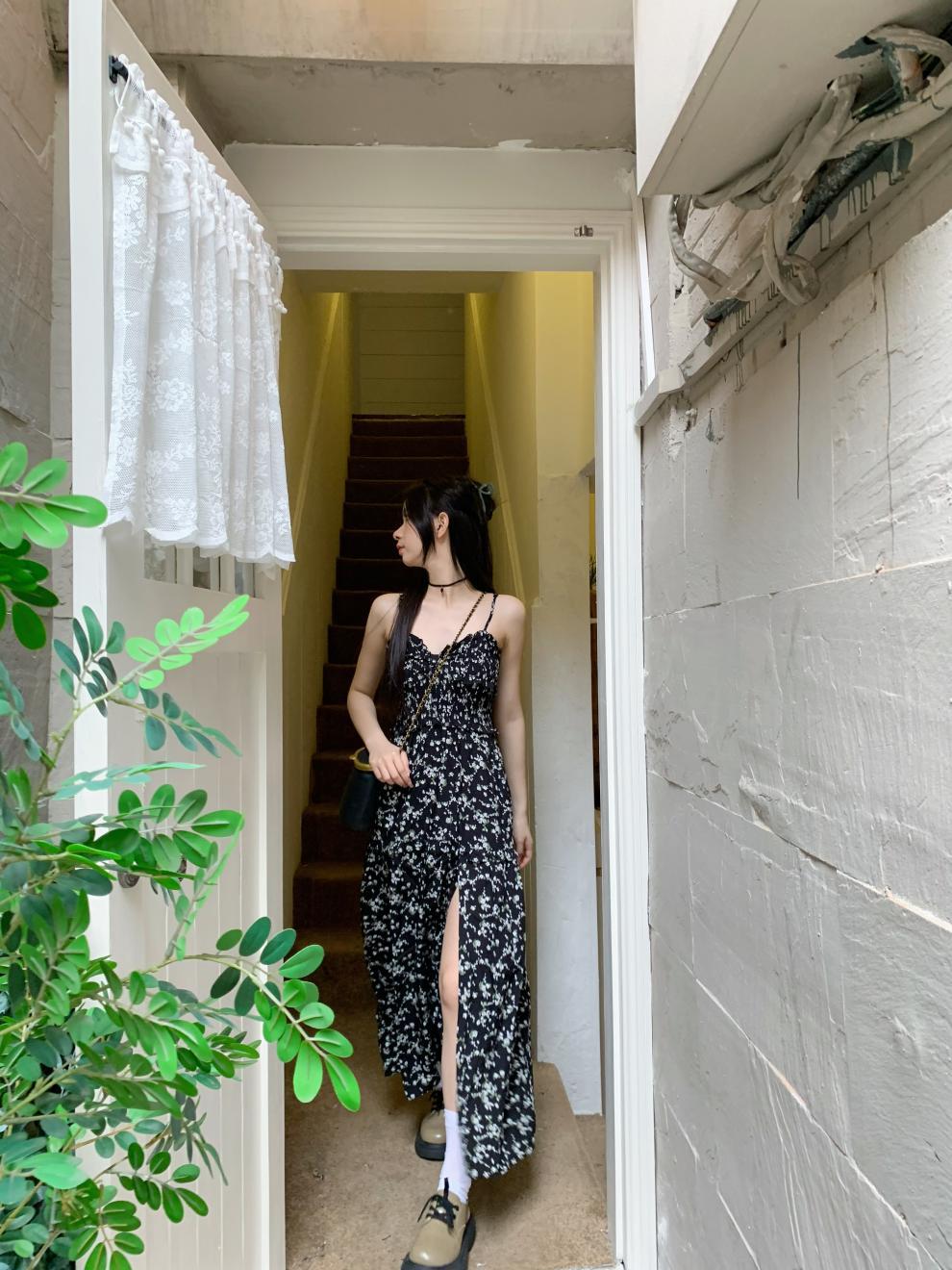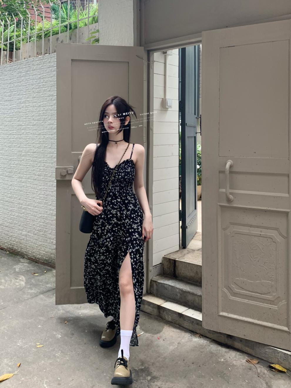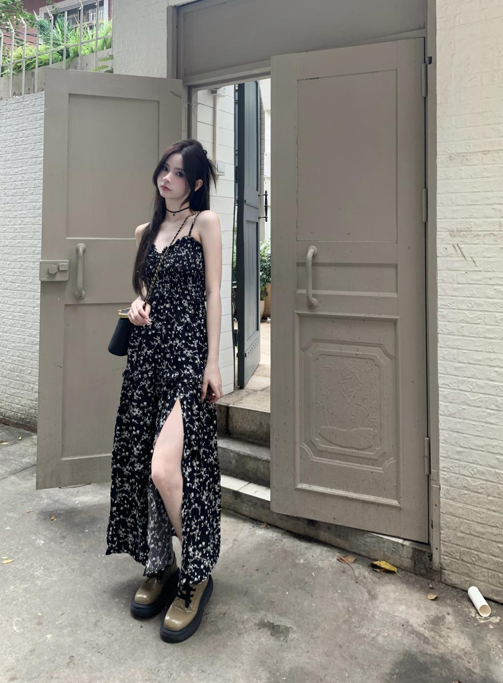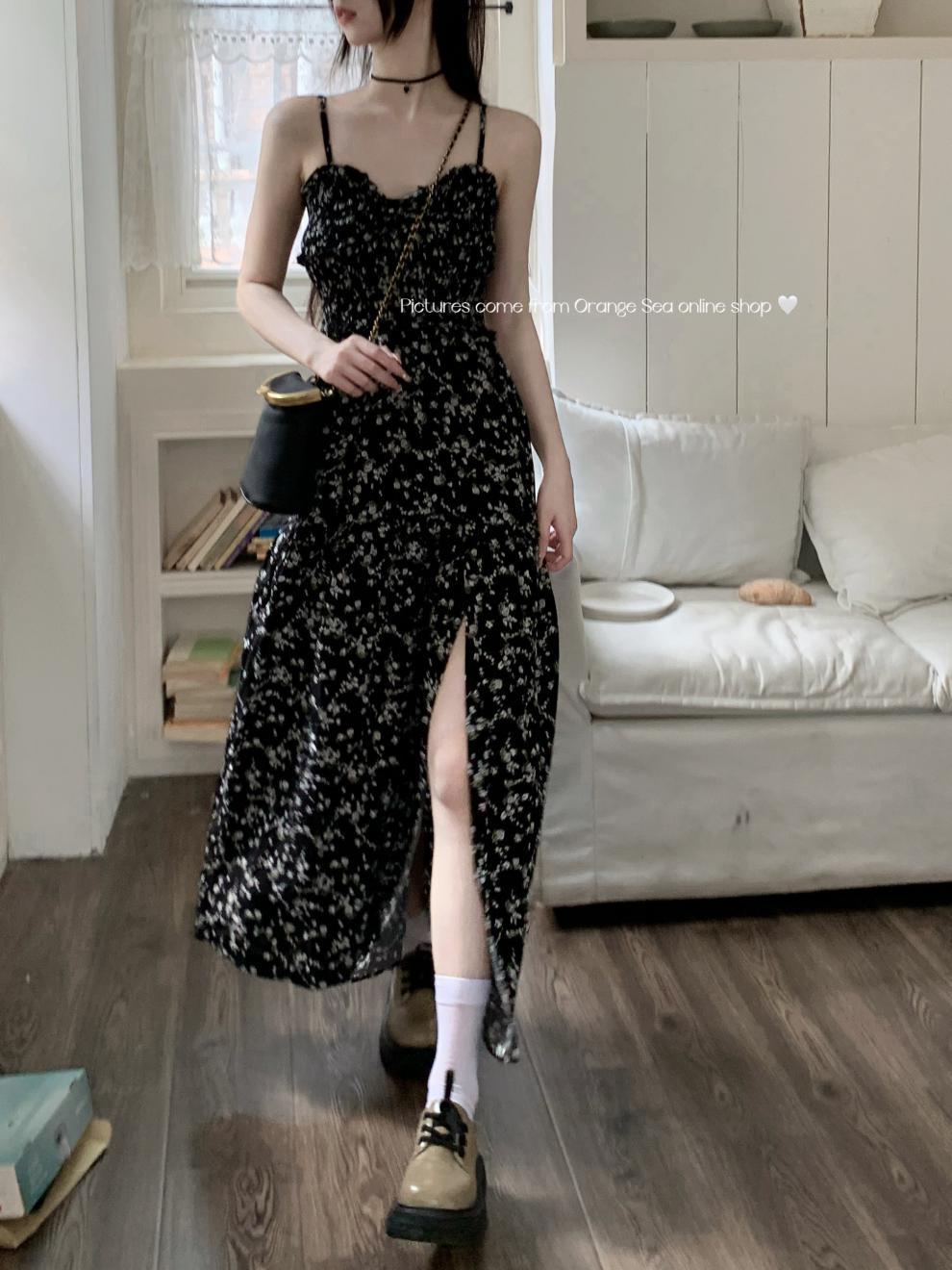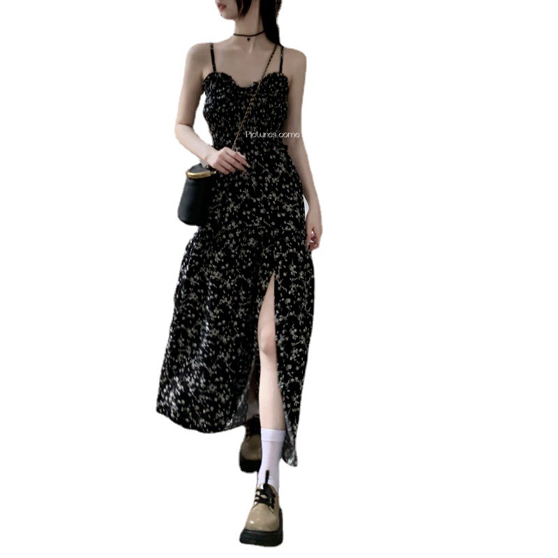 黑色碎花吊带连衣裙女夏季2023新款开叉中长款收腰法式长裙子