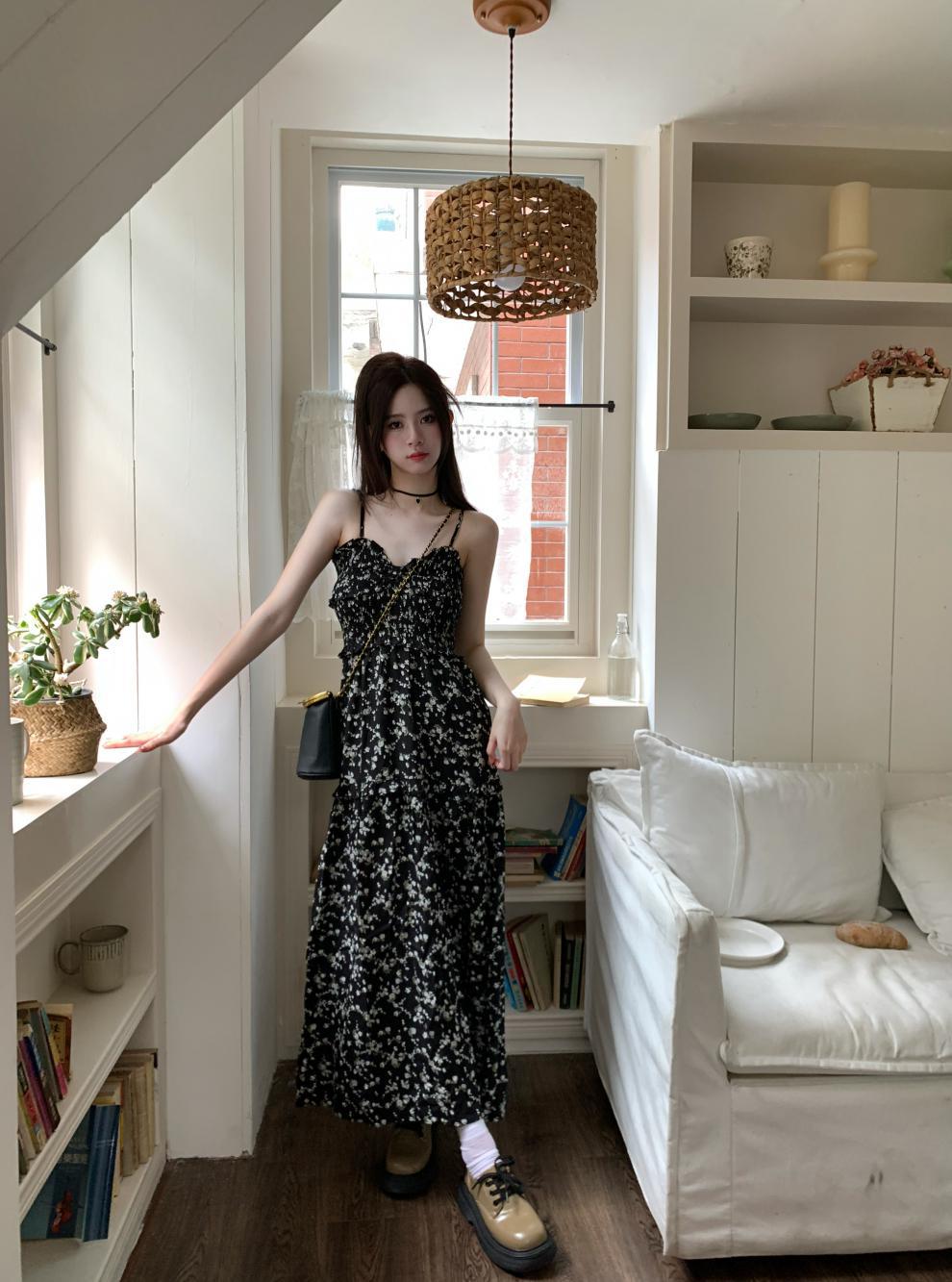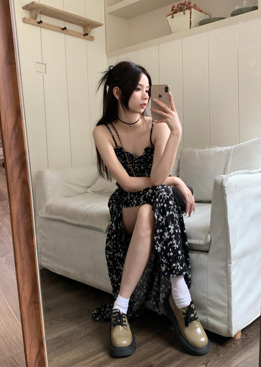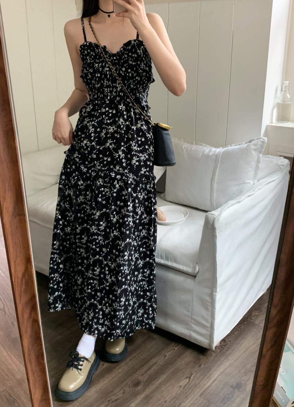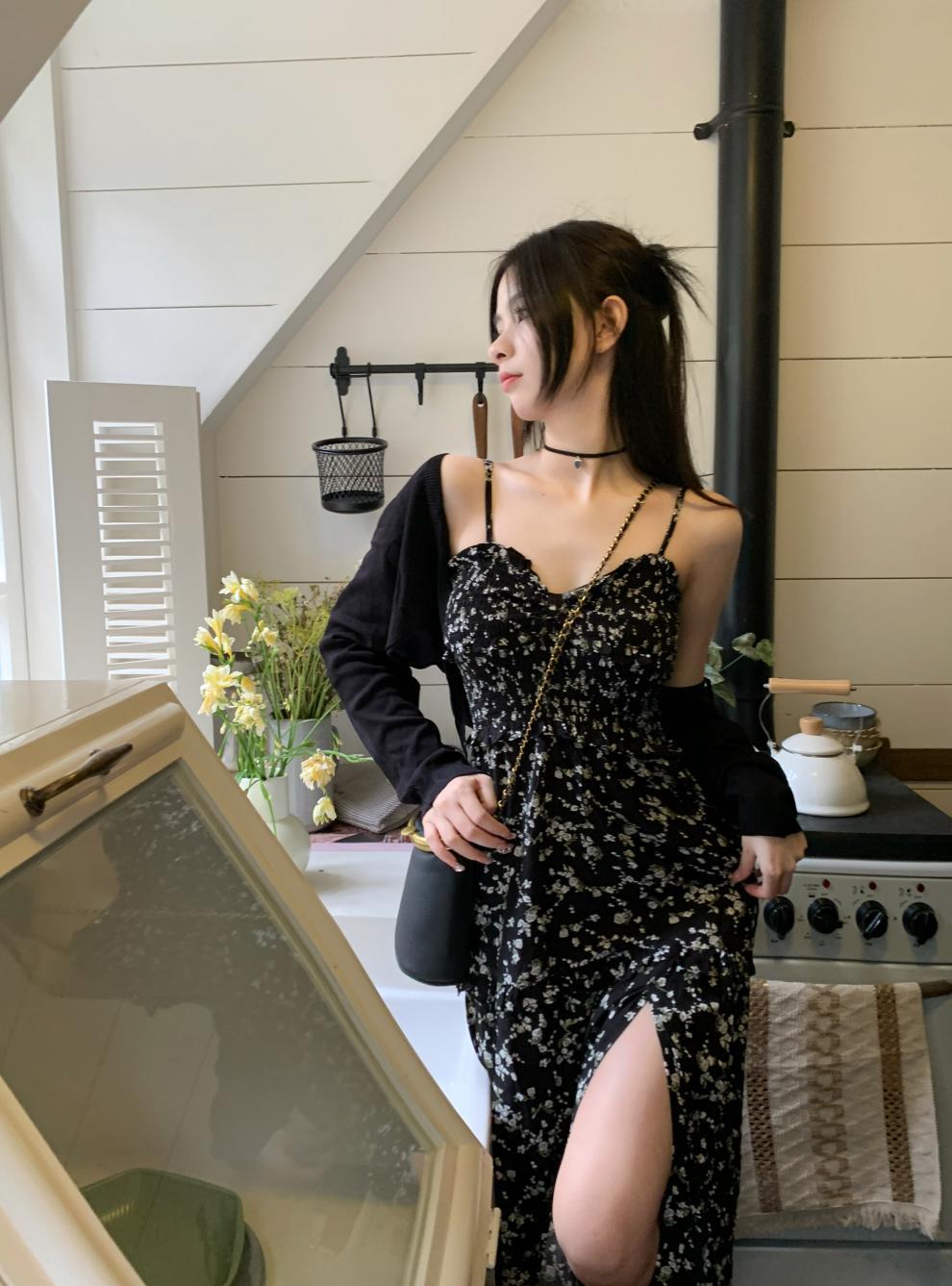 黑色碎花吊带连衣裙女夏季2023新款开叉中长款收腰法式长裙子