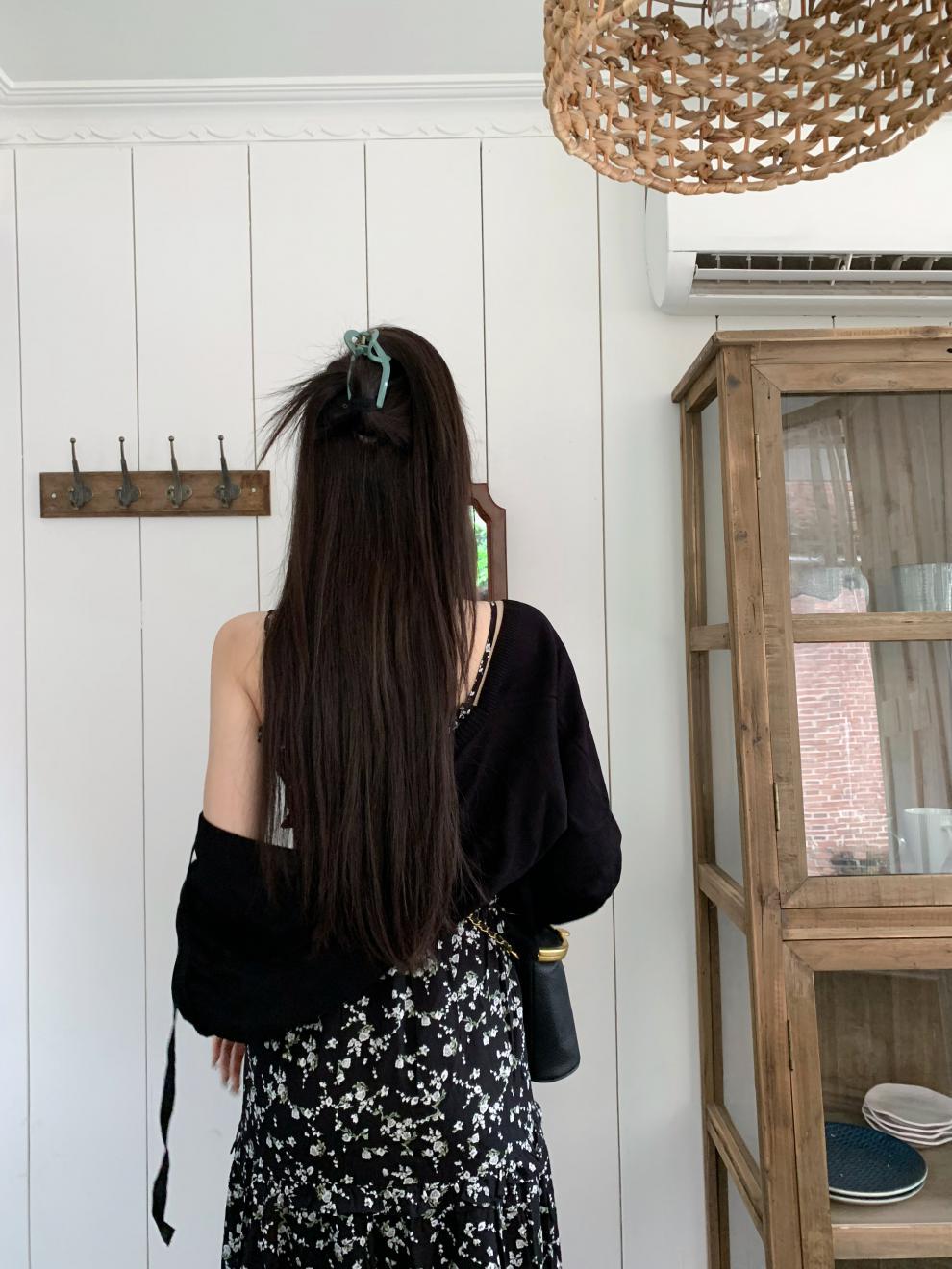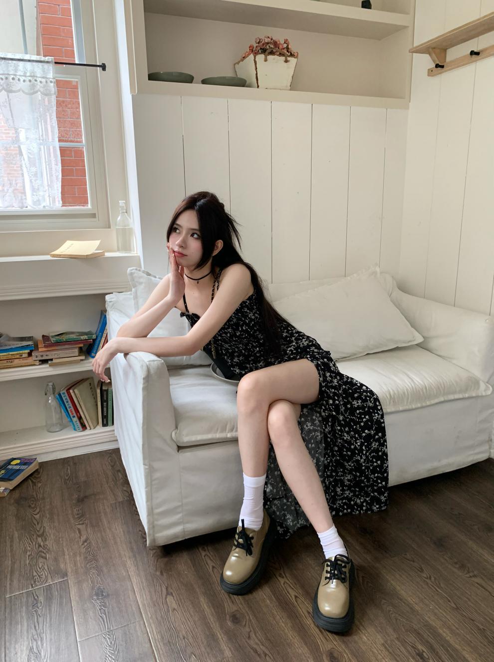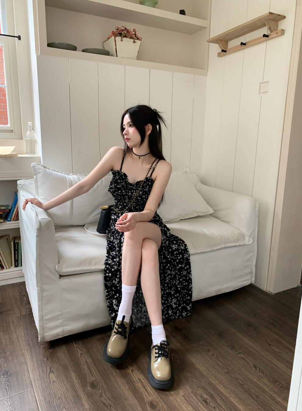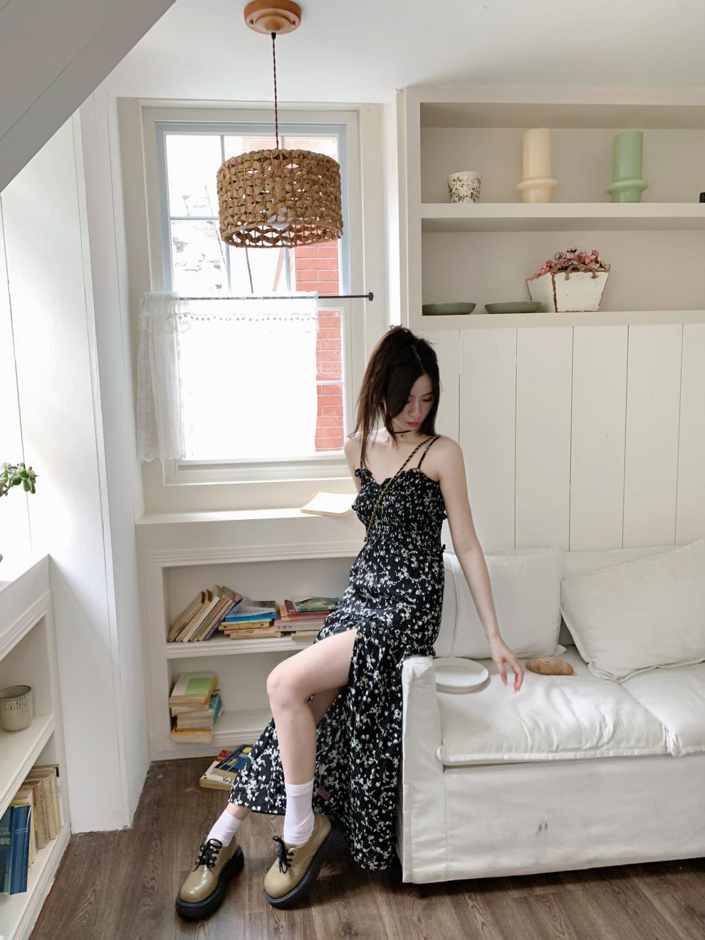 黑色碎花吊带连衣裙女夏季2023新款开叉中长款收腰法式长裙子