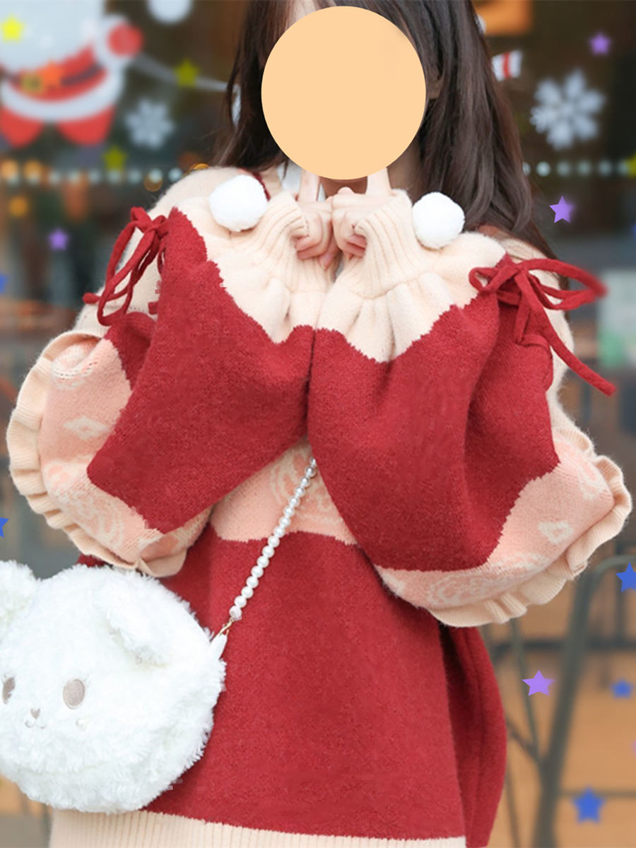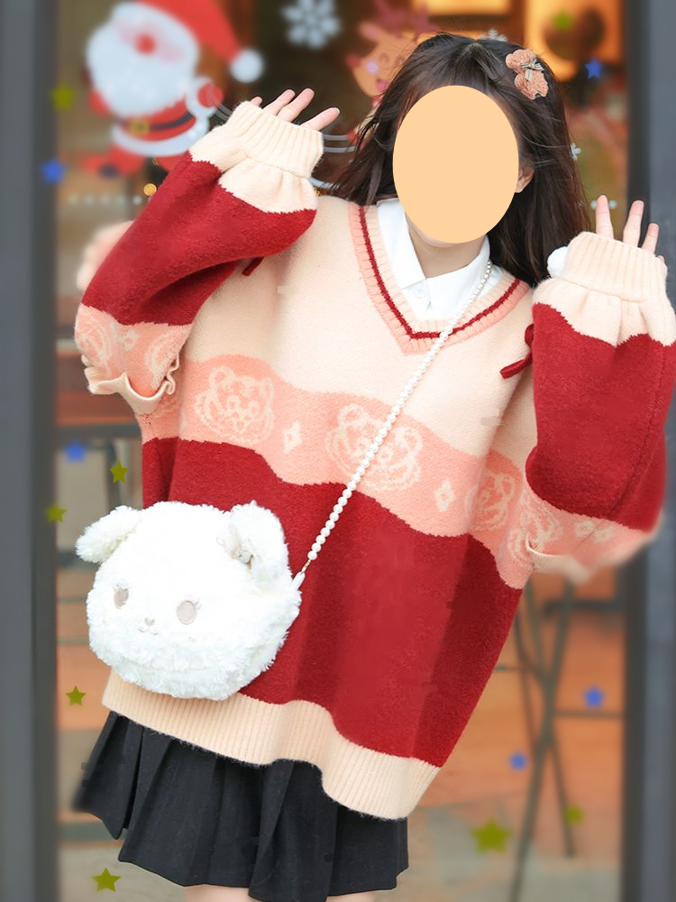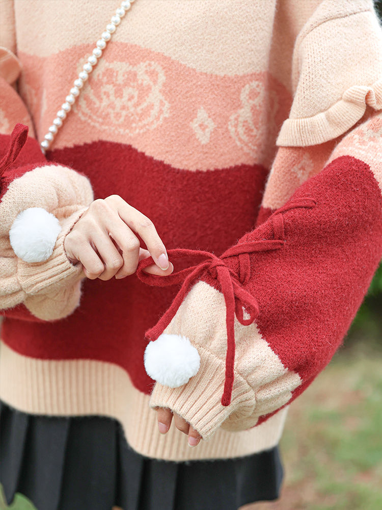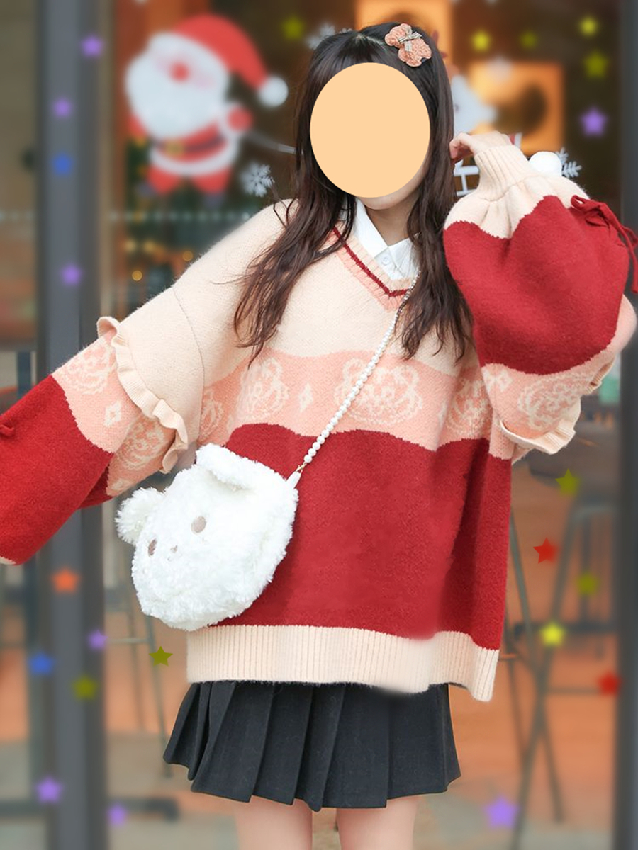 原創設計新年毛衣甜美可愛荷葉邊針織衫保暖加厚寬鬆V領套頭外套