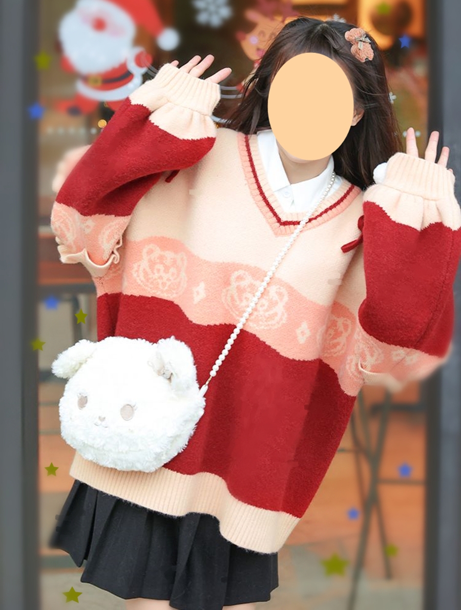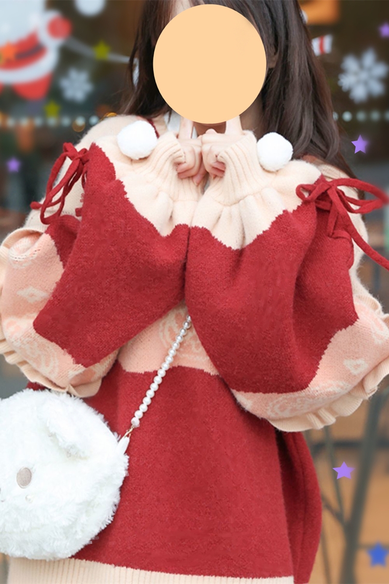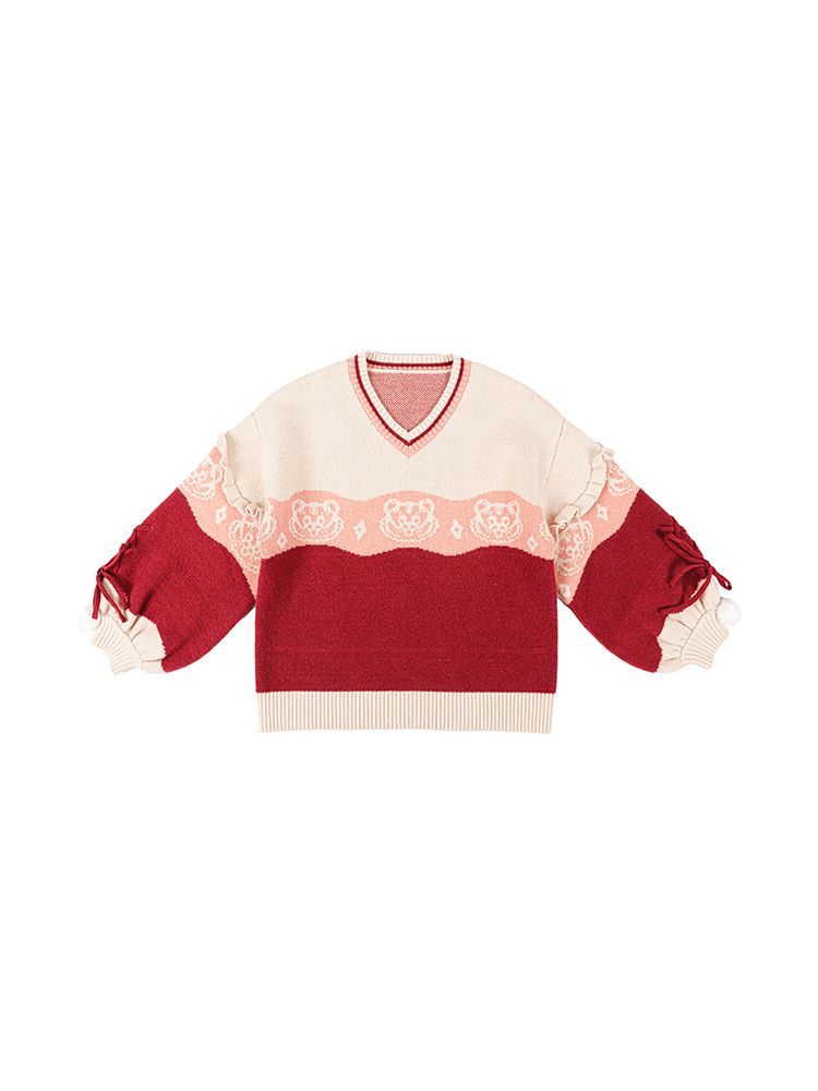 原創設計新年毛衣甜美可愛荷葉邊針織衫保暖加厚寬鬆V領套頭外套