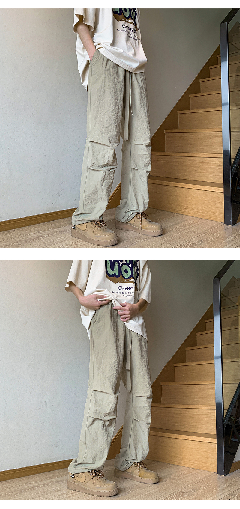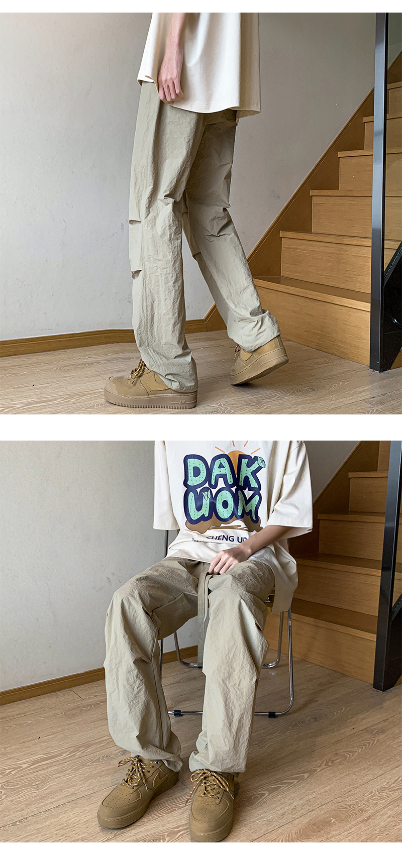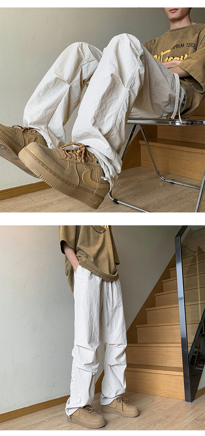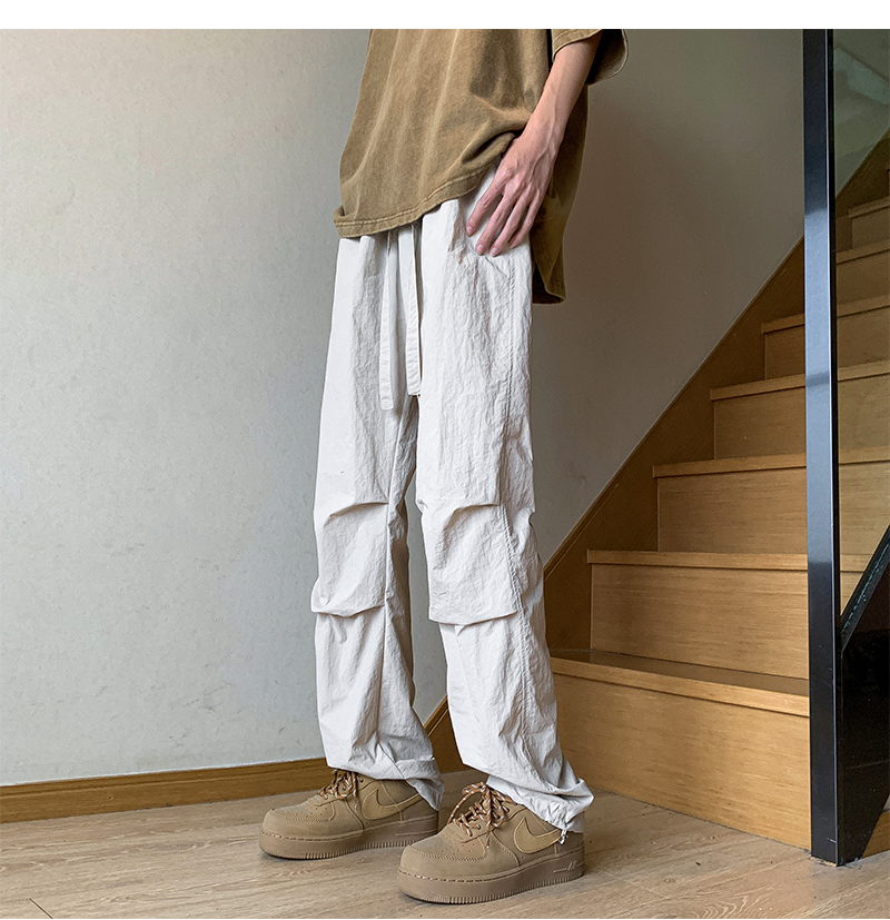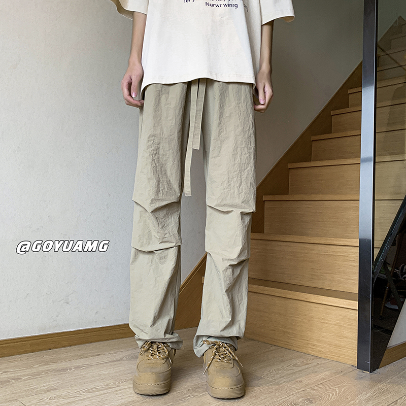 杏色潮流速乾褶皺冰絲褲美式ins涼感降落傘褲子oversize工裝長褲