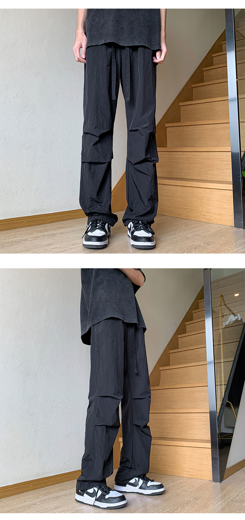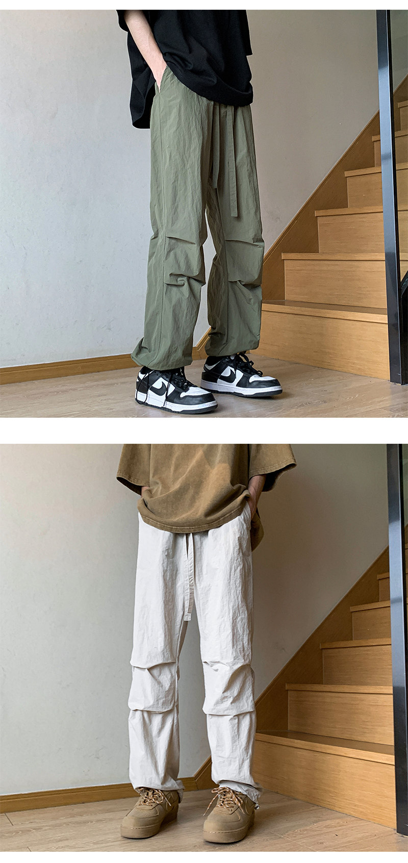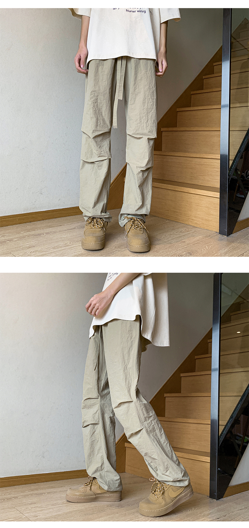 杏色潮流速乾褶皺冰絲褲美式ins涼感降落傘褲子oversize工裝長褲
