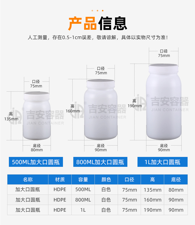 规格 500ML加大口圆瓶,800ML加大口圆瓶,1L加大口圆瓶
