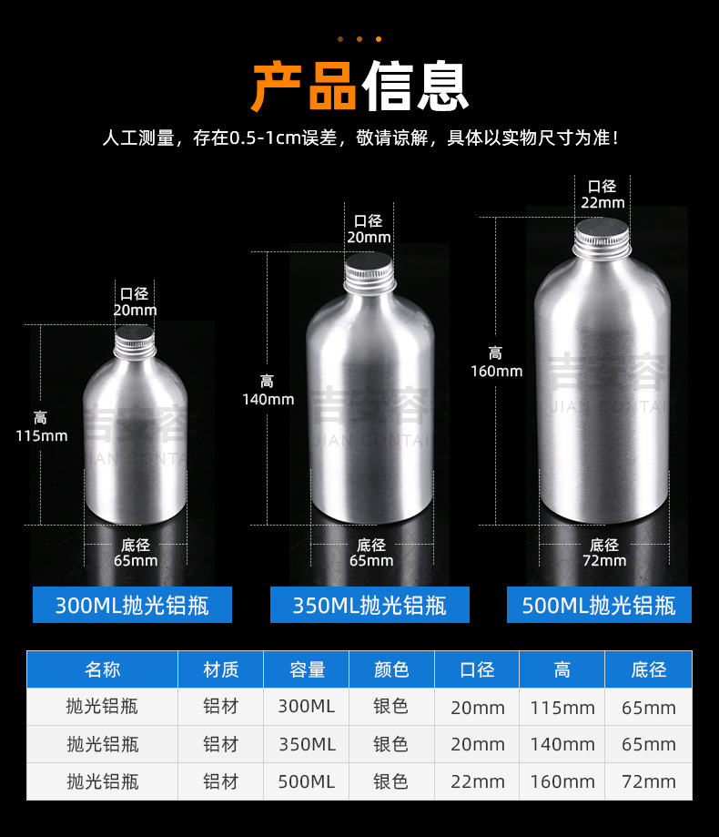 规格 300ML铝瓶,350ML铝瓶,500ML铝瓶,2000个以上(单价请咨询客服)