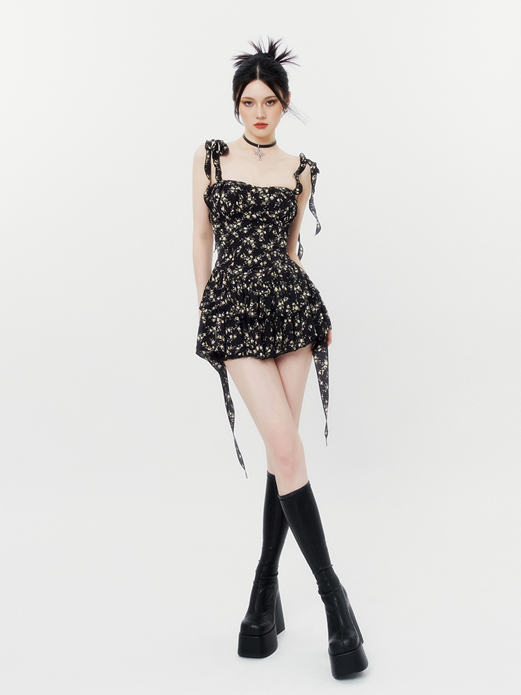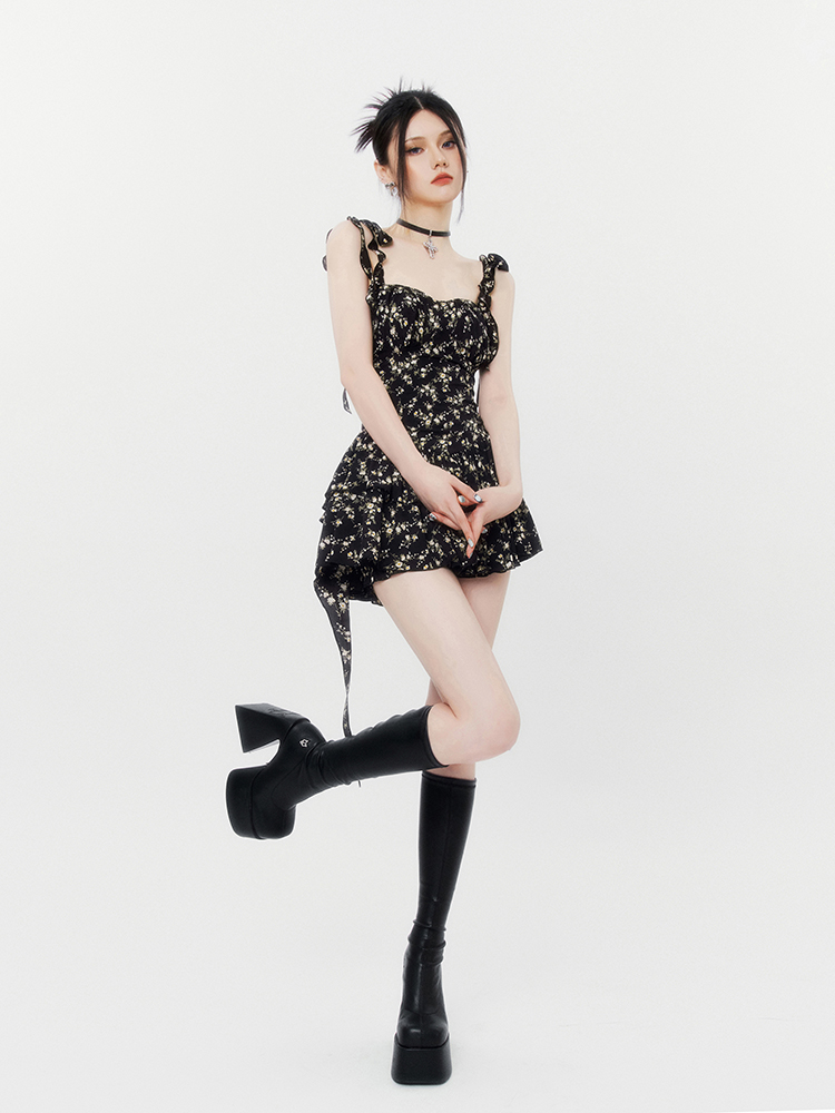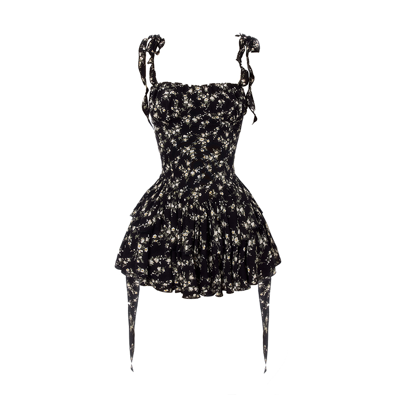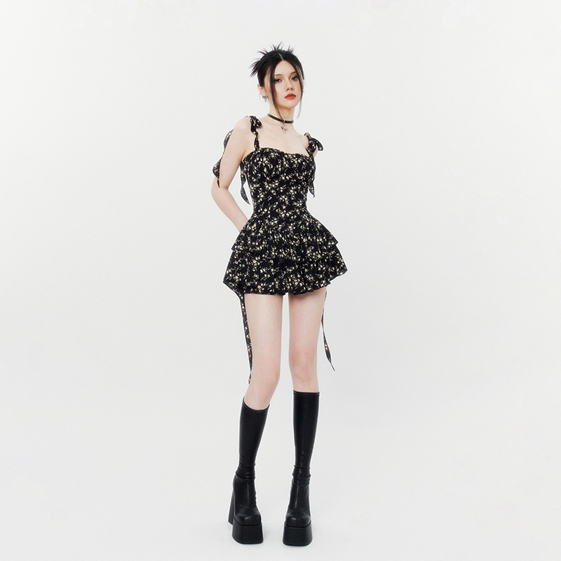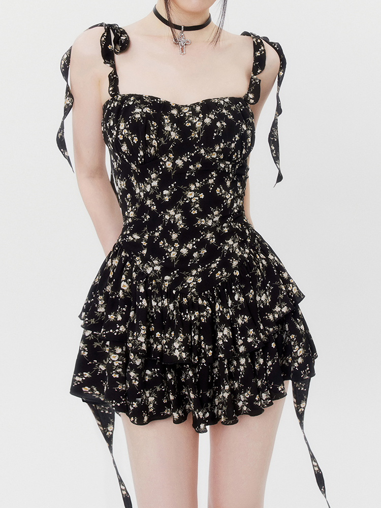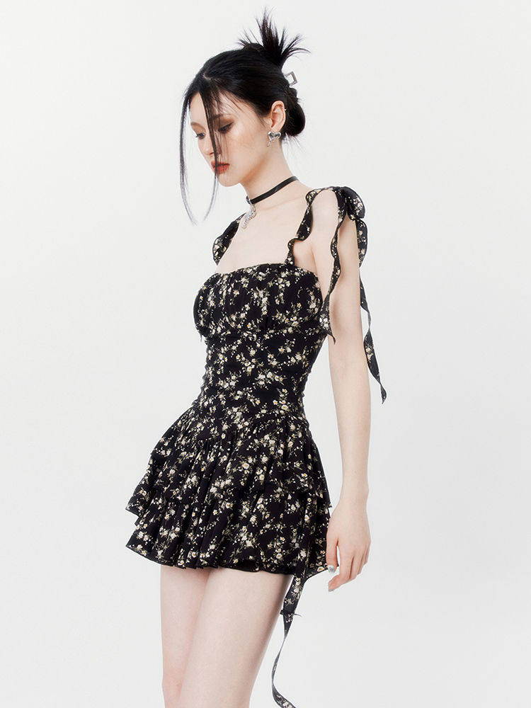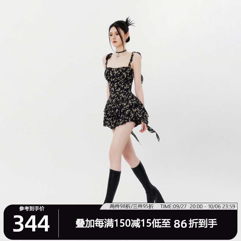 VOCK 茶歇茉莉 法式黑色碎花吊帶裙夏季純欲茶歇裙收腰顯瘦洋裝