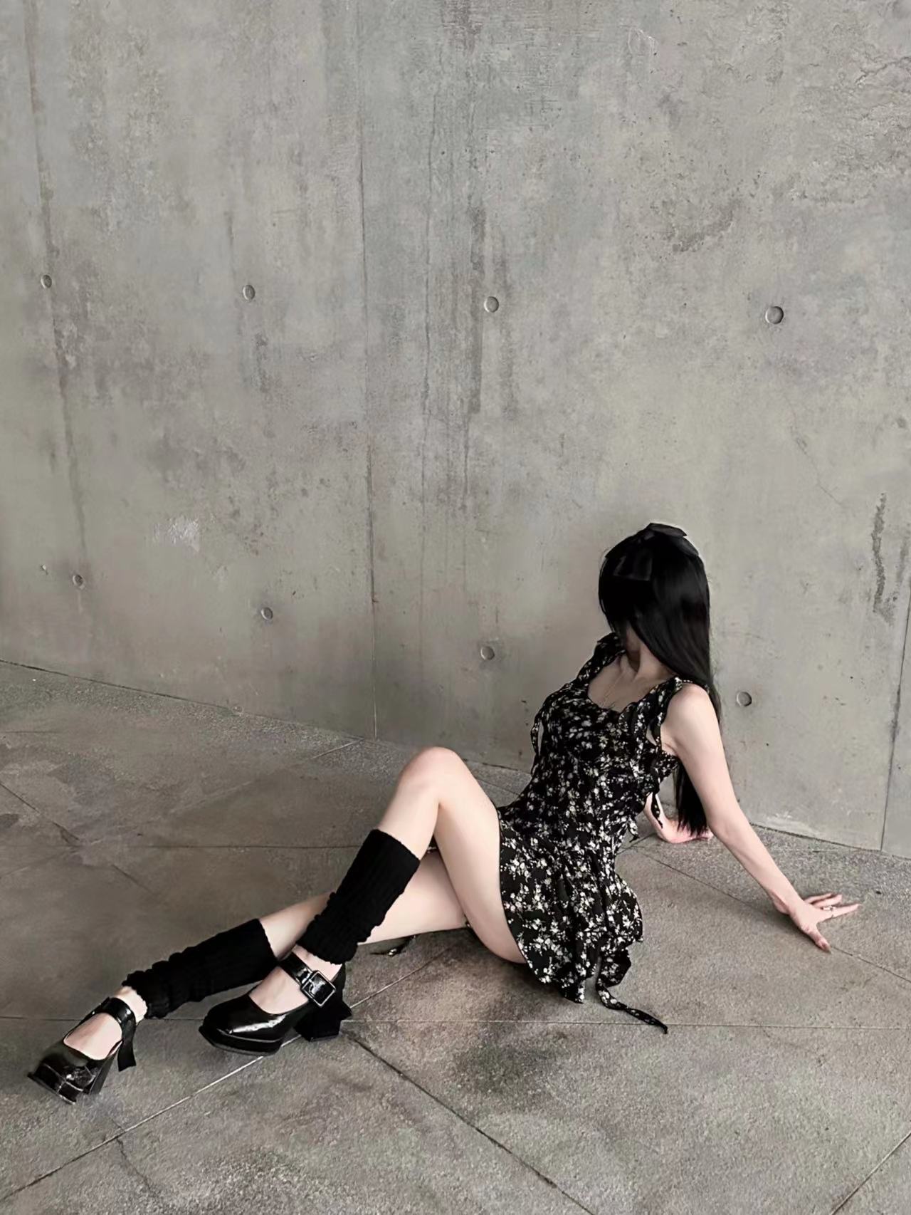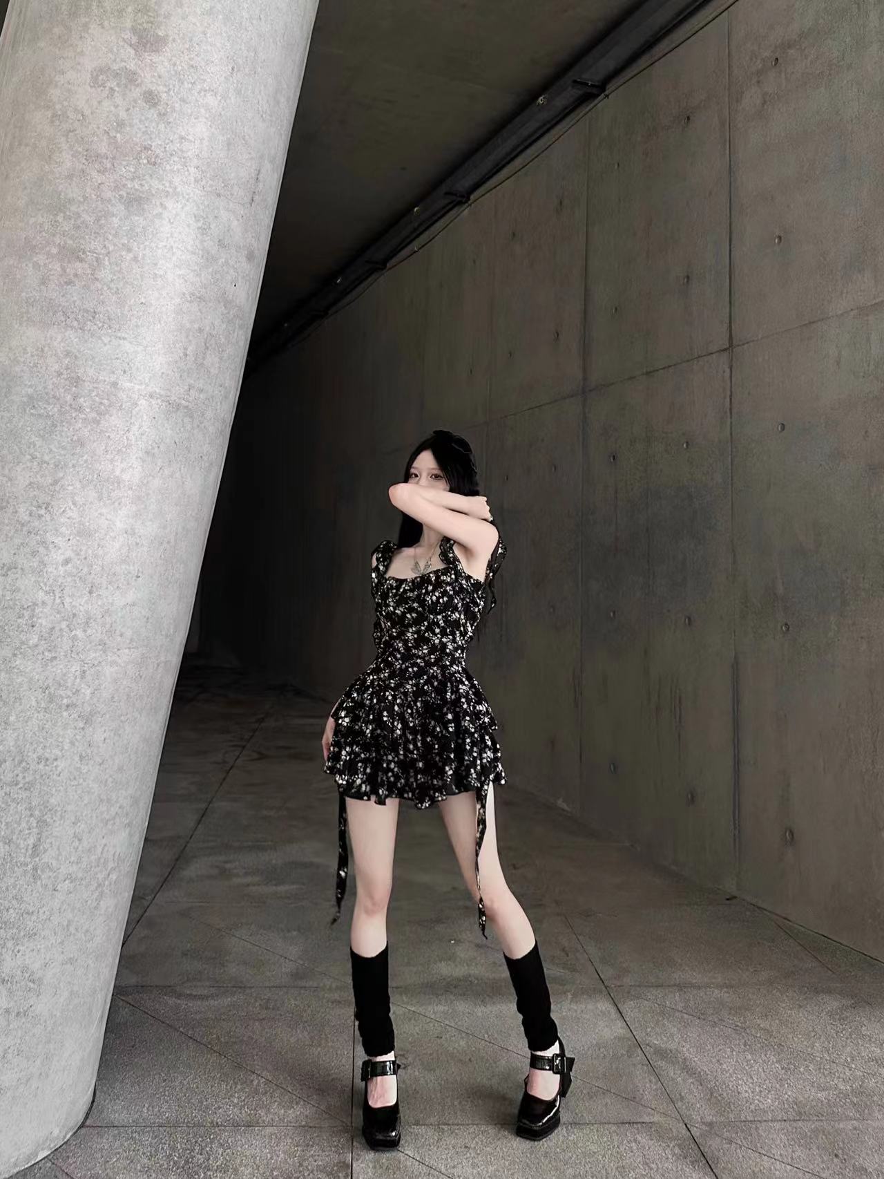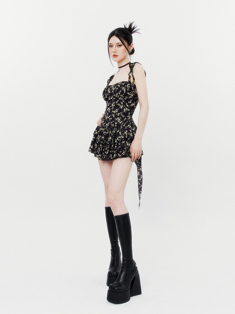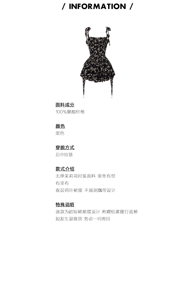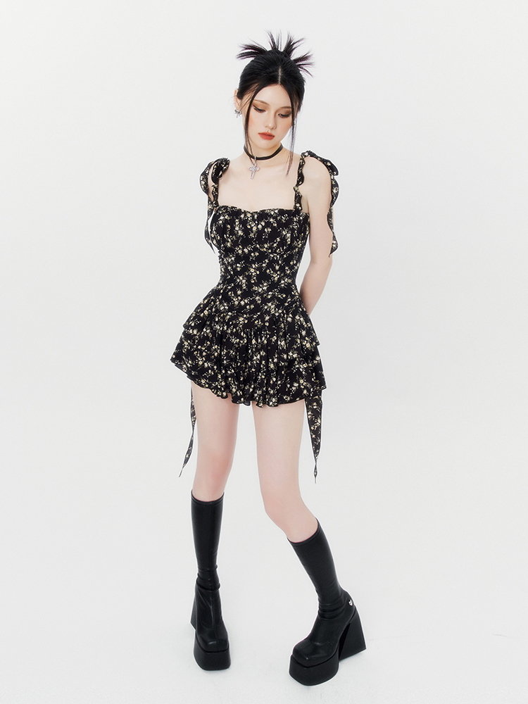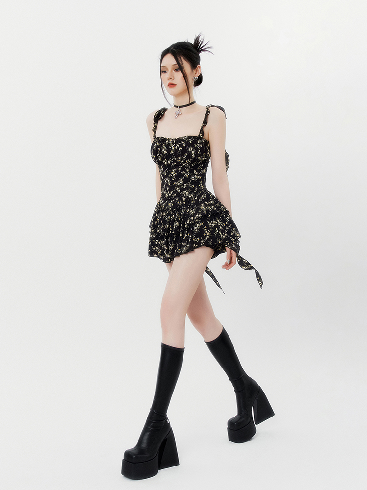 VOCK 茶歇茉莉 法式黑色碎花吊帶裙夏季純欲茶歇裙收腰顯瘦洋裝