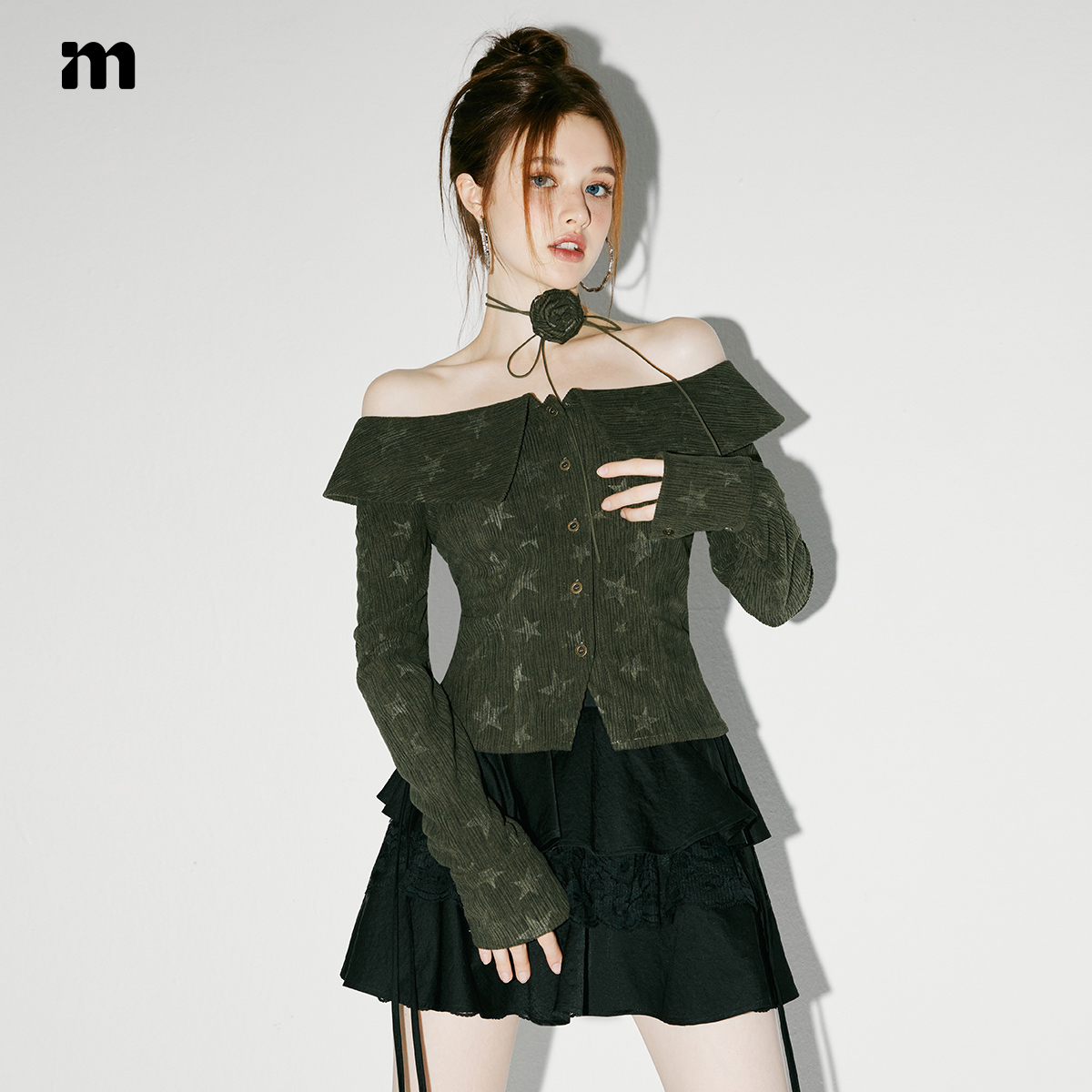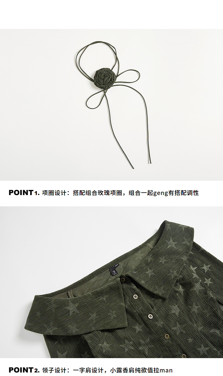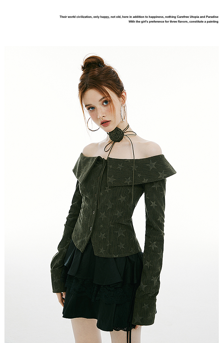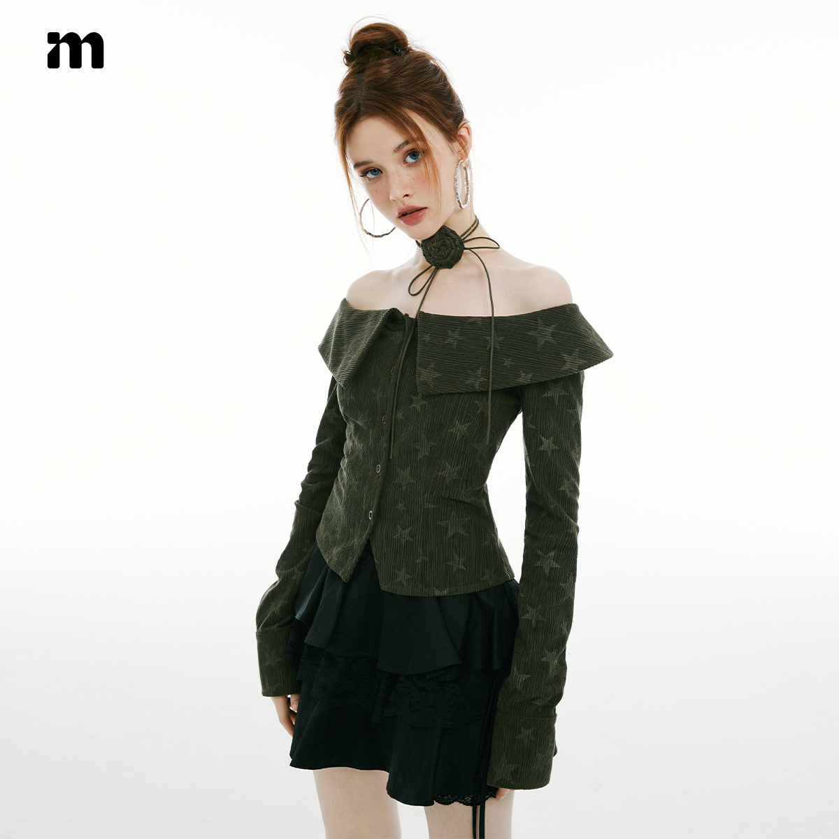 imone綠色純欲星星滿印一字肩襯衫女2023秋季新款設計感小眾上衣