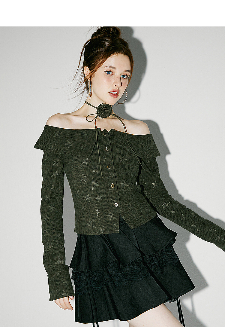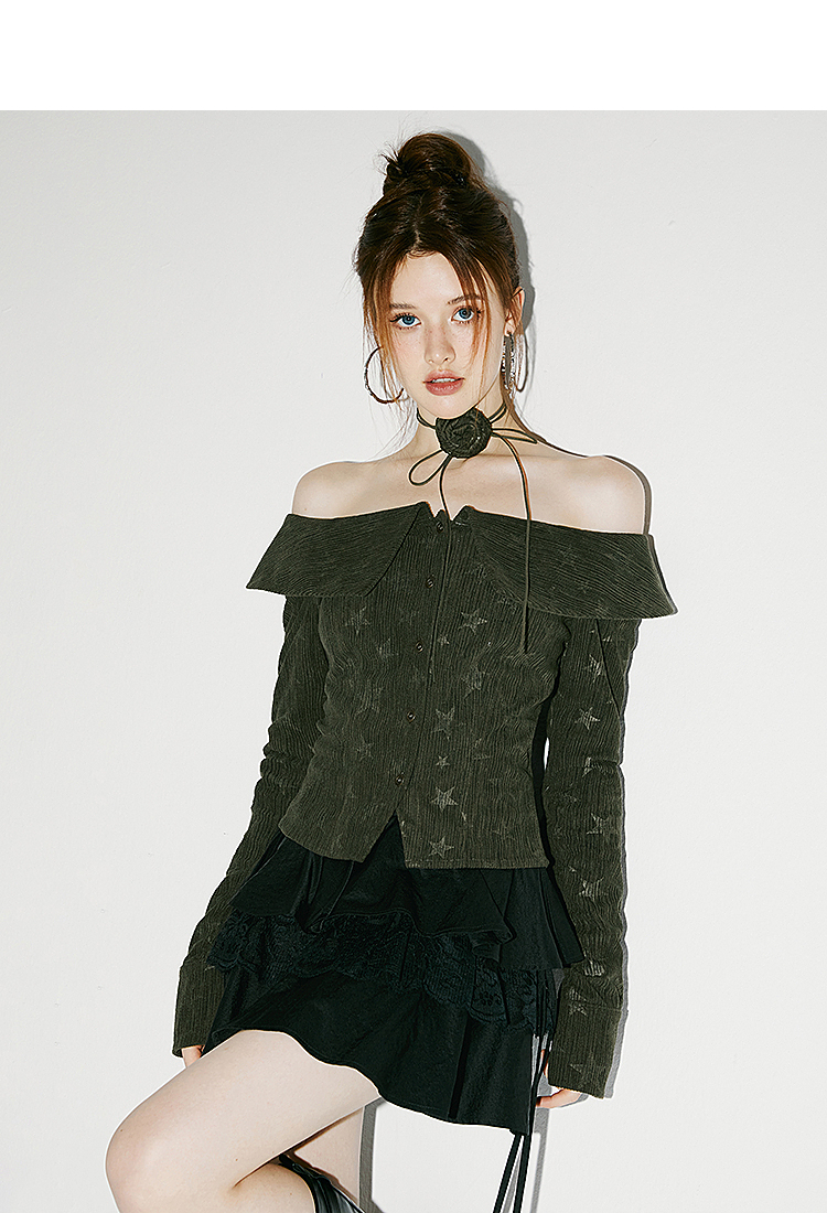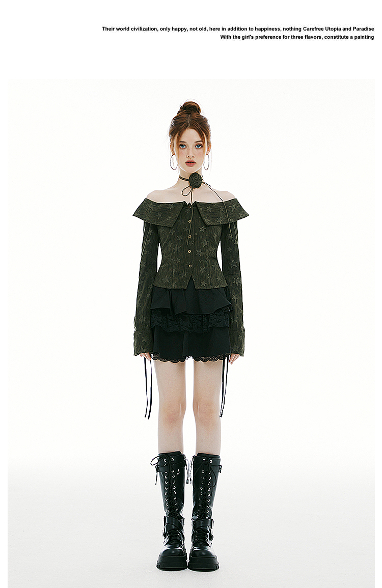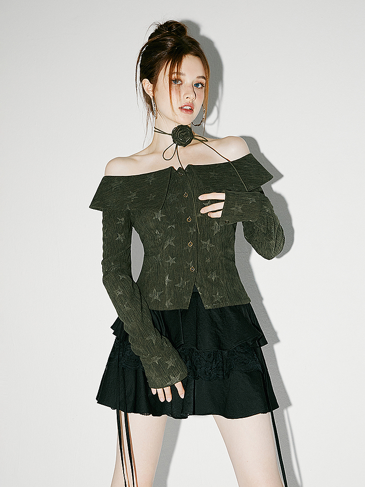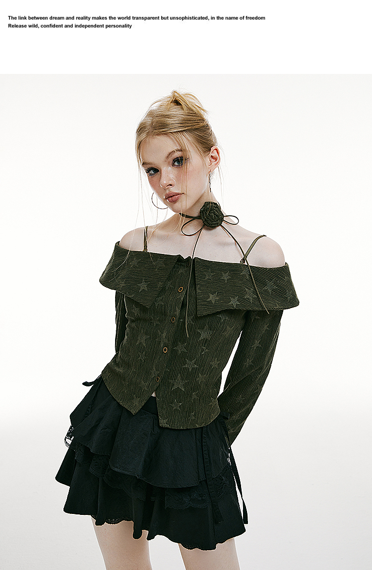 imone綠色純欲星星滿印一字肩襯衫女2023秋季新款設計感小眾上衣