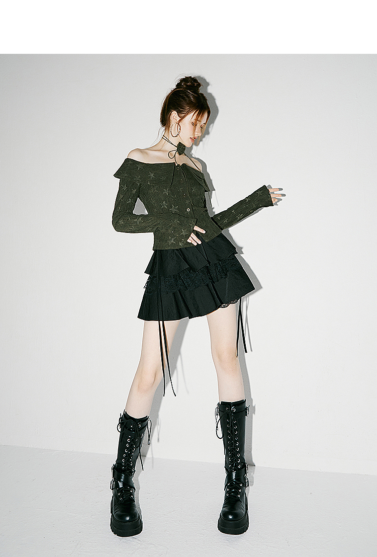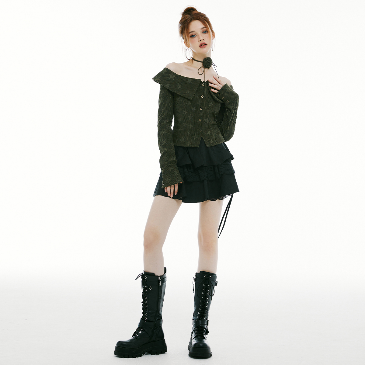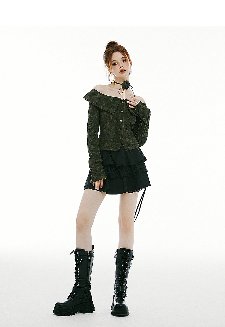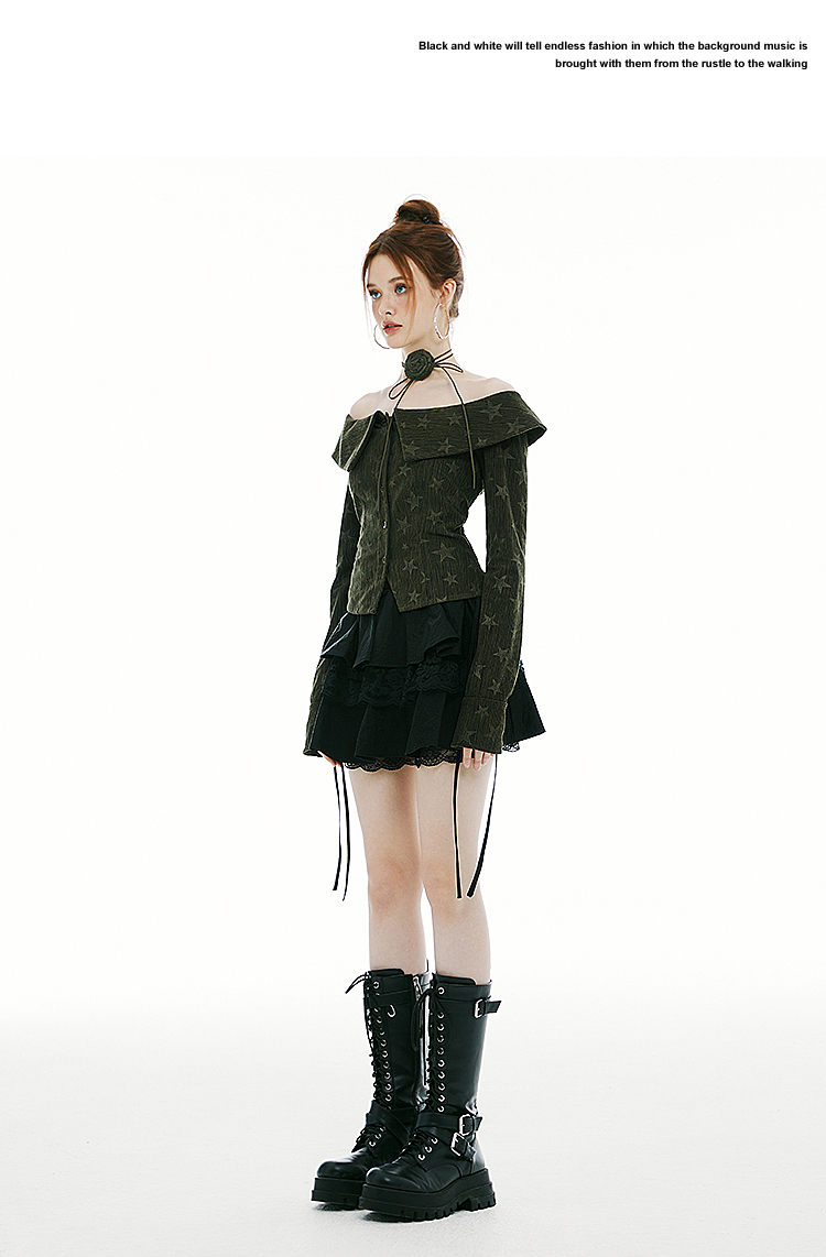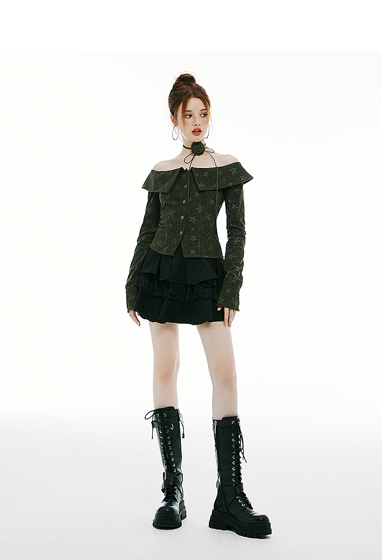 imone綠色純欲星星滿印一字肩襯衫女2023秋季新款設計感小眾上衣