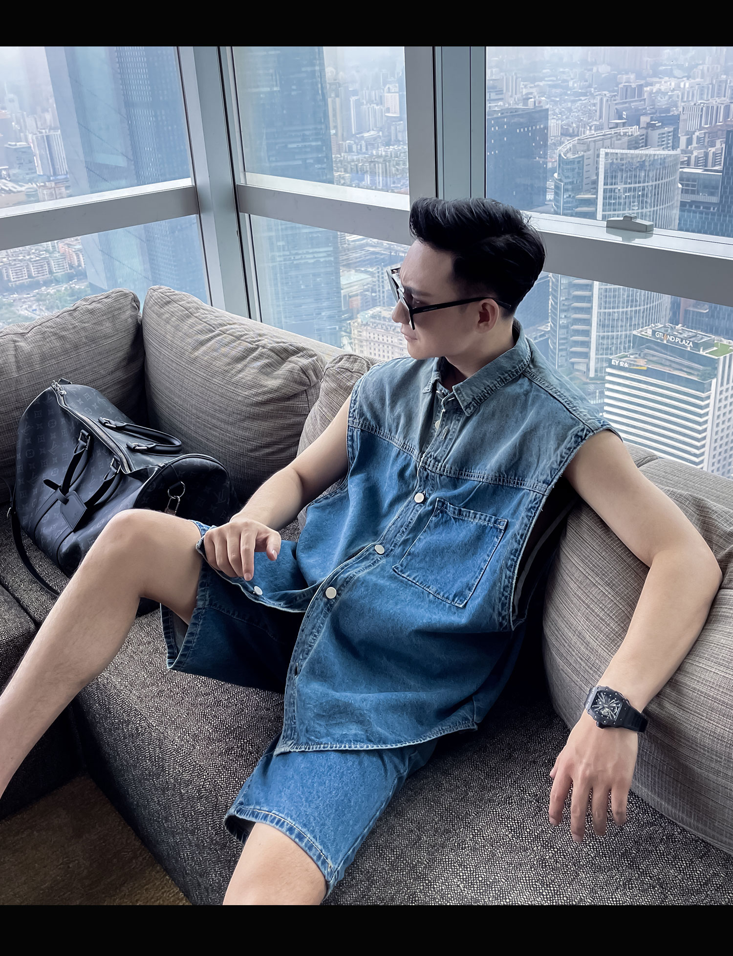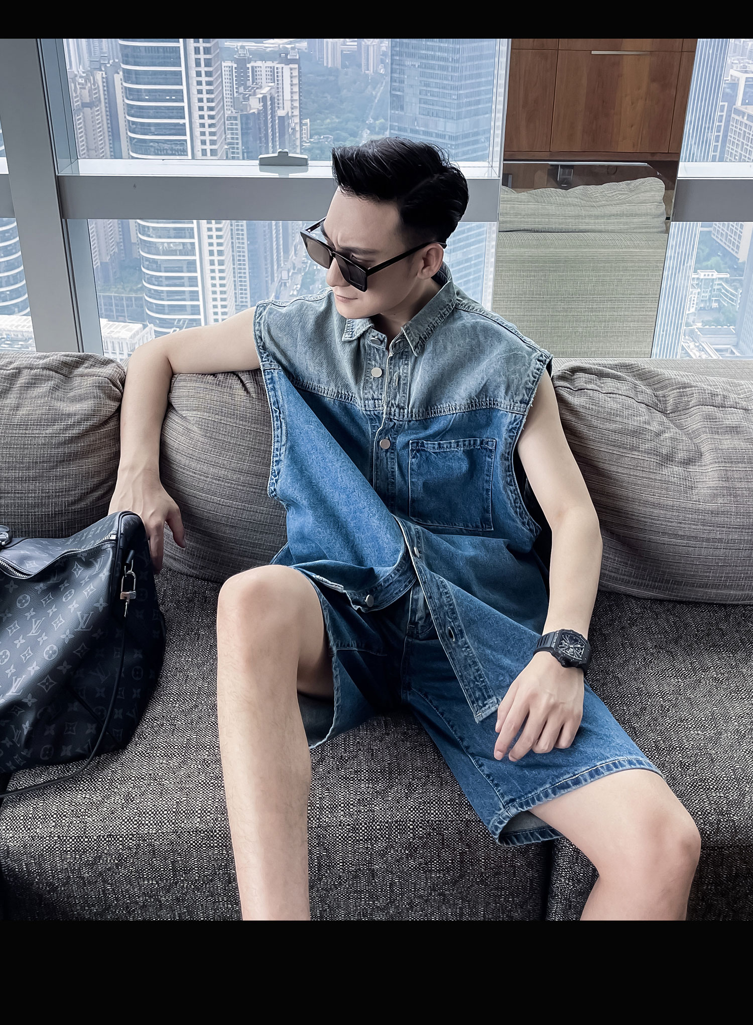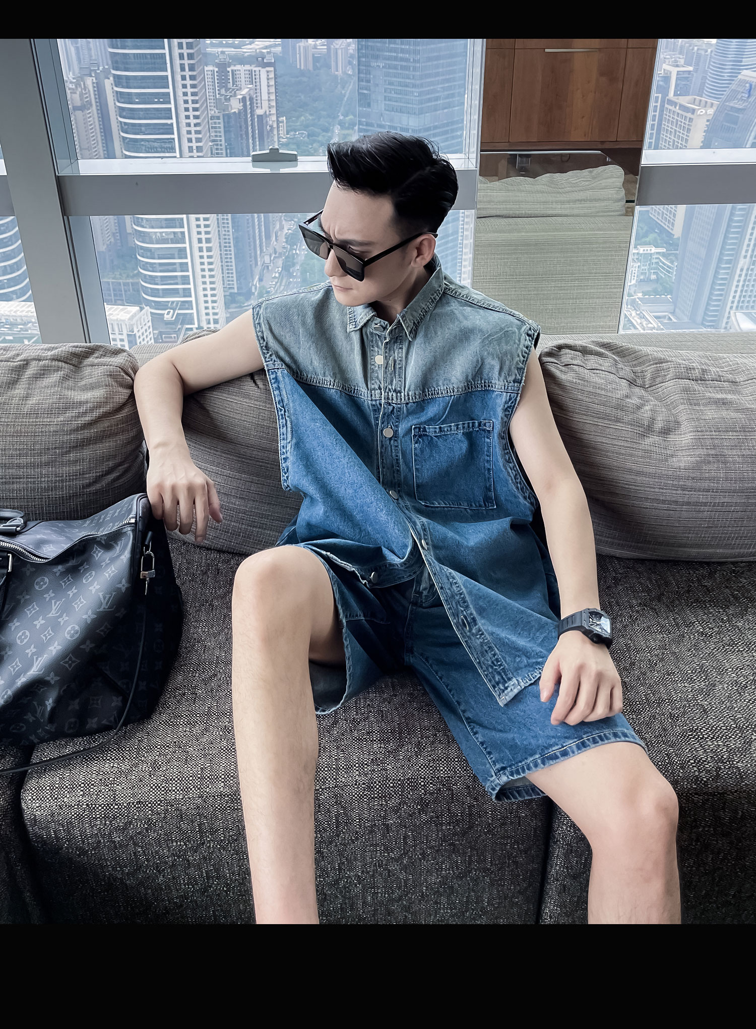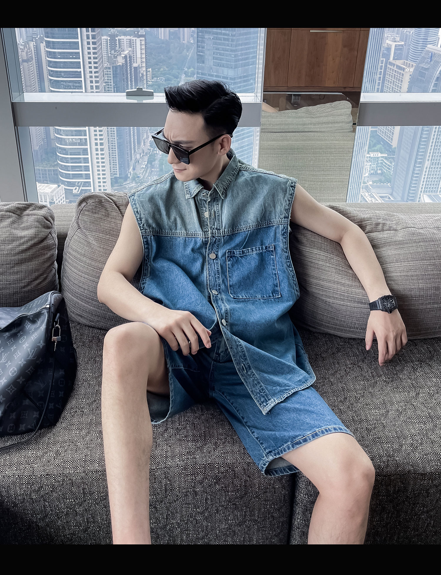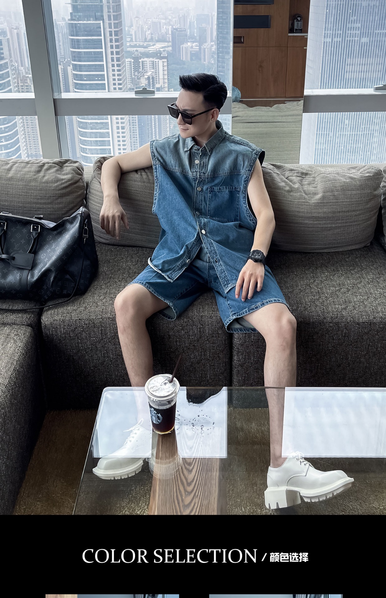 【DAIO ETHAN】原創設計洗水無袖短褲休閒牛仔套裝潮酷感男背心夏