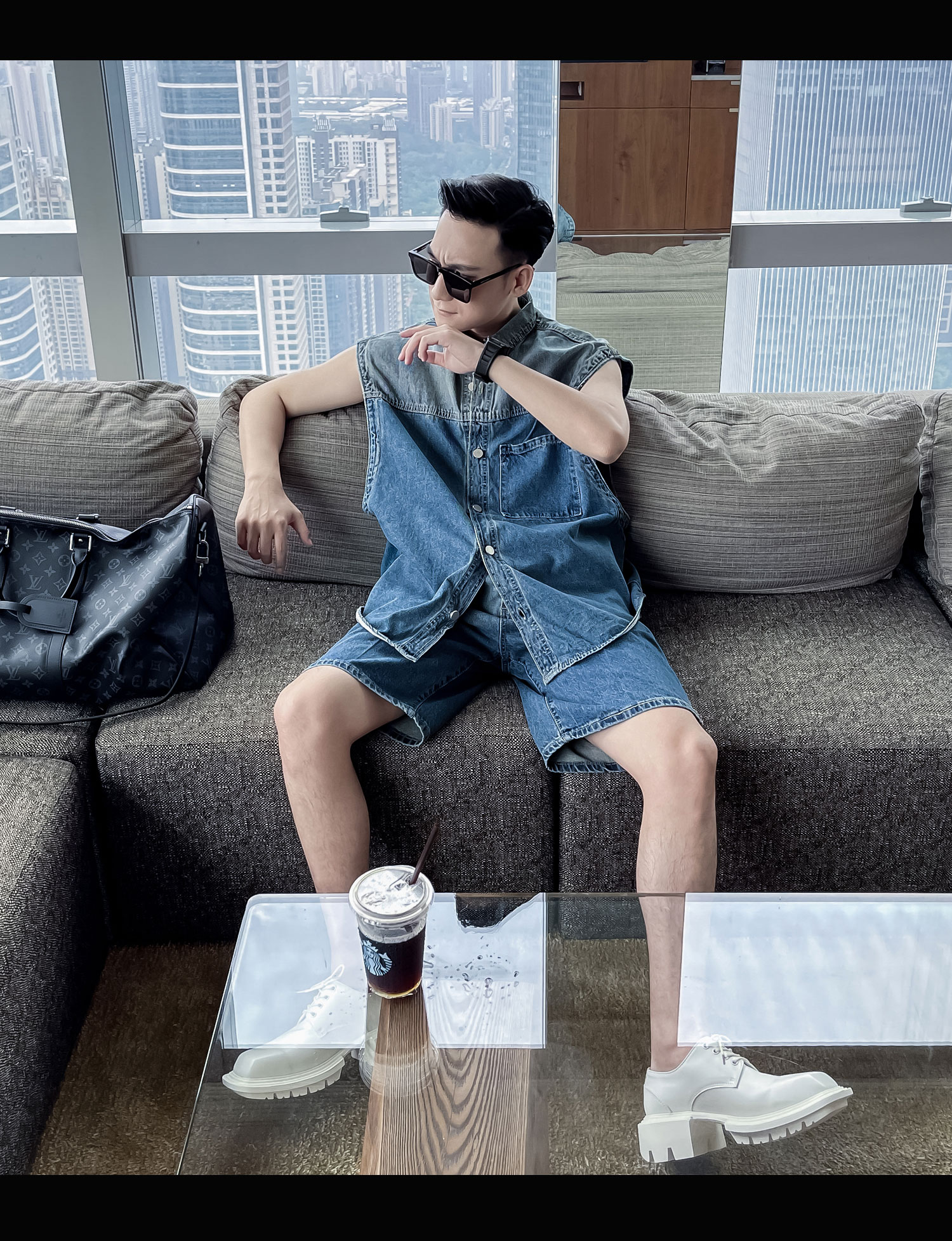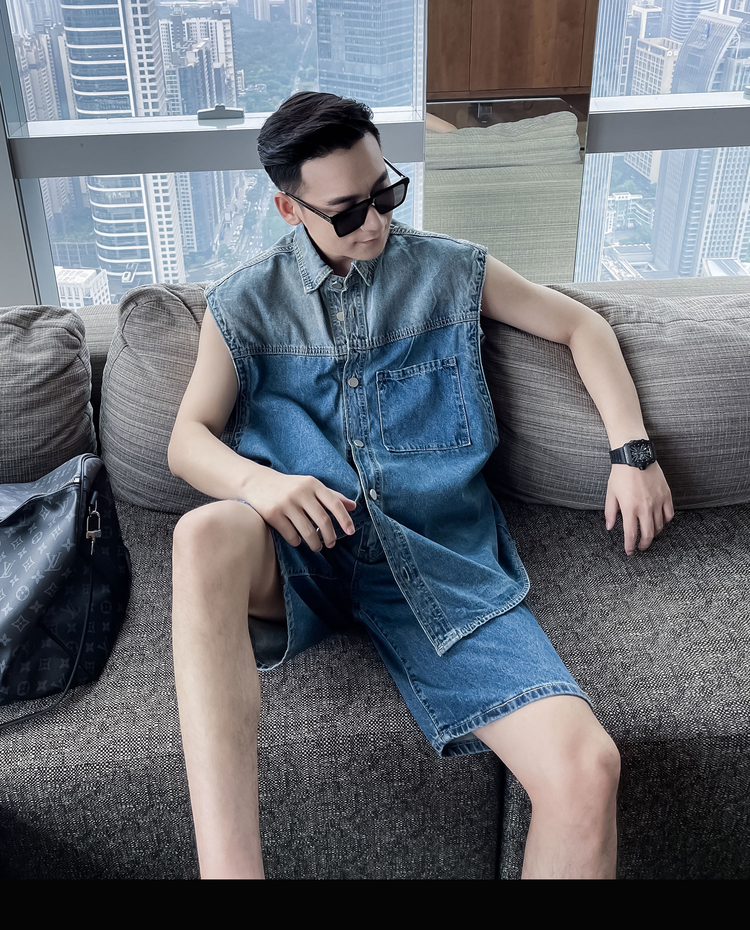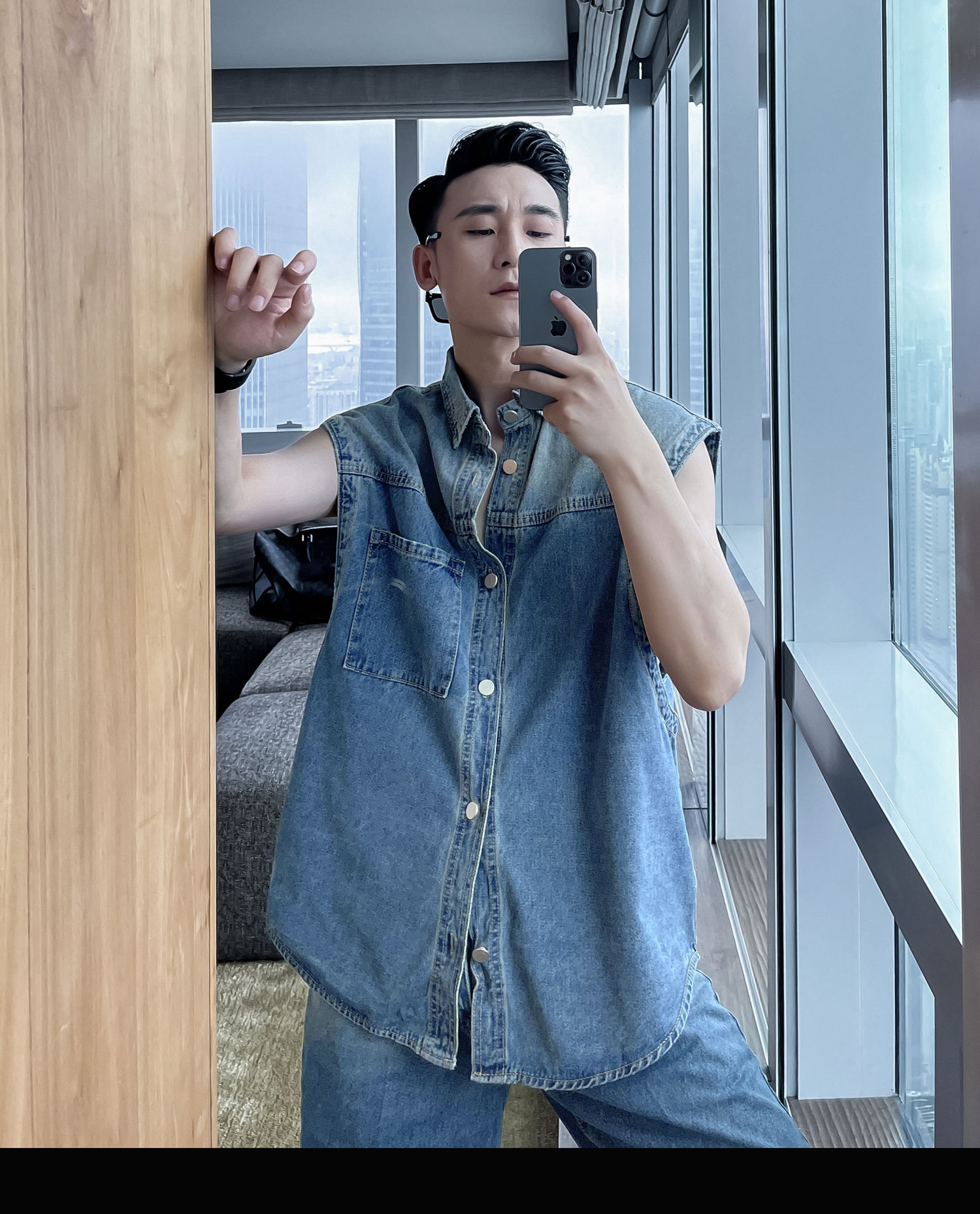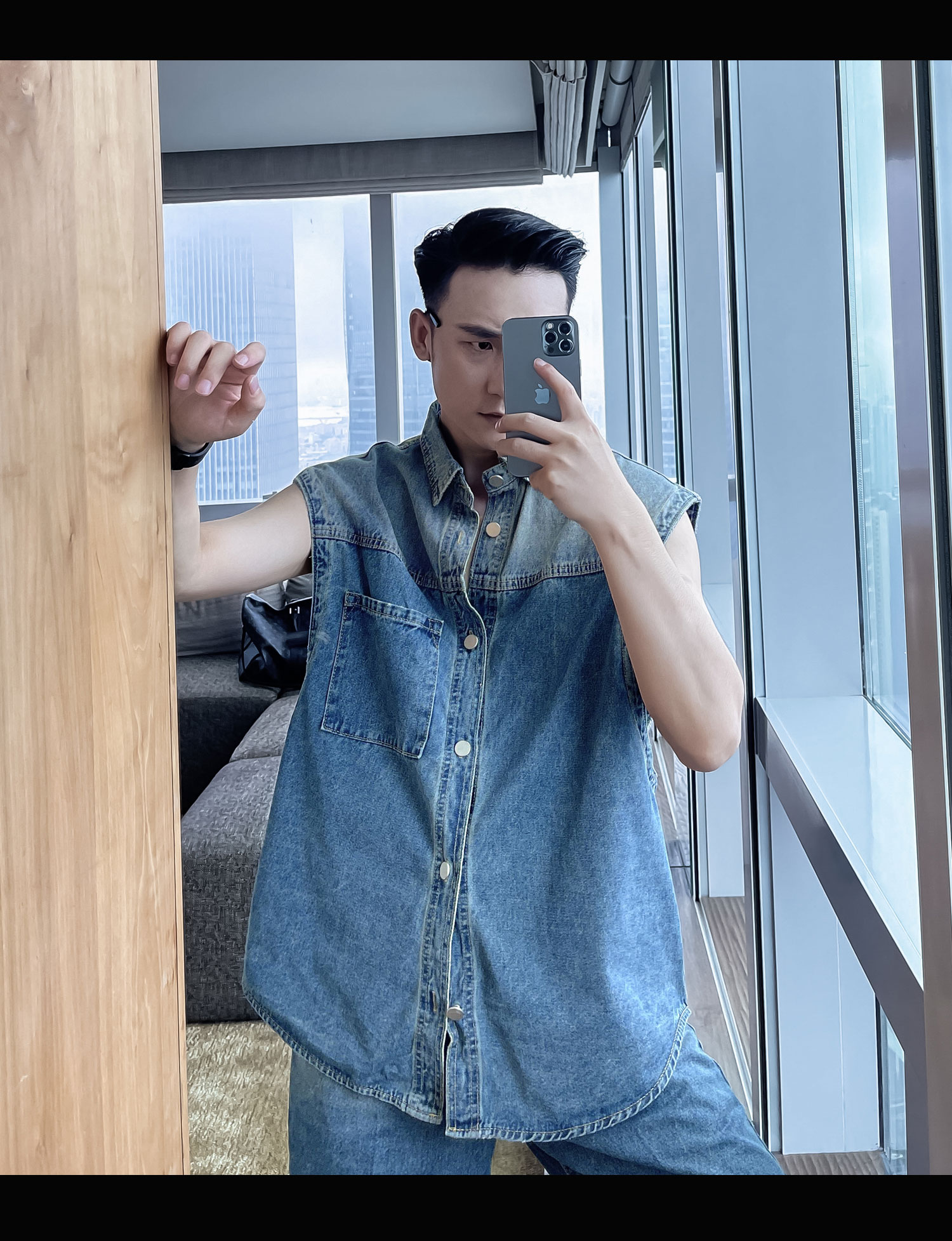【DAIO ETHAN】原創設計洗水無袖短褲休閒牛仔套裝潮酷感男背心夏