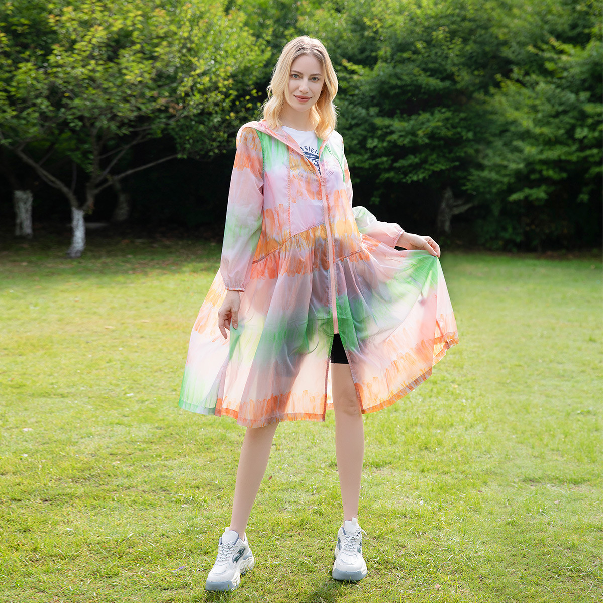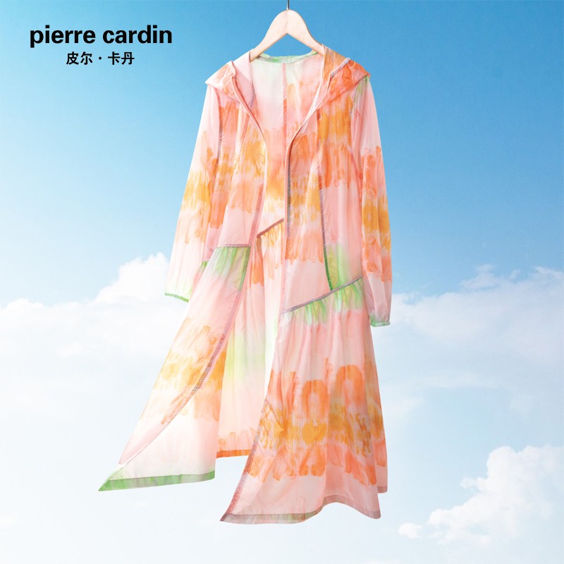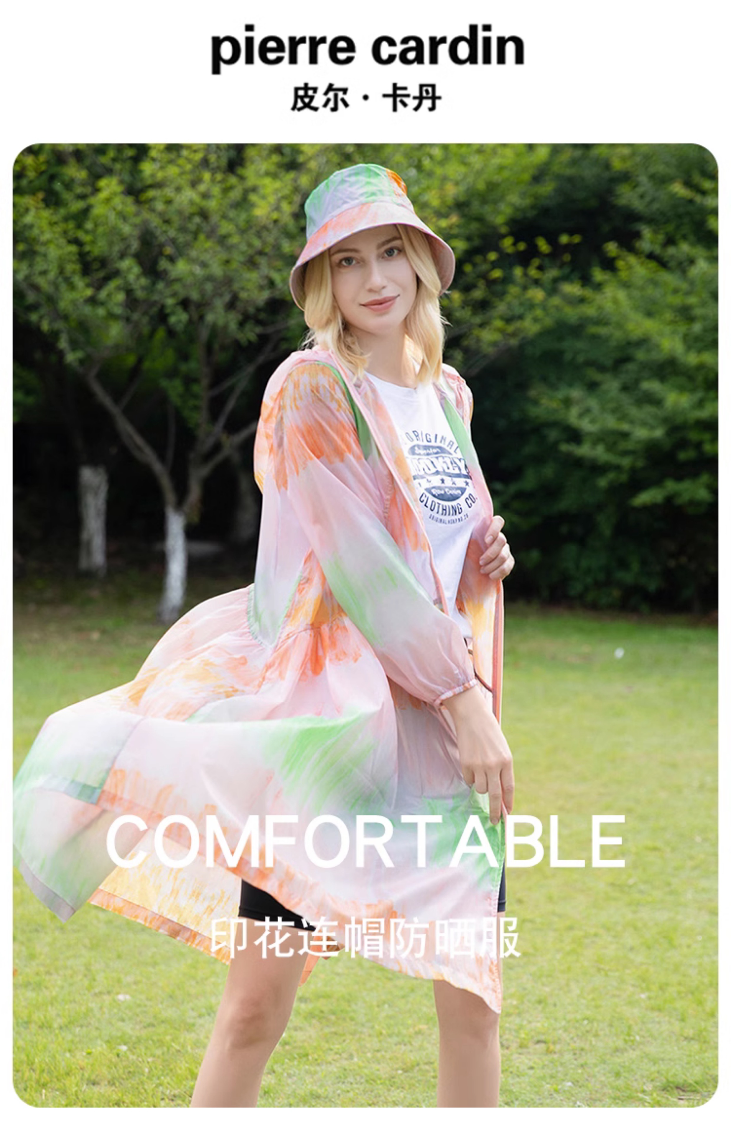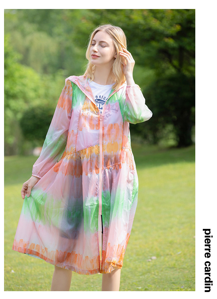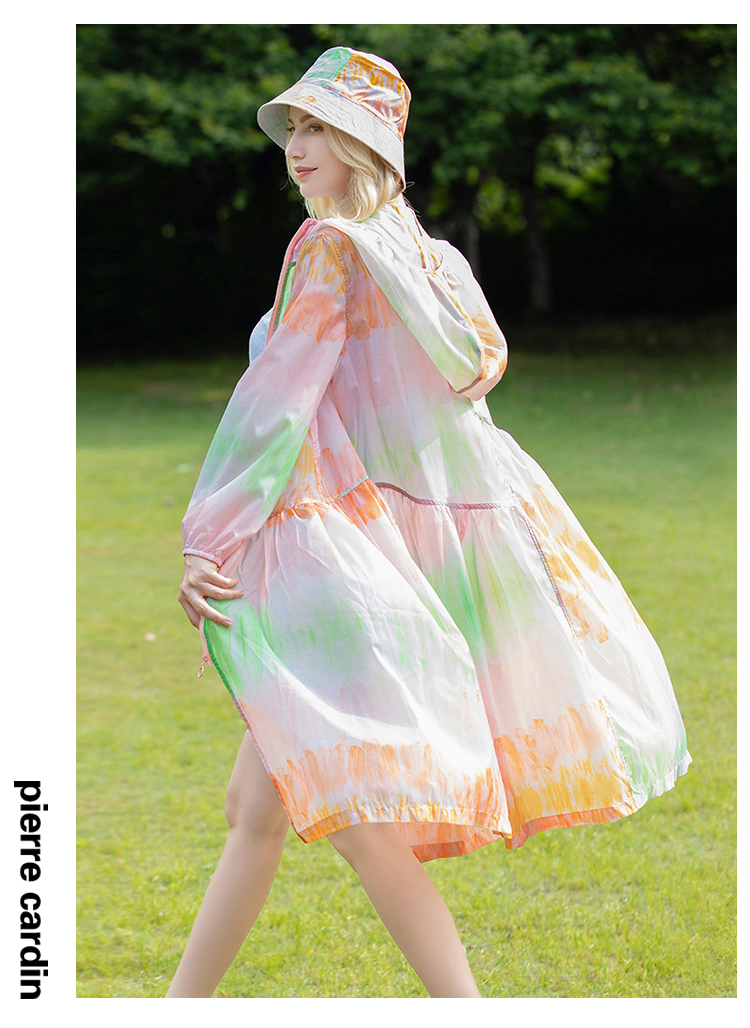 皮爾卡登活力印花防曬衣女中長版2023新款夏A型寬鬆連帽防曬外套