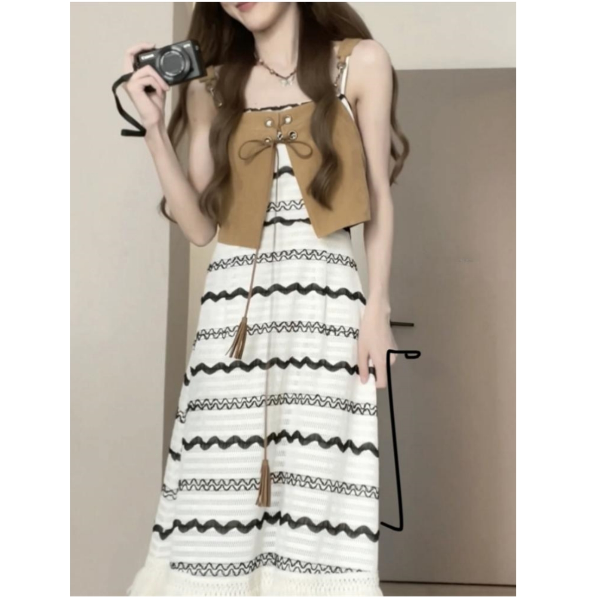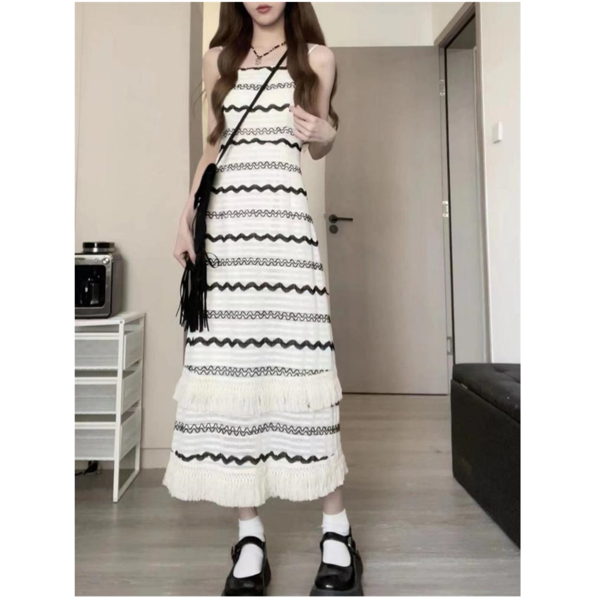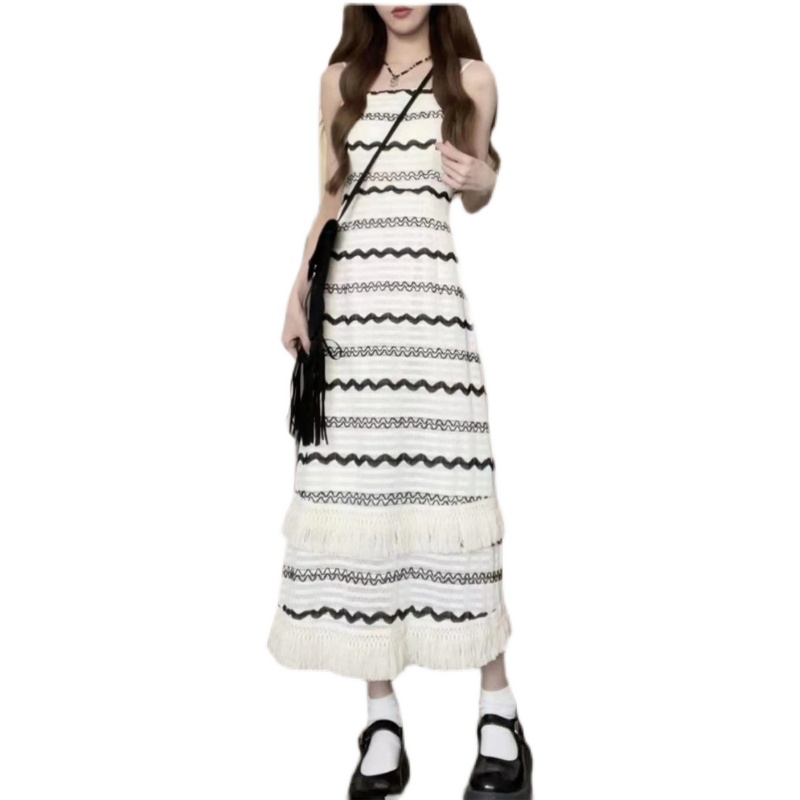 黑色波浪紋流蘇吊帶洋裝女夏季法式復古小個子過膝長裙顯瘦裙子