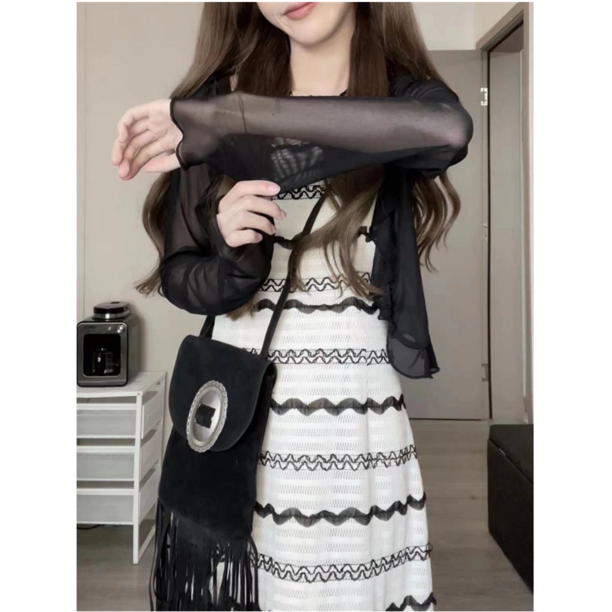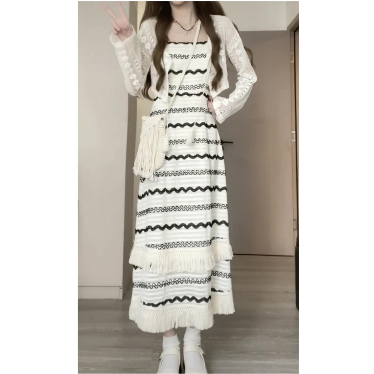 顏色分類 條紋吊帶裙,白色開衫,黑色開衫