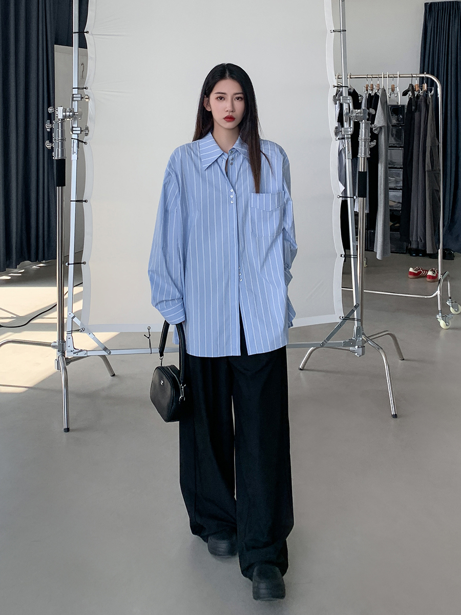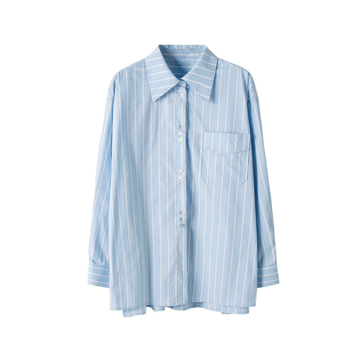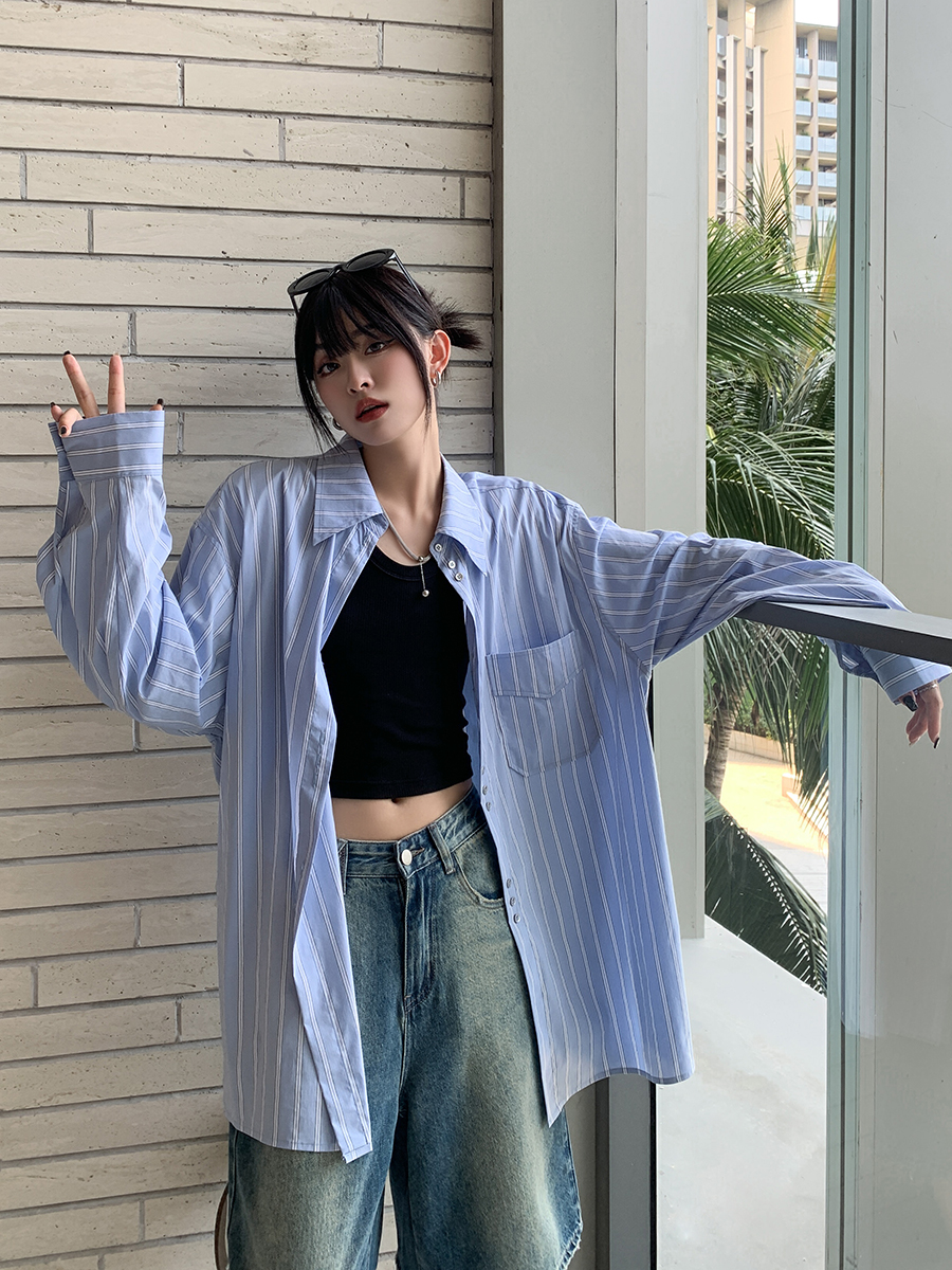 SIXI四喜家春夏 小銀扣條紋襯衫女寬鬆設計感開叉大版襯衫薄外套