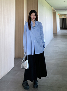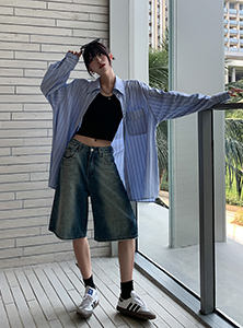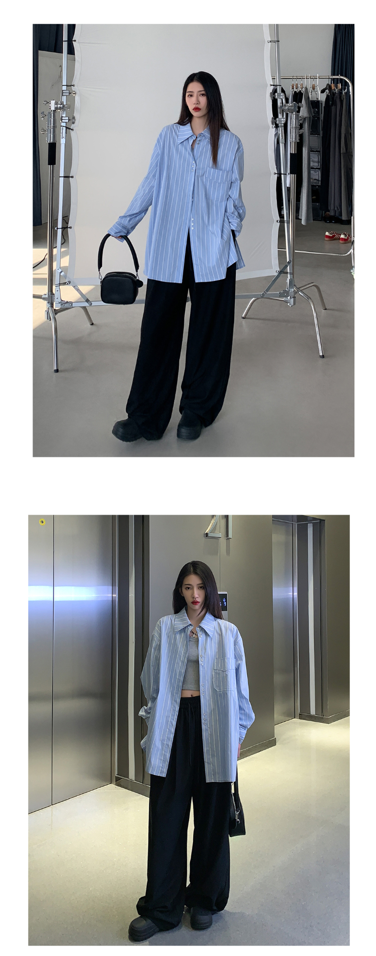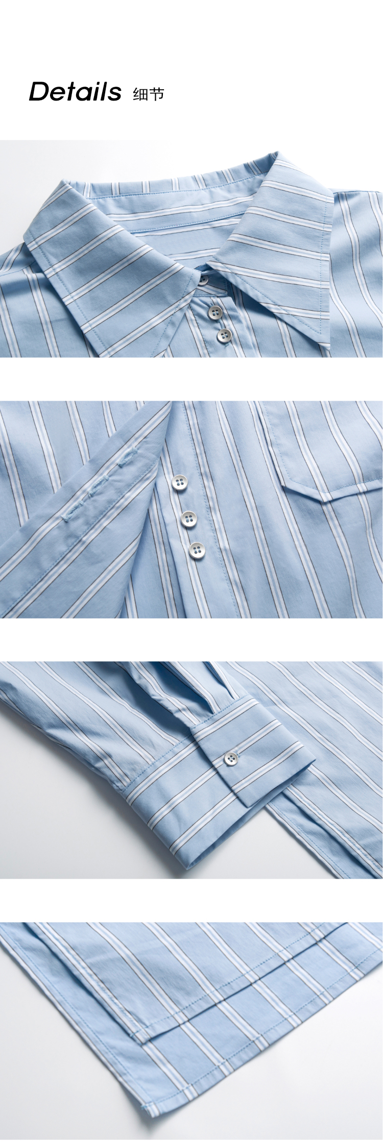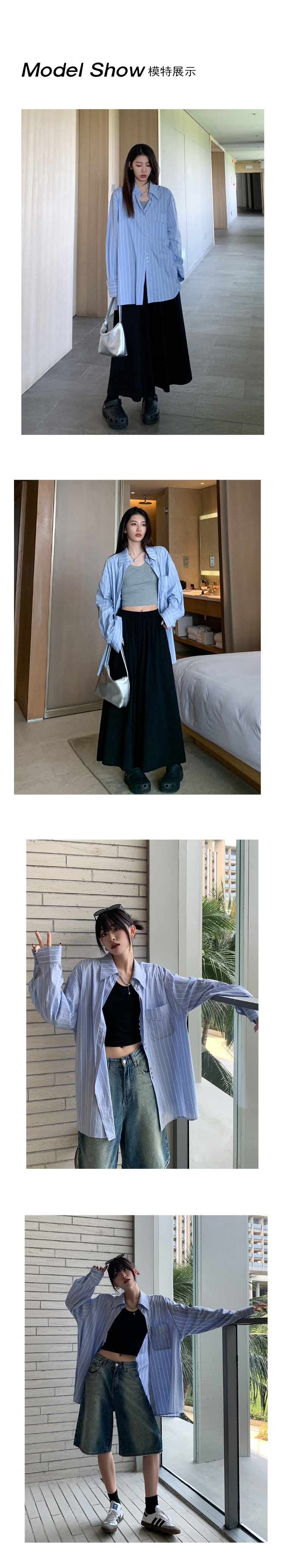 SIXI四喜家春夏 小銀扣條紋襯衫女寬鬆設計感開叉大版襯衫薄外套