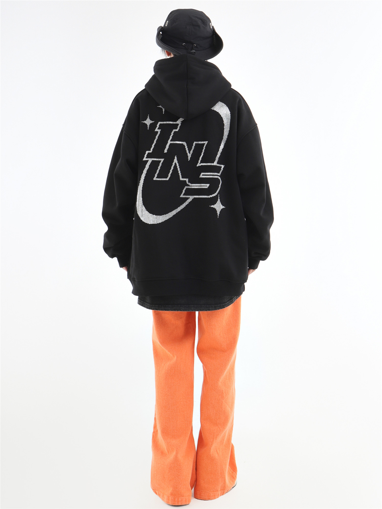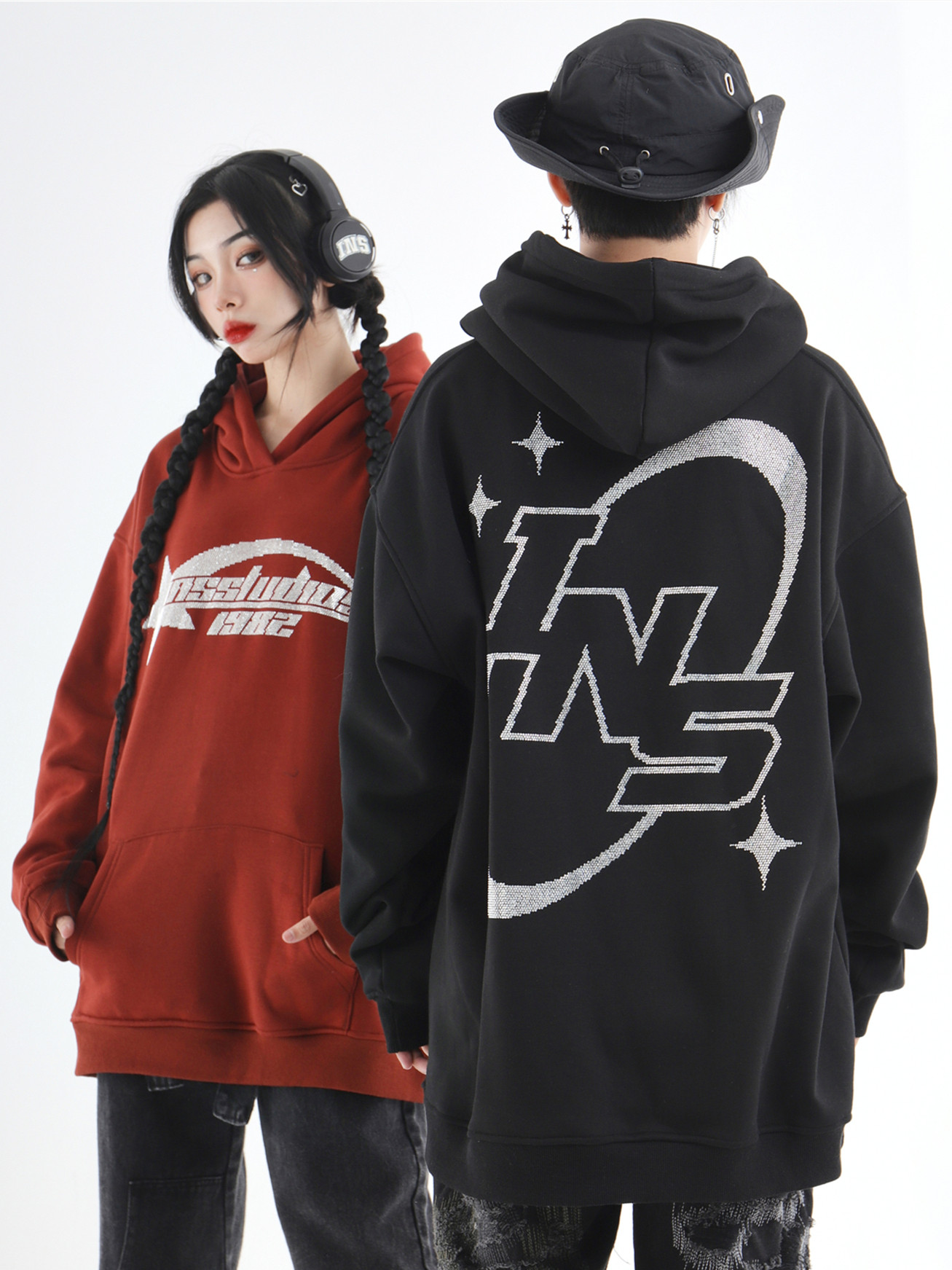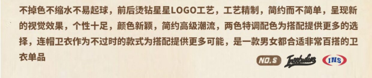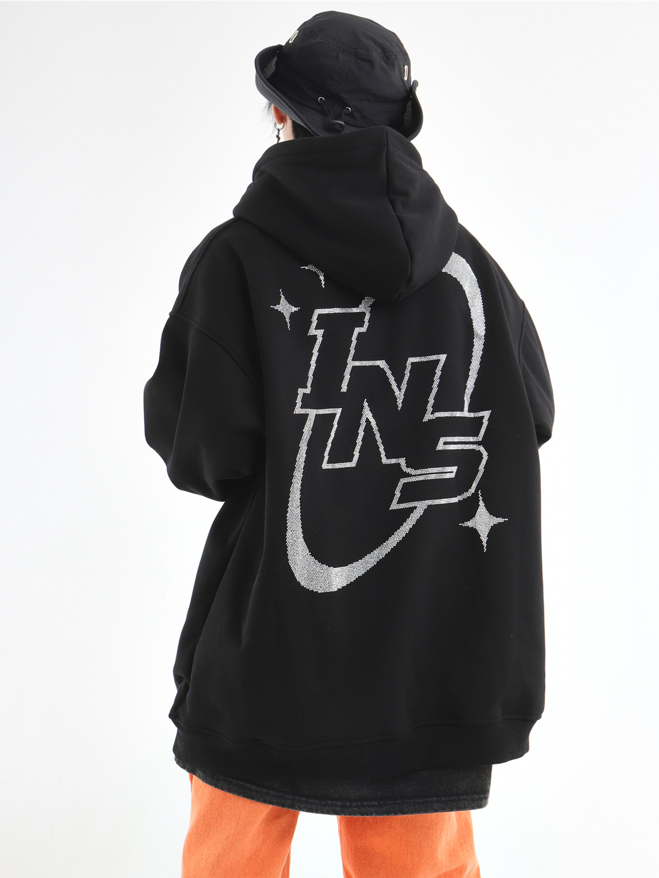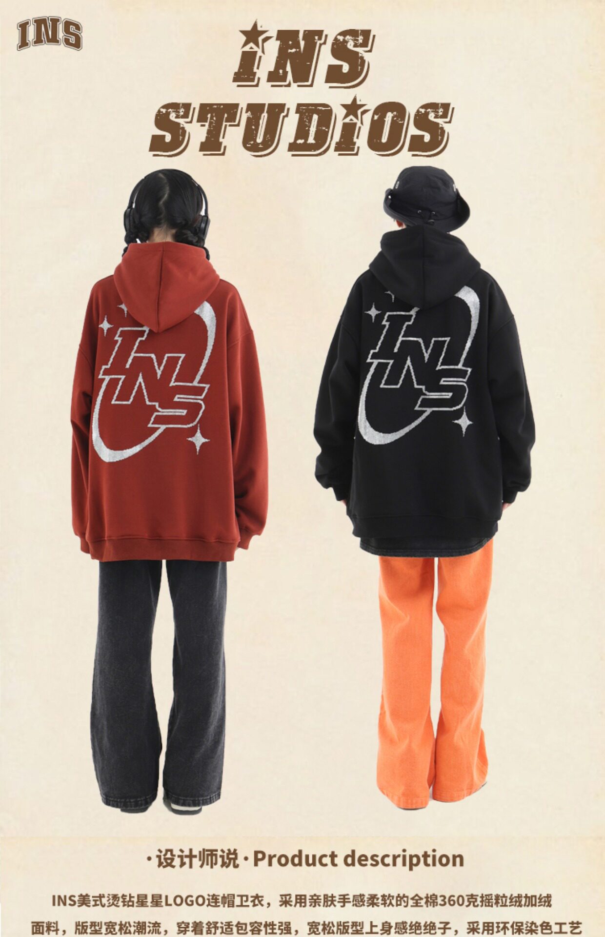 INSstudios 國潮牌情侶美式復古燙鑽星星LOGO衛衣寬鬆加絨連帽衫