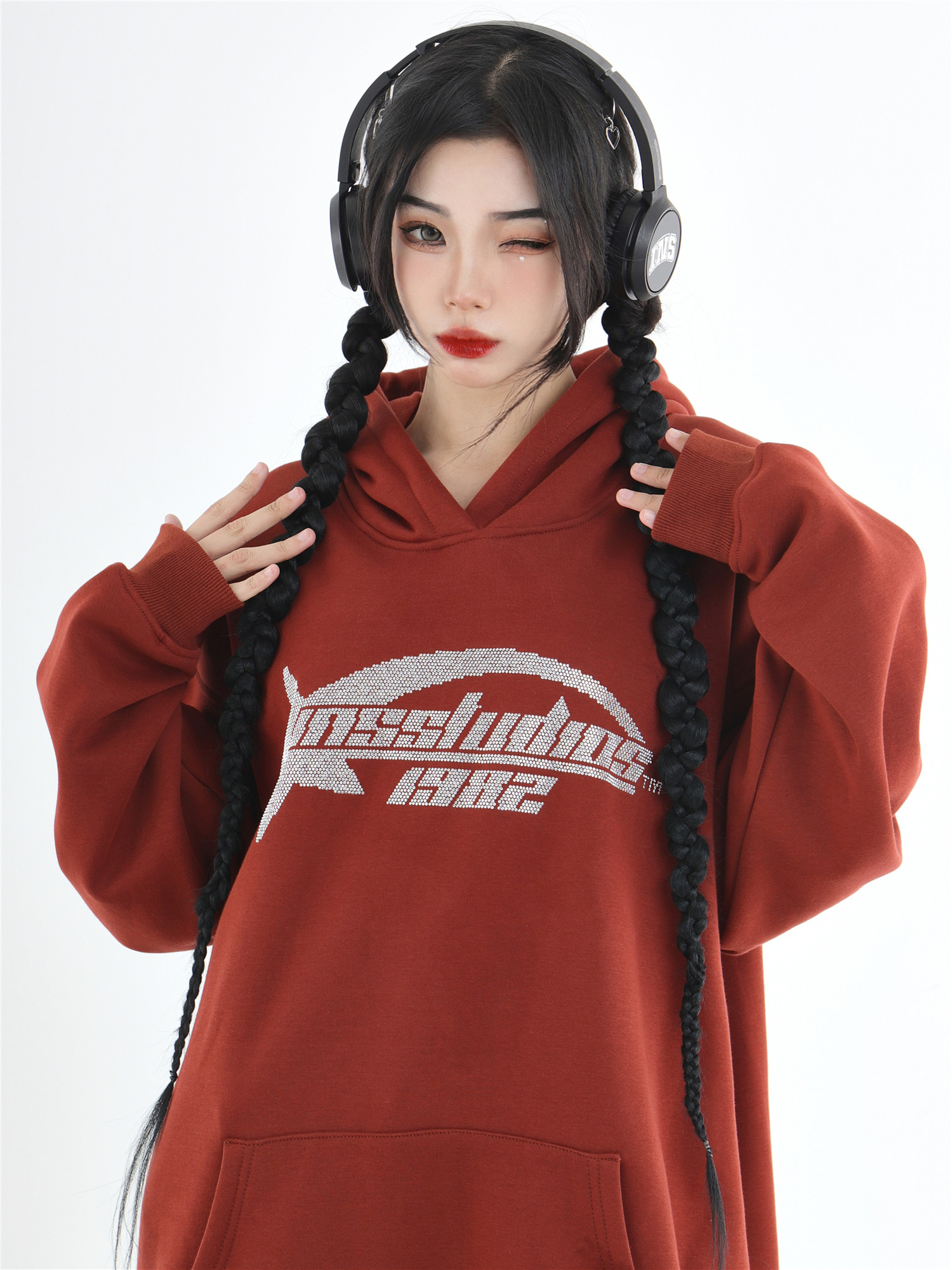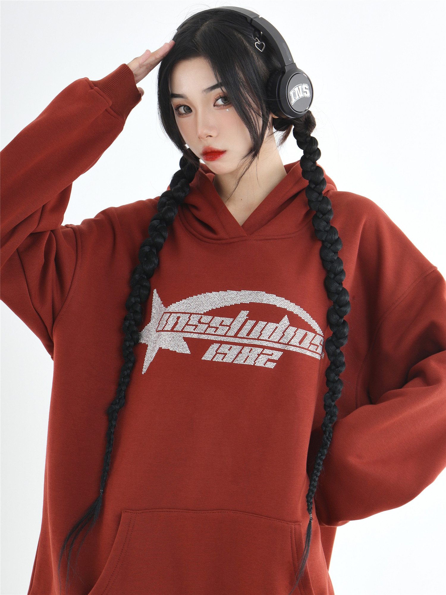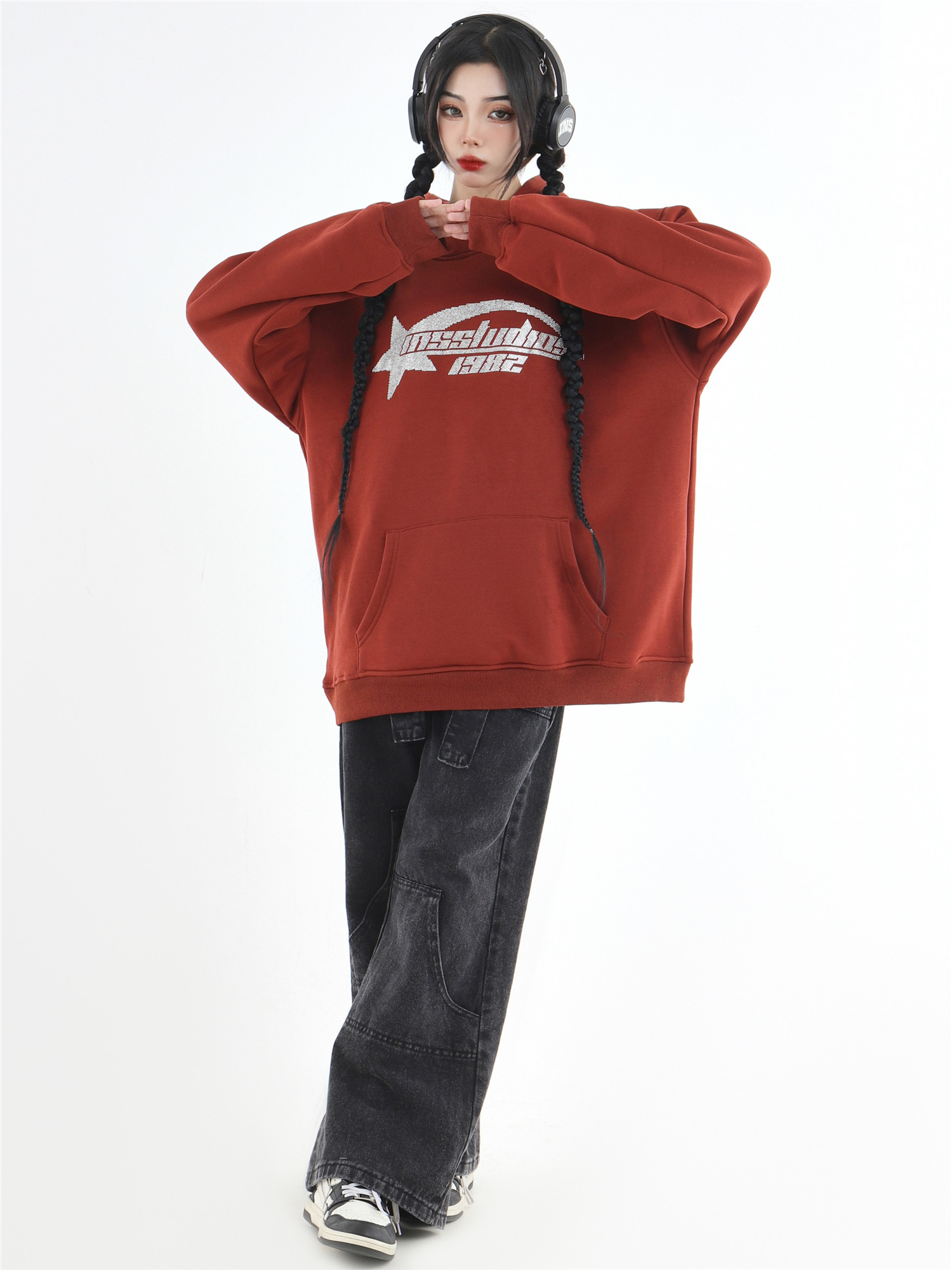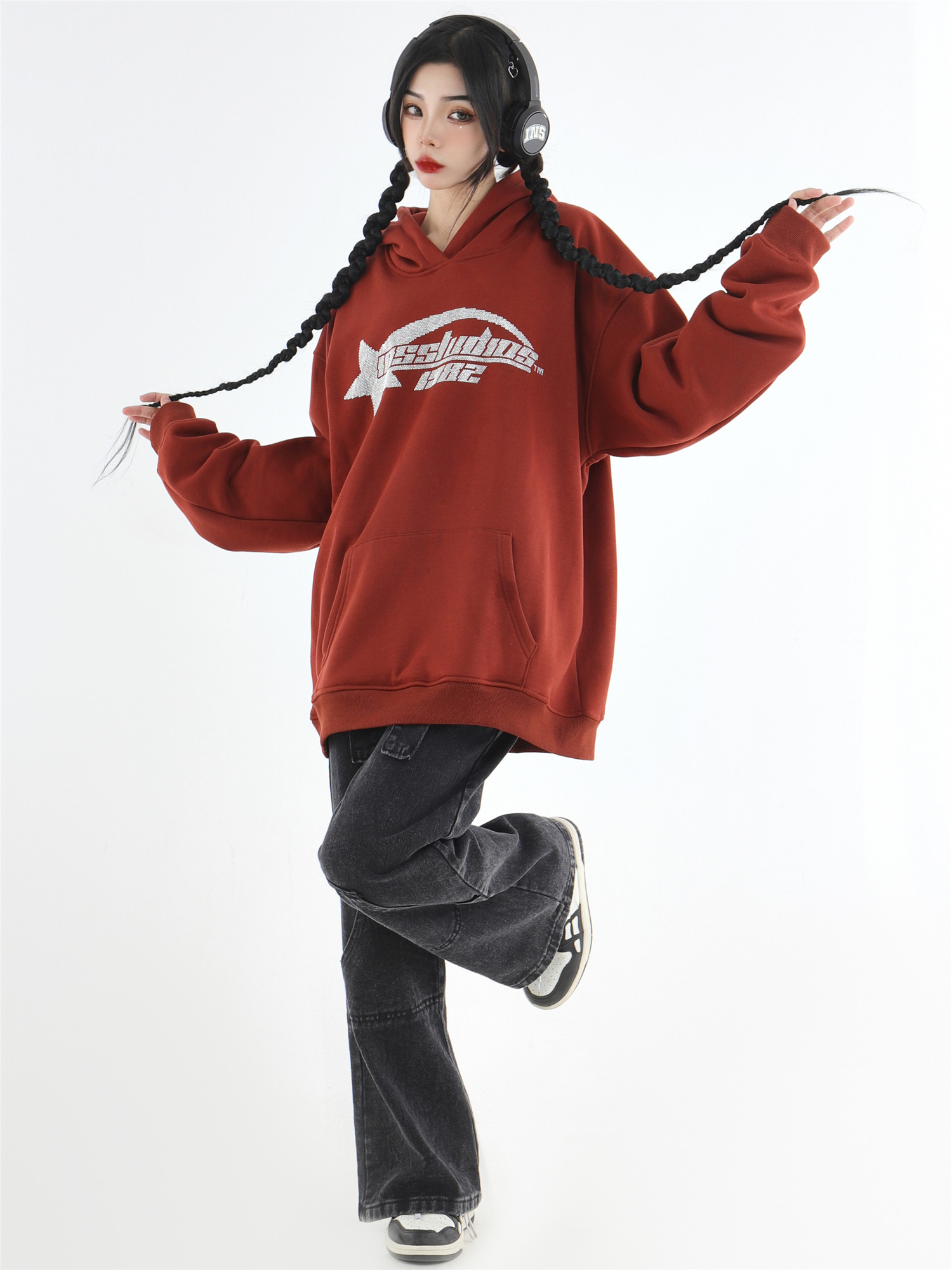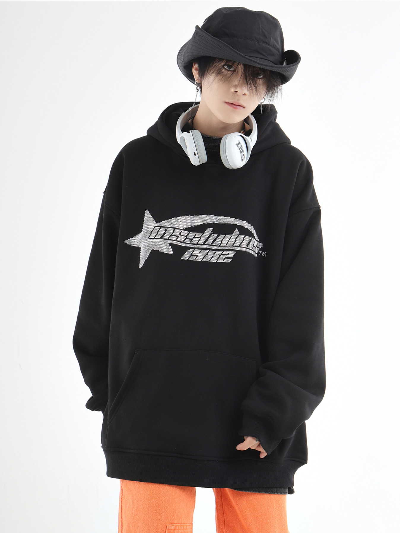 INSstudios 國潮牌情侶美式復古燙鑽星星LOGO衛衣寬鬆加絨連帽衫