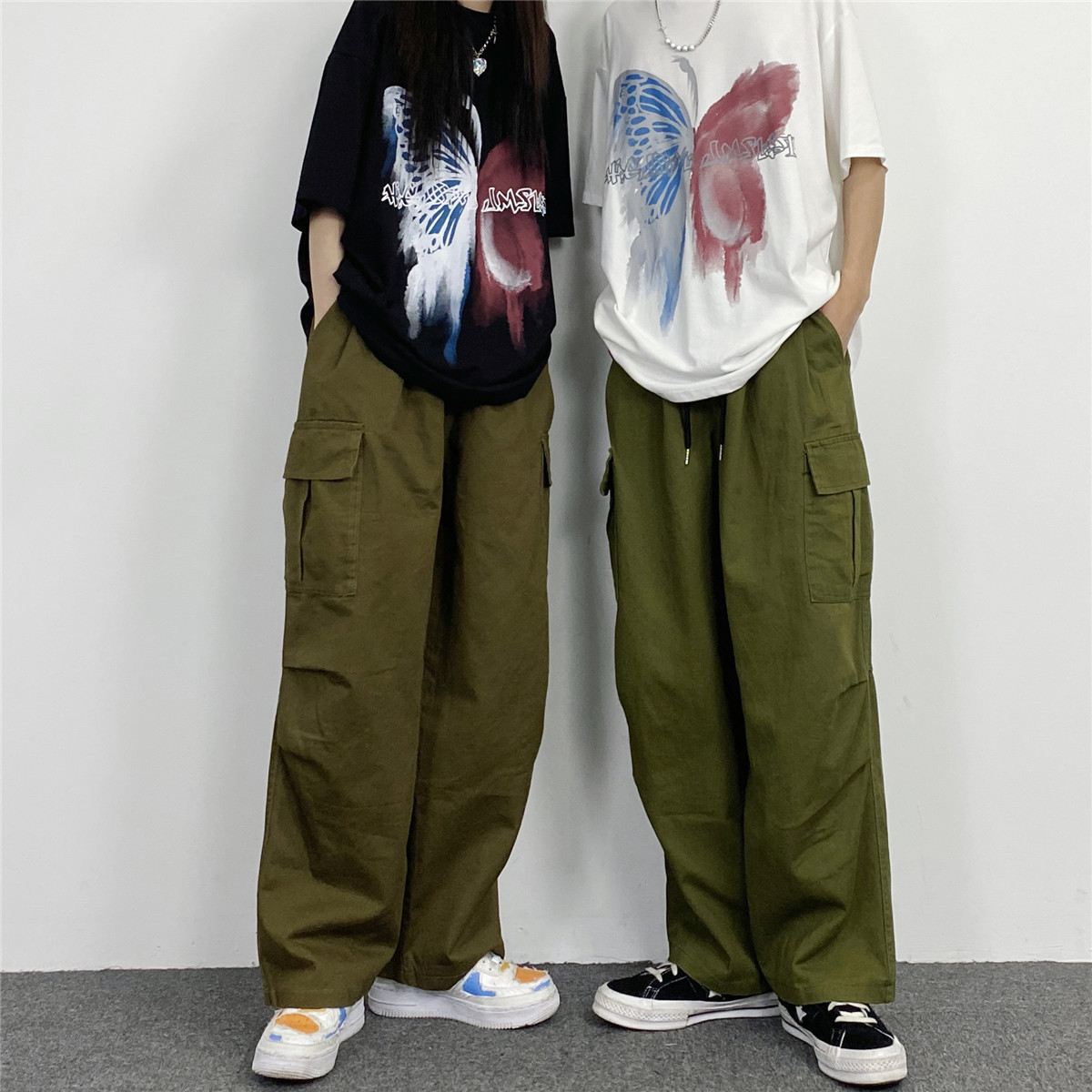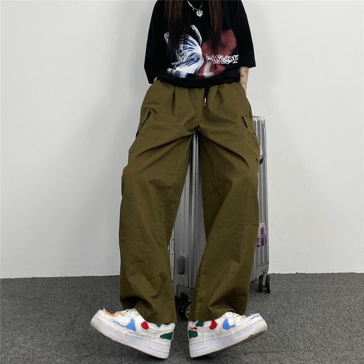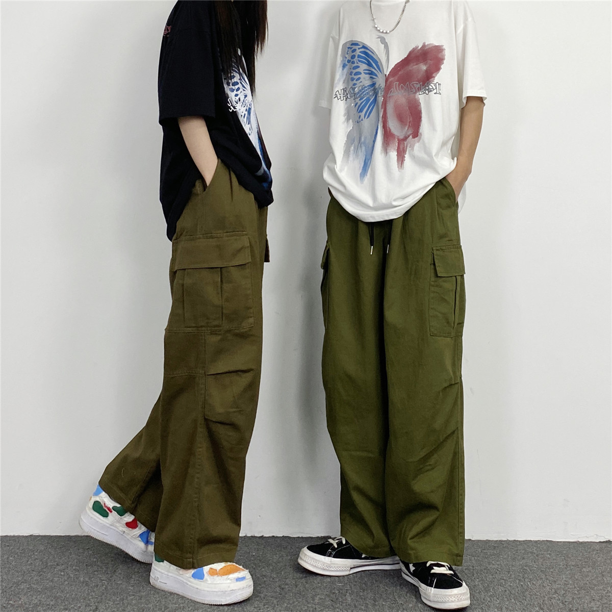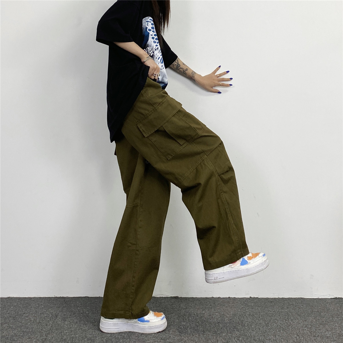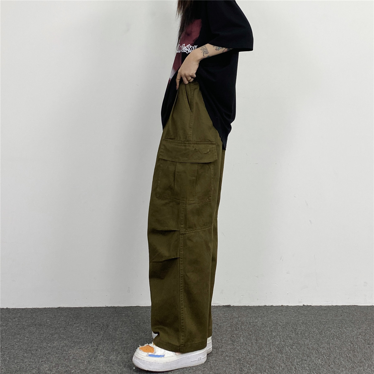 媽個雞媽 韓國ins日系百搭軍綠色闊腿工裝寬鬆直筒休閒褲男女長褲