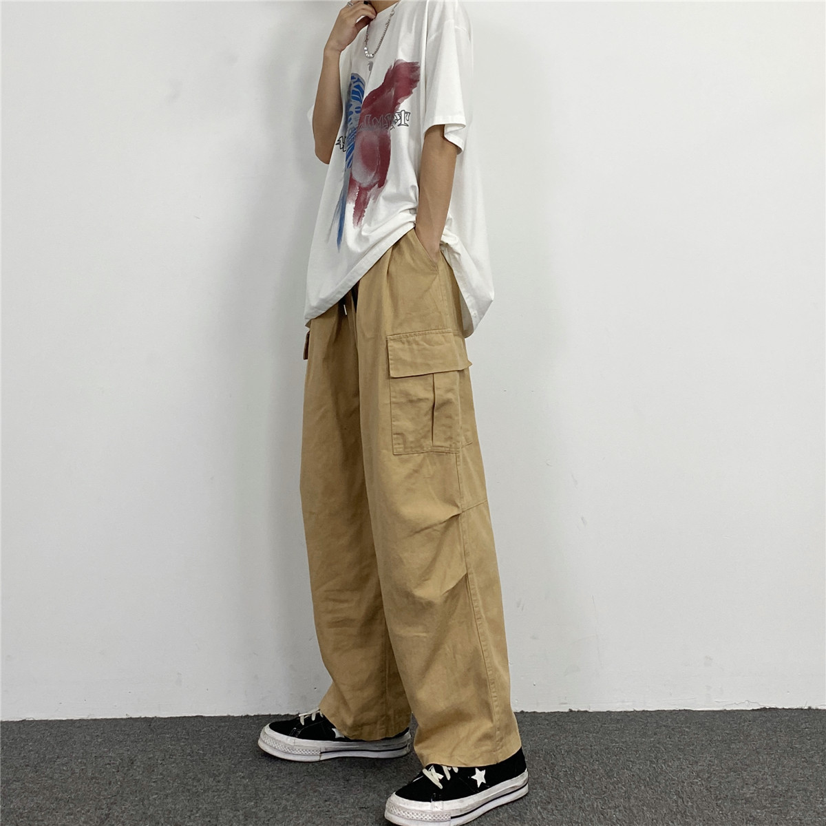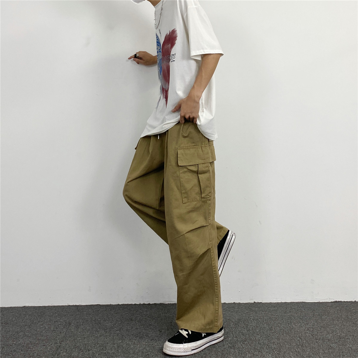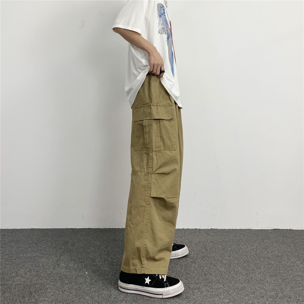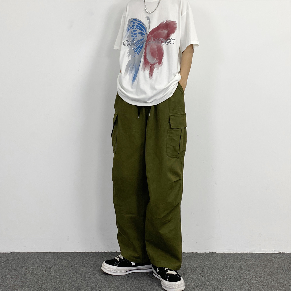 媽個雞媽 韓國ins日系百搭軍綠色闊腿工裝寬鬆直筒休閒褲男女長褲
