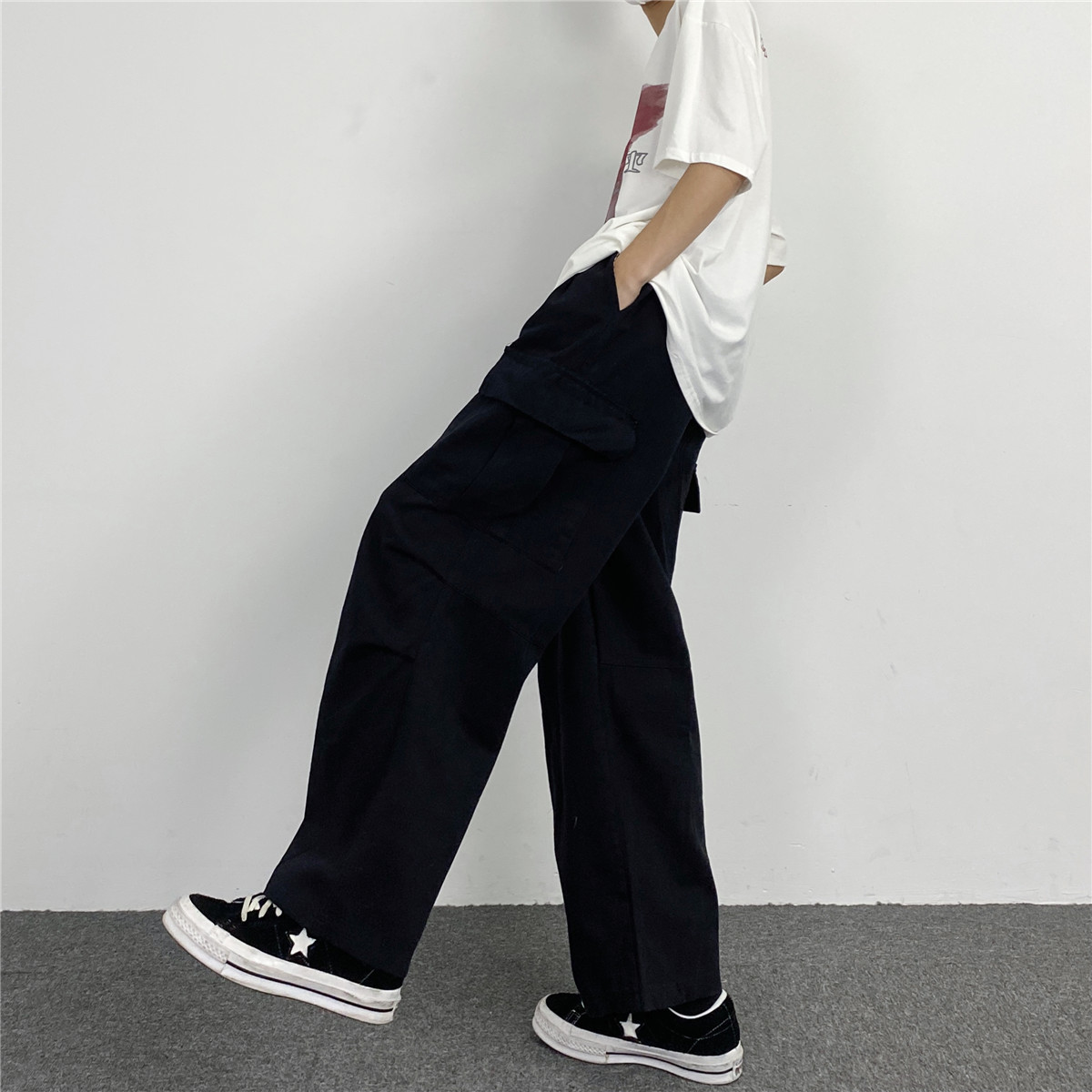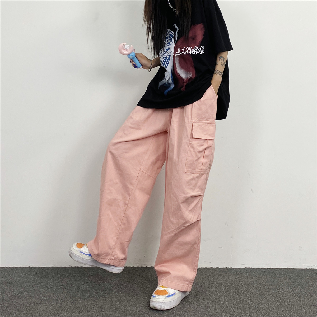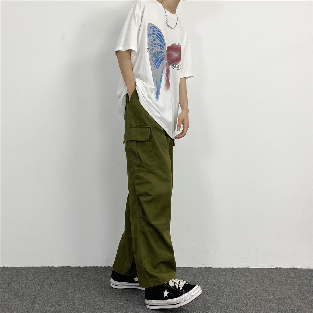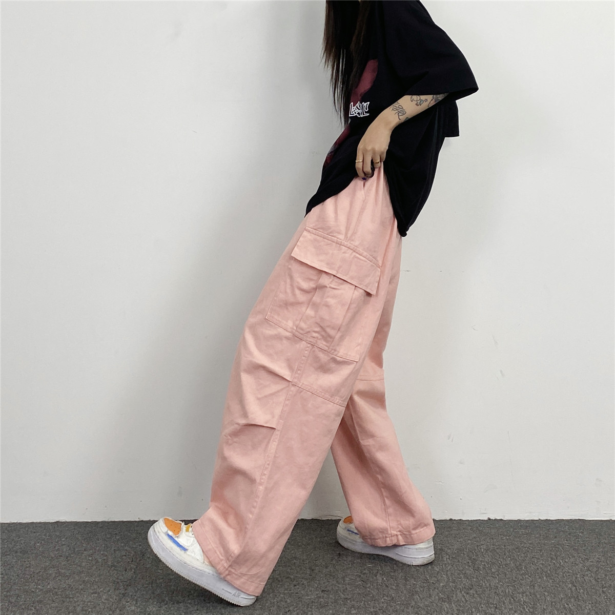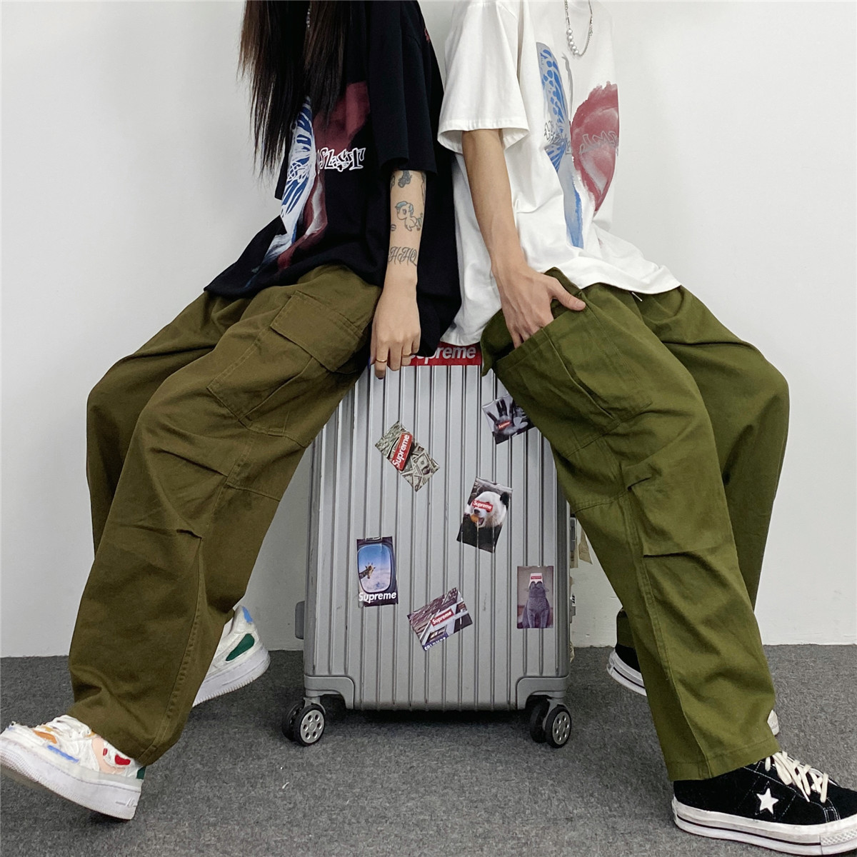 媽個雞媽 韓國ins日系百搭軍綠色闊腿工裝寬鬆直筒休閒褲男女長褲