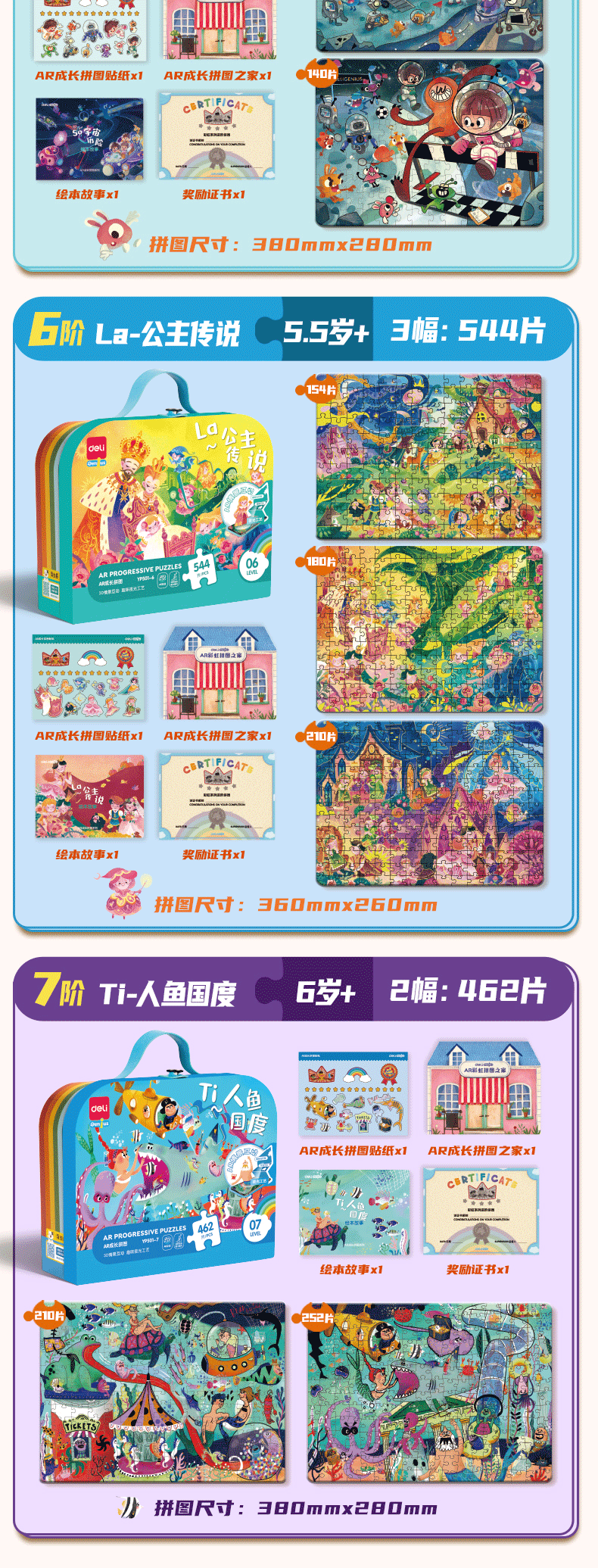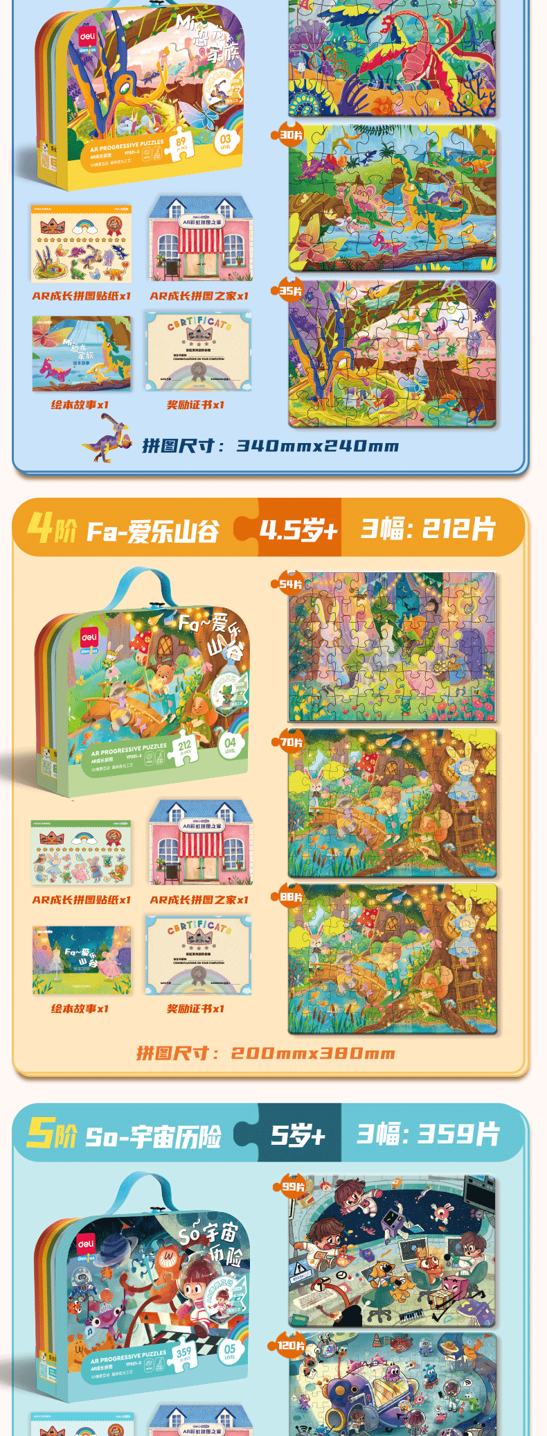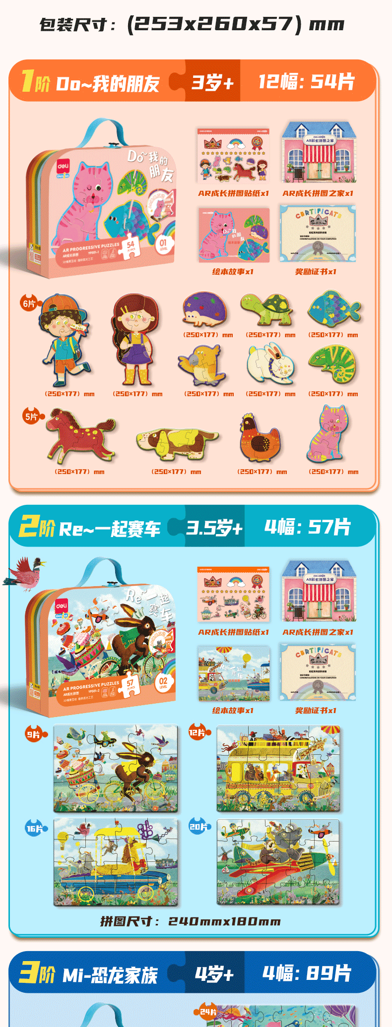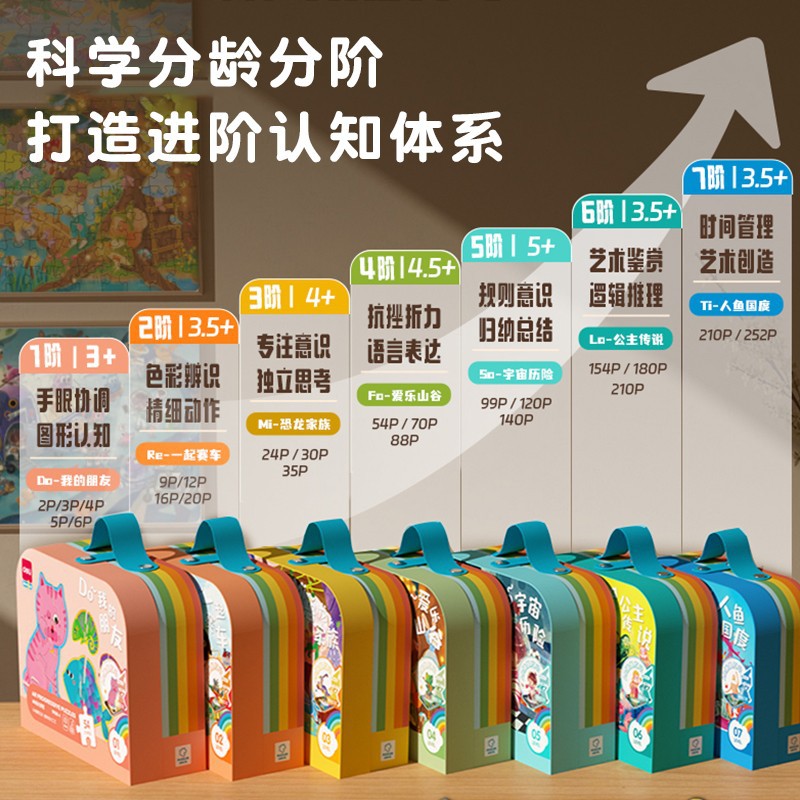 颜色 【1阶】我的朋友(建议3岁+ | 内含12副),【2阶】一起赛车(建议3.5岁+ | 内含4副),【3阶】恐龙家族(建议4岁+ | 内含4副),【4阶】爱乐山谷(建议4.5岁 + |内含3副),【5阶】宇宙历险(建议5岁 + |内含3副),【6阶】公主传说(建议5.5岁 + |内含3副)