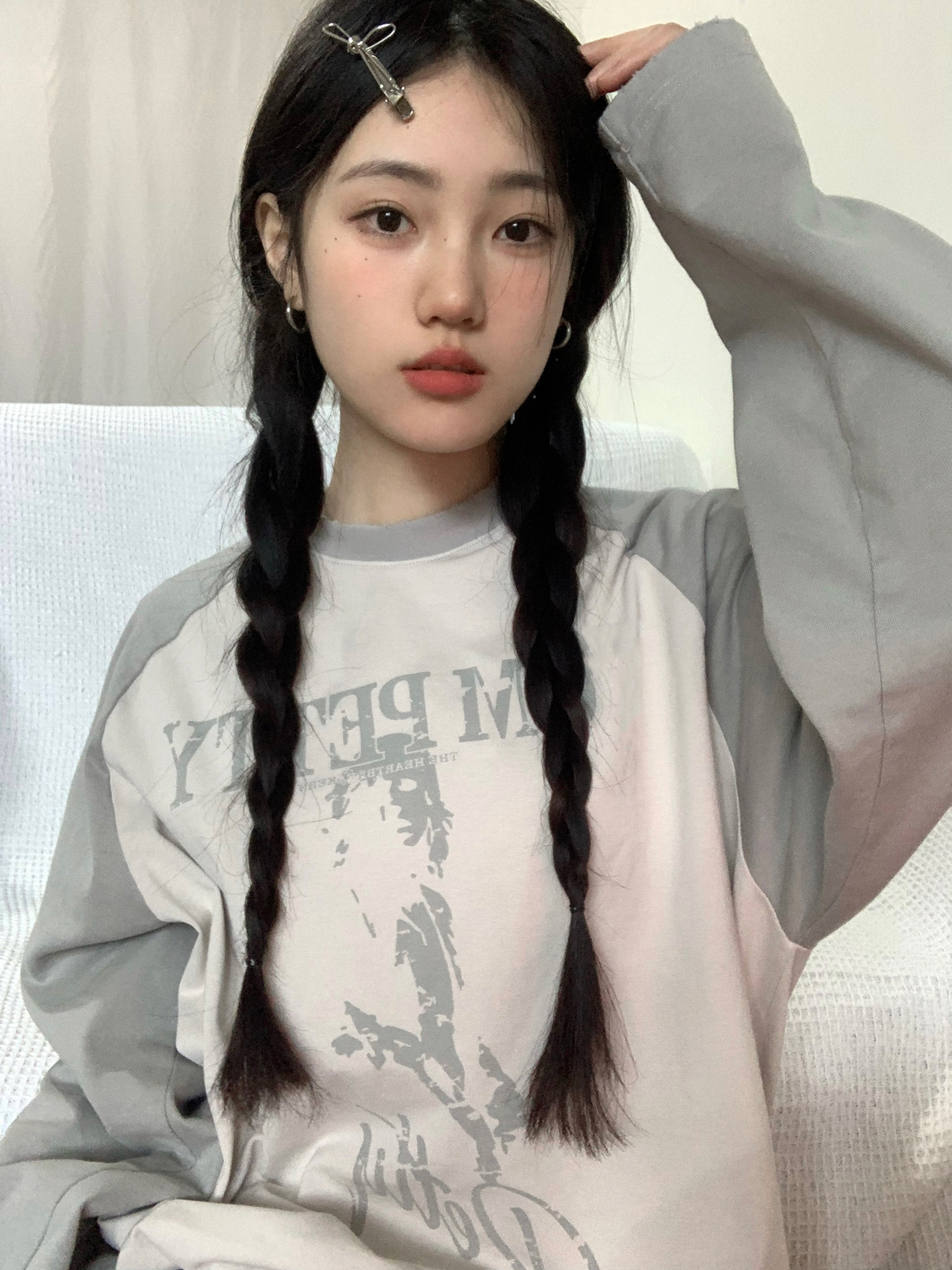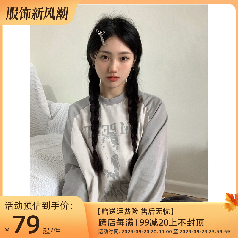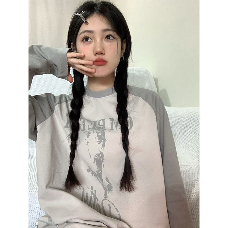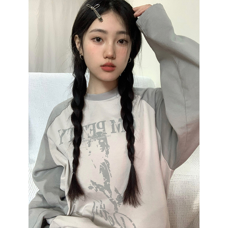 美式復古插肩袖衛衣女秋季新款撞色拼接長袖T恤oversize圓領上衣
