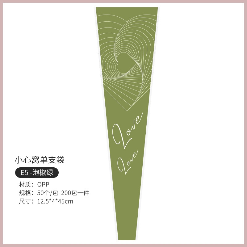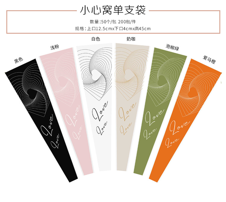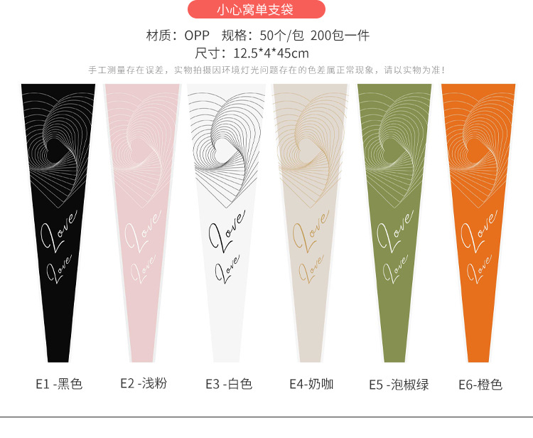 颜色 E1 心窝单支-黑色,E2 心窝单支-浅粉,E3 心窝单支-白色,E4 心窝单支-奶咖,E5 心窝单支-泡椒绿,E6 心窝单支-橙色,F1 郁金香单支-黑色,F2 郁金香单支-白色,F3 郁金香单支-碎冰蓝,F4 郁金香单支-轻玫粉,F5 郁金香单支-橘褐色